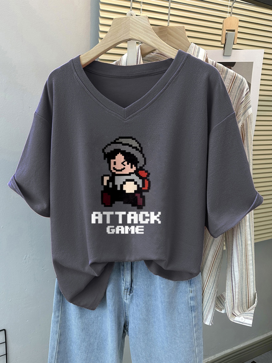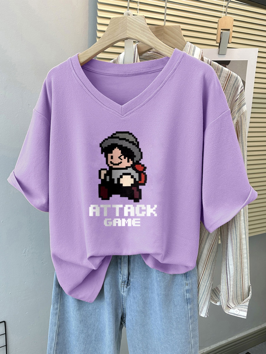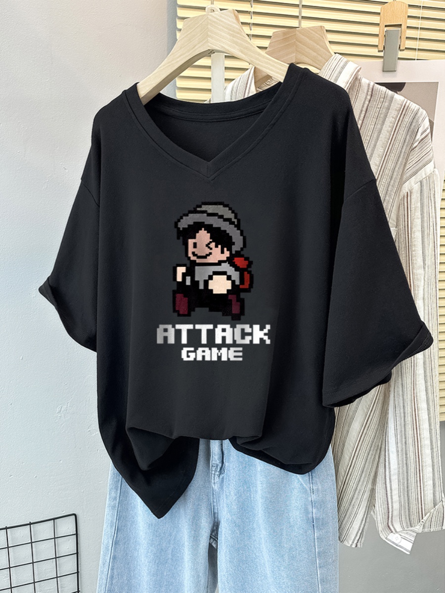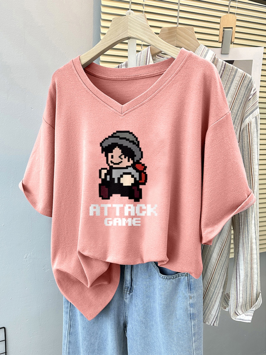 100.00kg Plus Size Ladies Plus Size Short Sleeve Cotton V-neck T-shirt Female 2025 Summer New Arrival American Retro Loose Top Wear