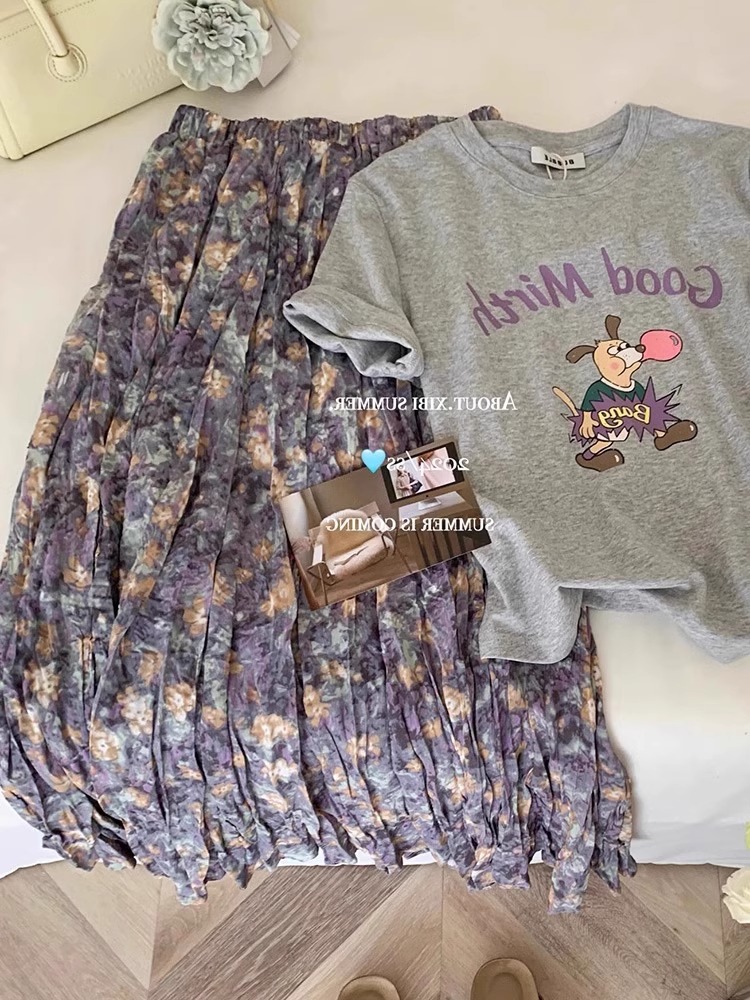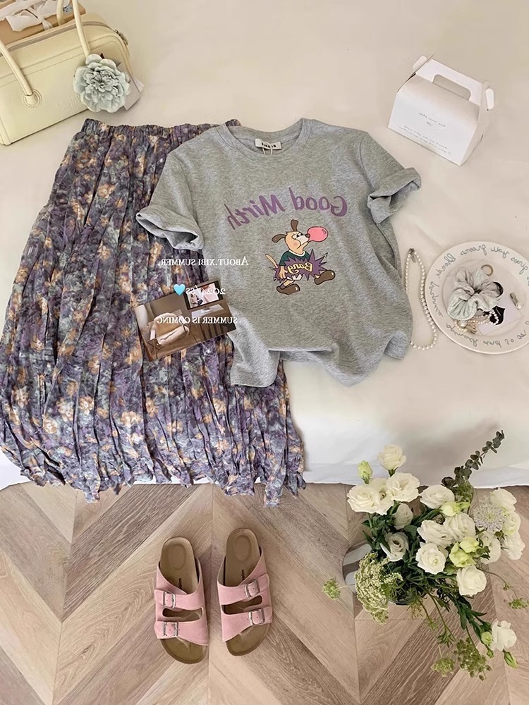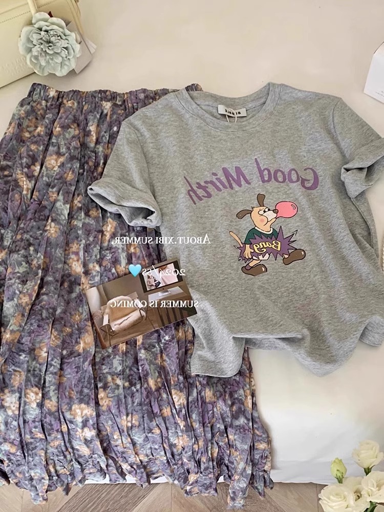 2025 New Arrival American Retro Cartoon Print Gray Short Sleeve T-Shirt Female Summer Korean Style Shoulder Width Loose Slim Looking Tops