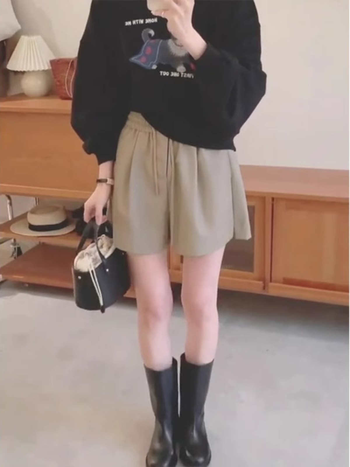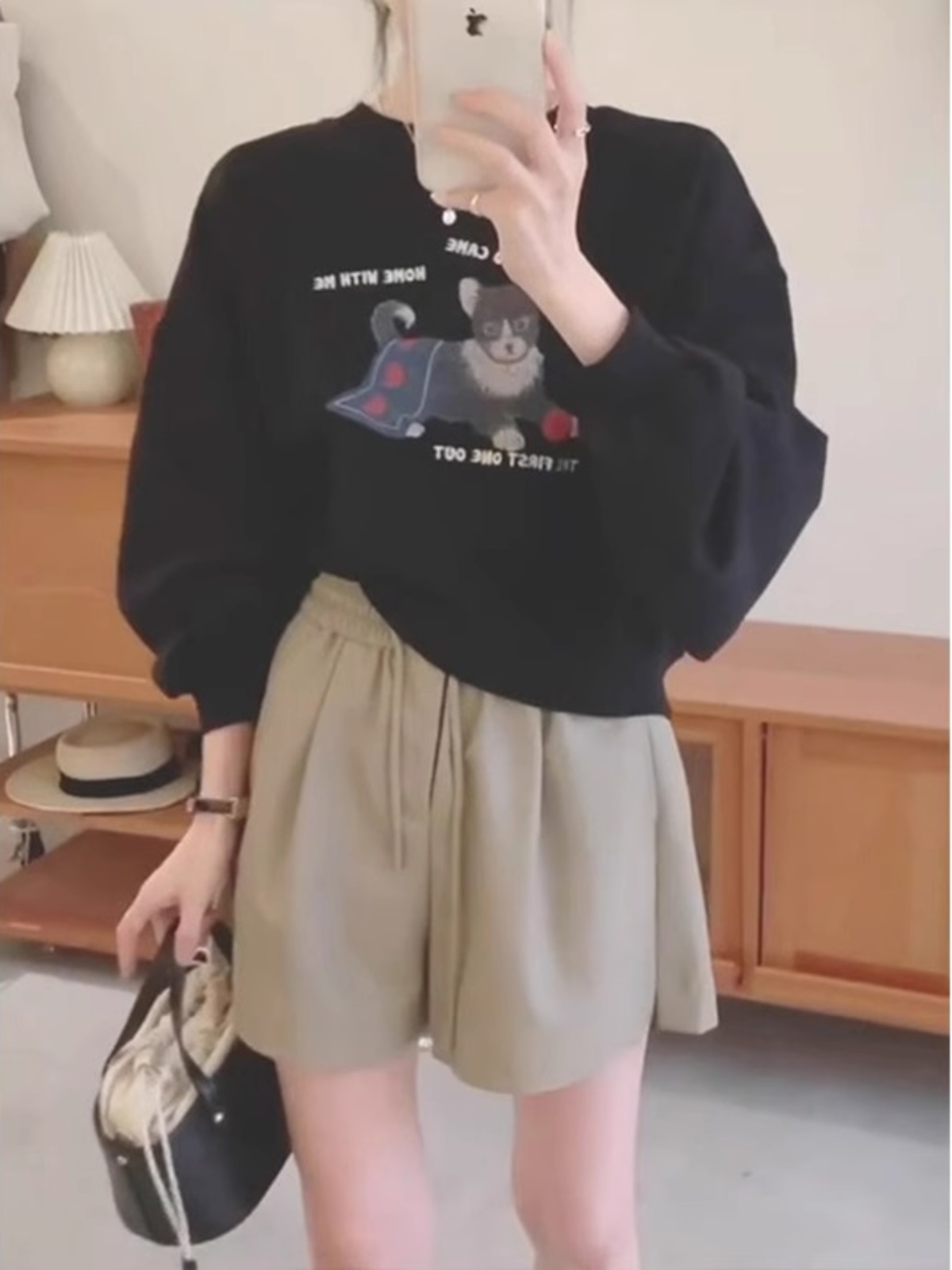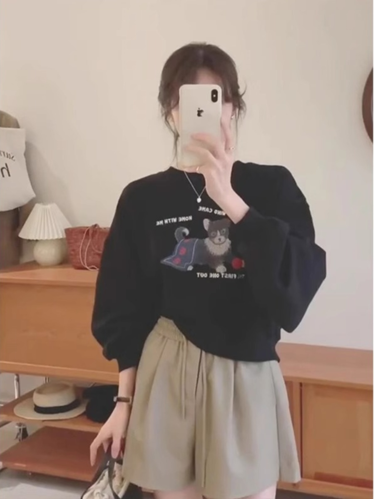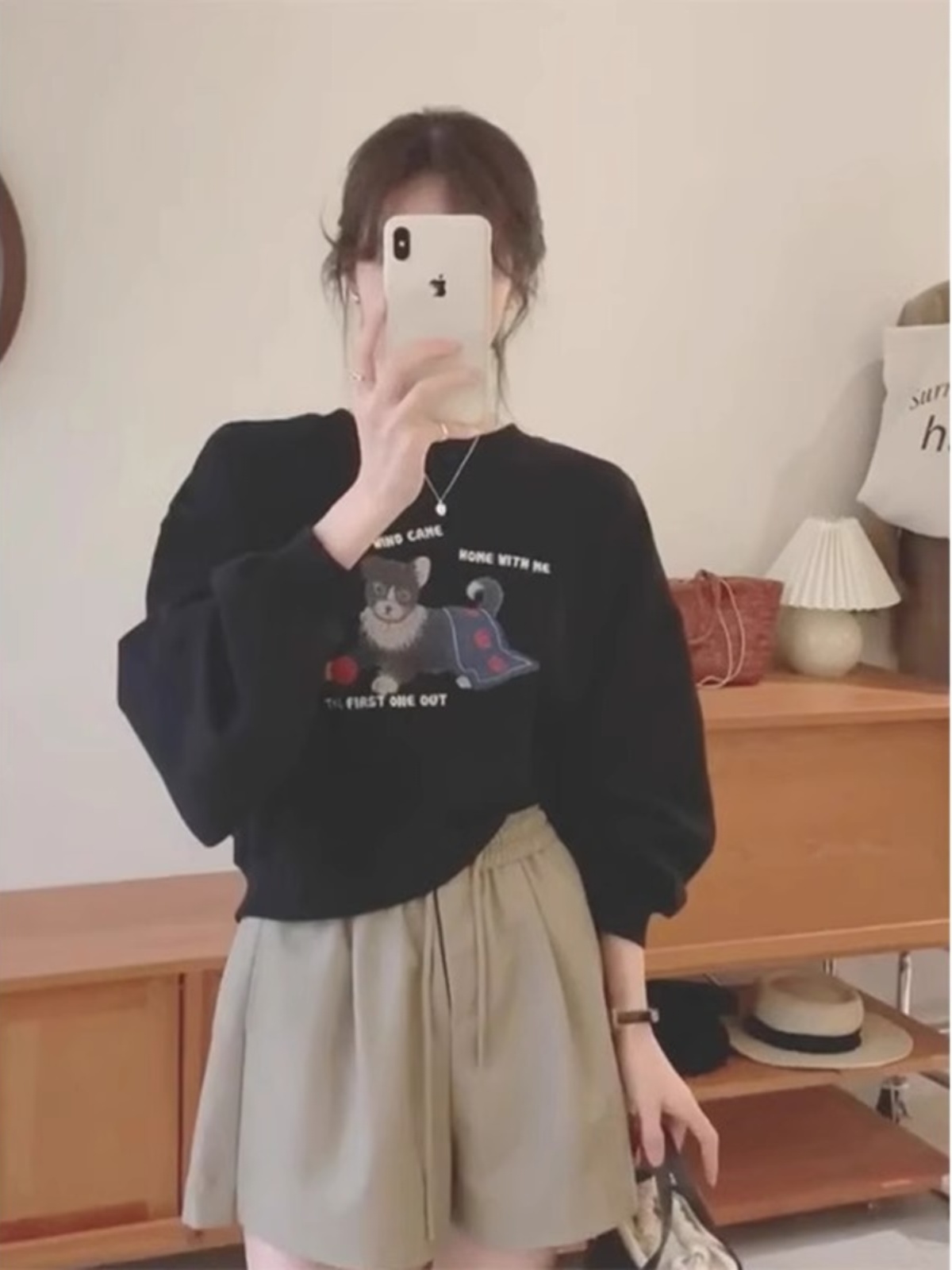2025 New Arrival American Retro Small round Neck Loose Puppy Printed Trendy Black, Hoodie Women's Spring & Fall Thin