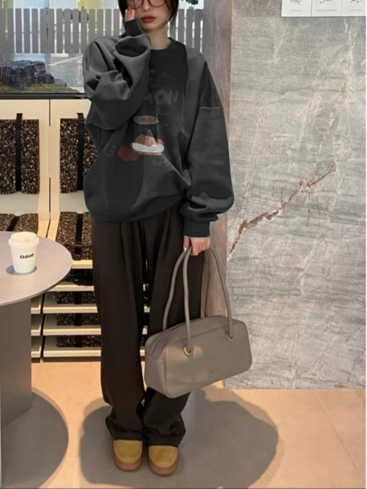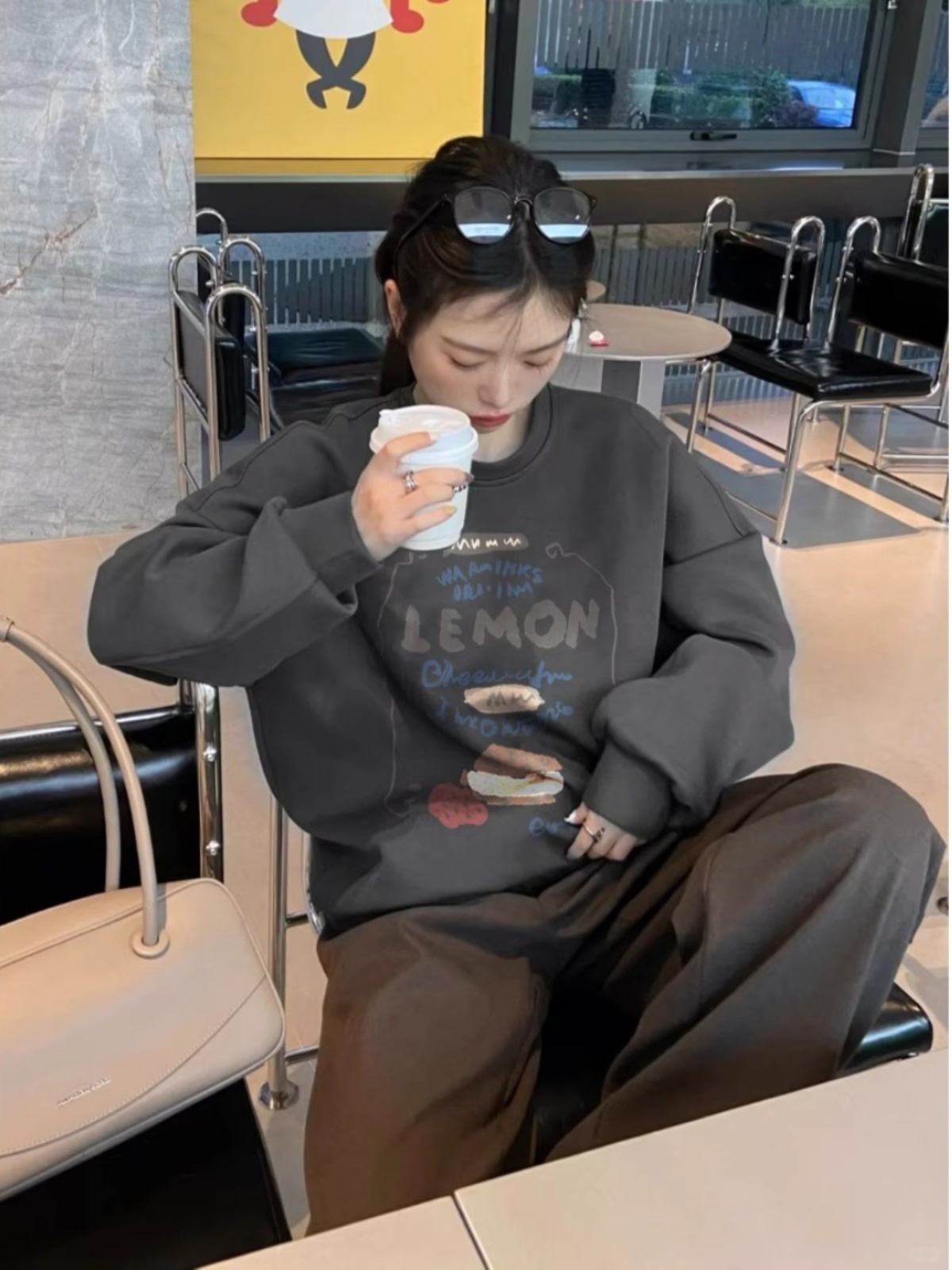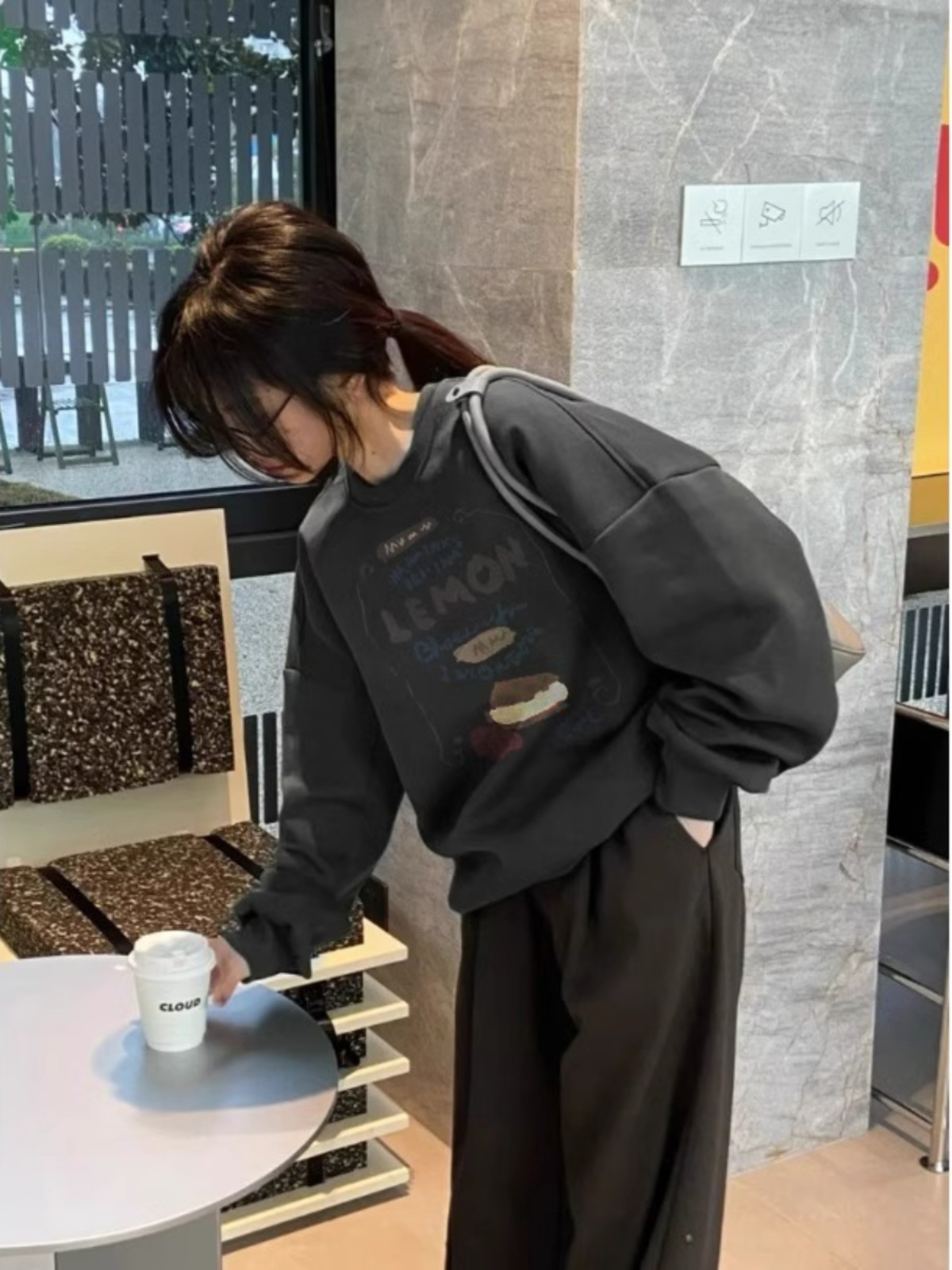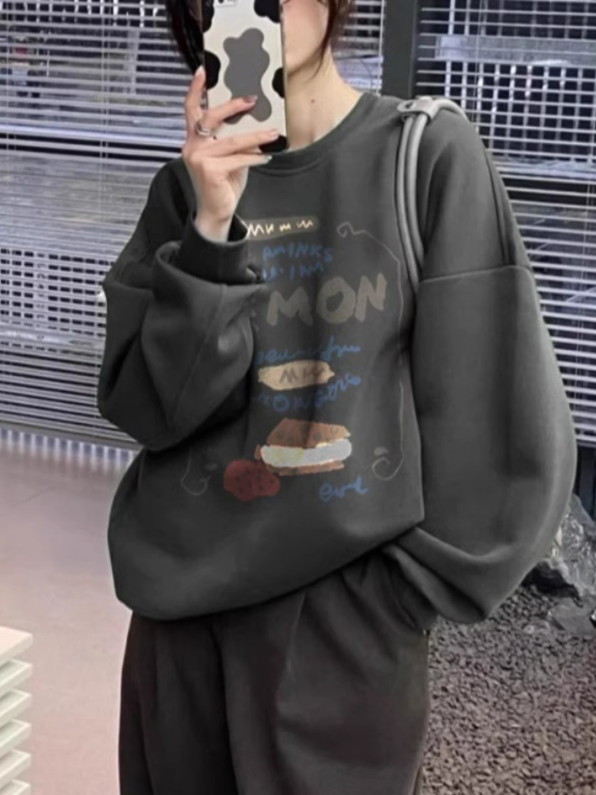 2025 New Arrival Spring Dark Gray Fleece-lined Thickened All-Matching Tops Letter Print Loose round Neck Long Sleeves Sweatshirt Women