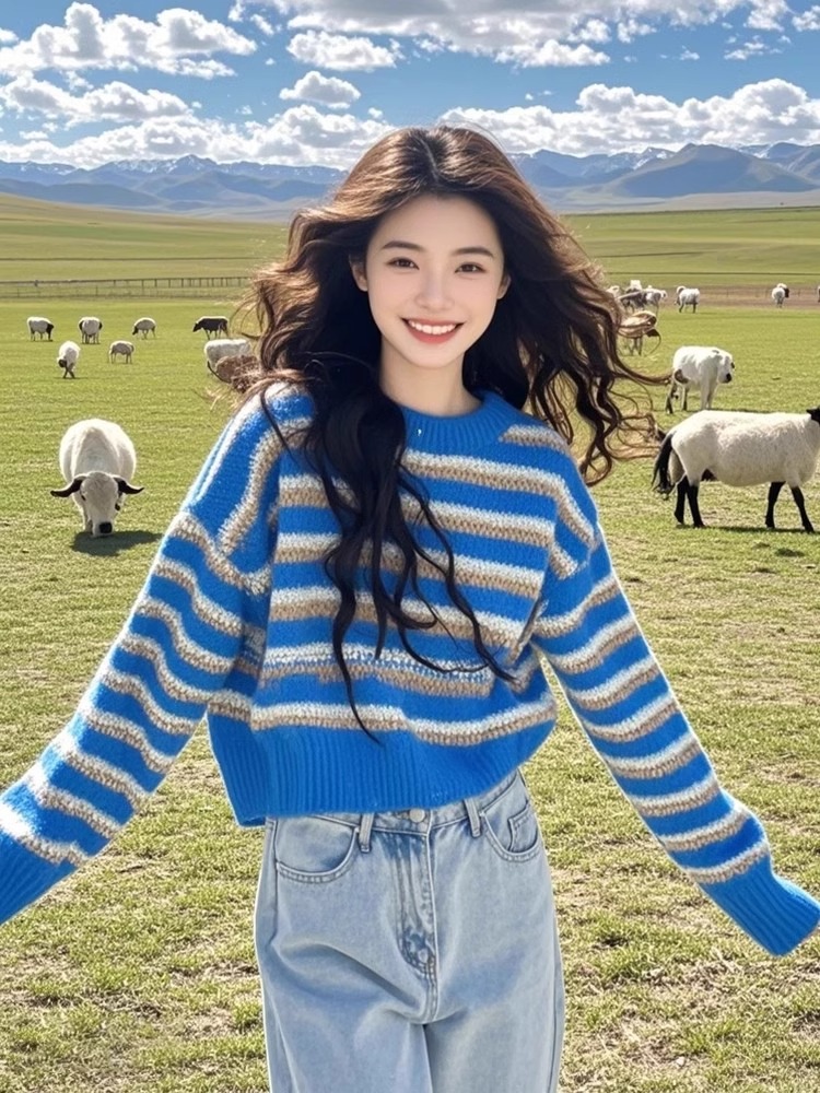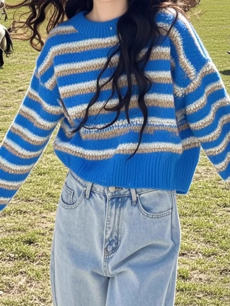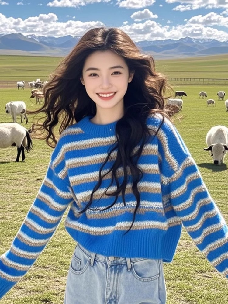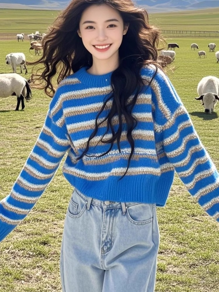 2025 New Arrival Spring & Fall Idle Style Wear French Inner Bottoming Shirt Blue Stripes Sweater Knitwear Women's Top
