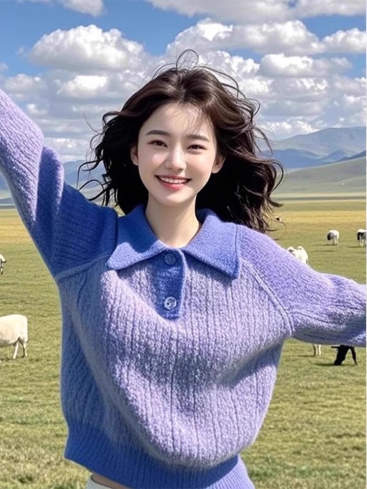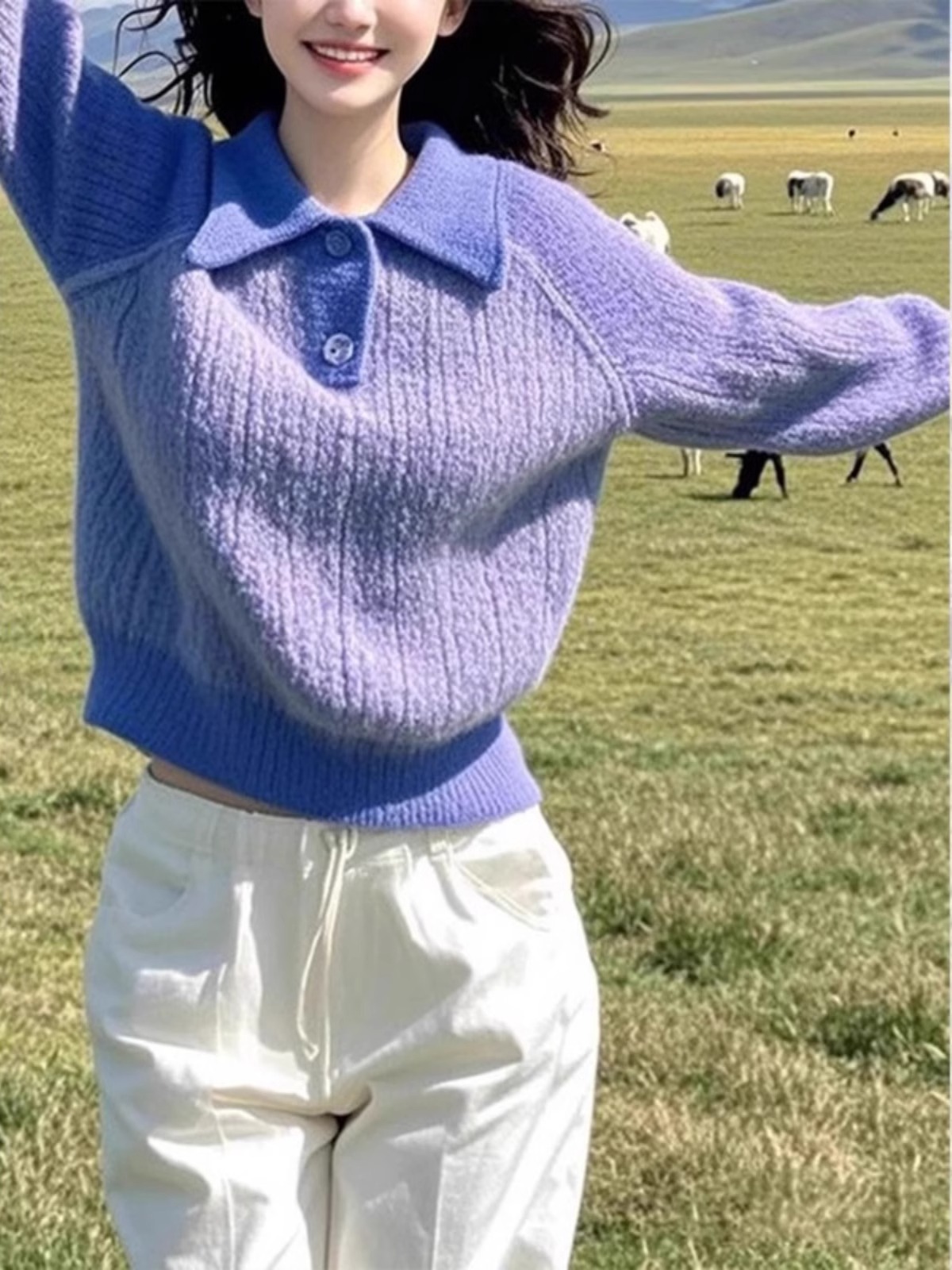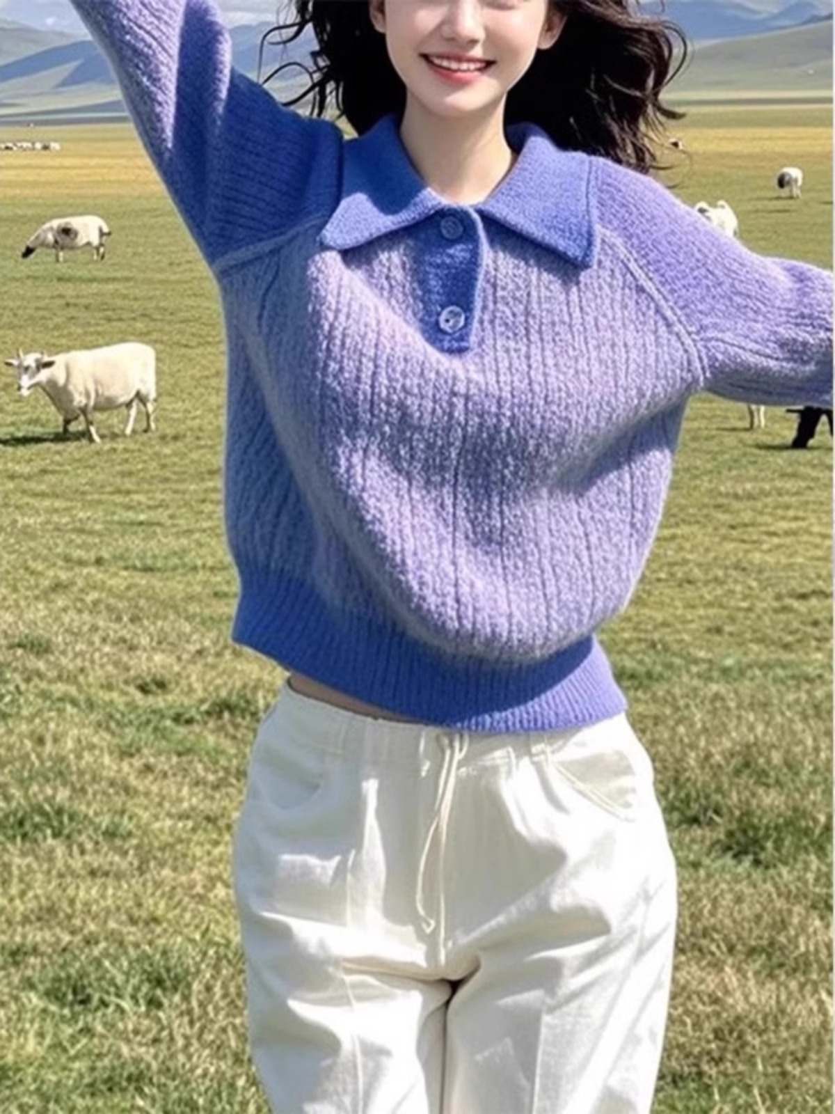 2025 New Polo Collar Purple Knit Sweater Women Early Spring Fashion Loose Western Style Age-Reducing Bottoming Shirt