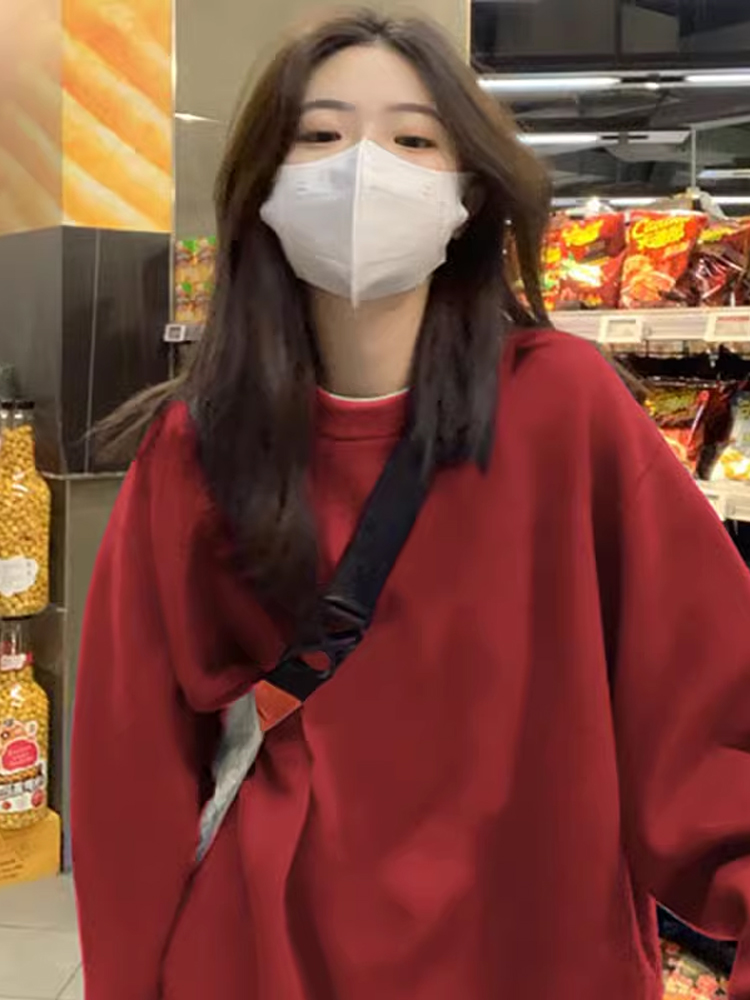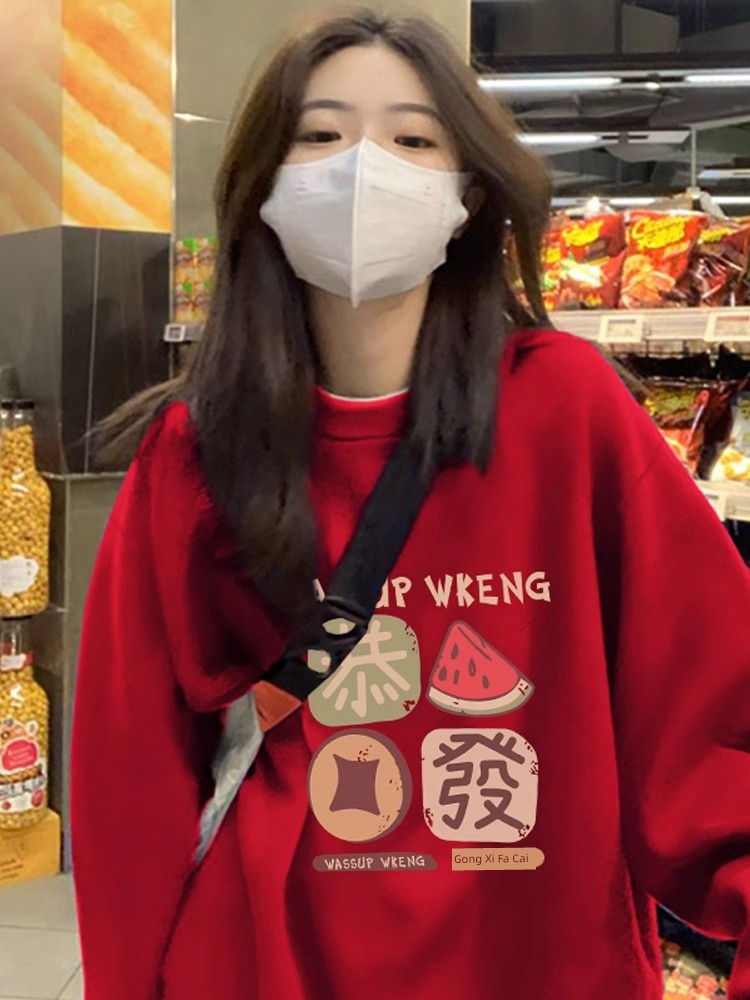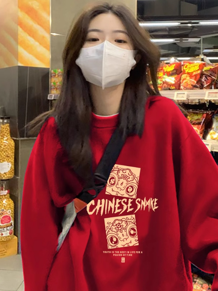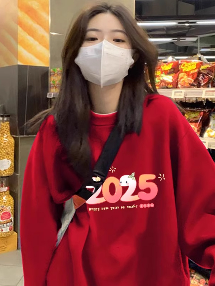 2025 Snake Year Fall and Winter Birth Year New Arrival Fleece-lined Thickened Red Loose Sweater Female Plus Size Hooded Coat Top