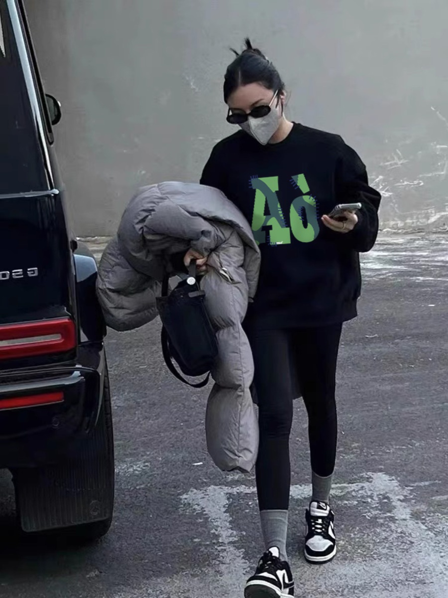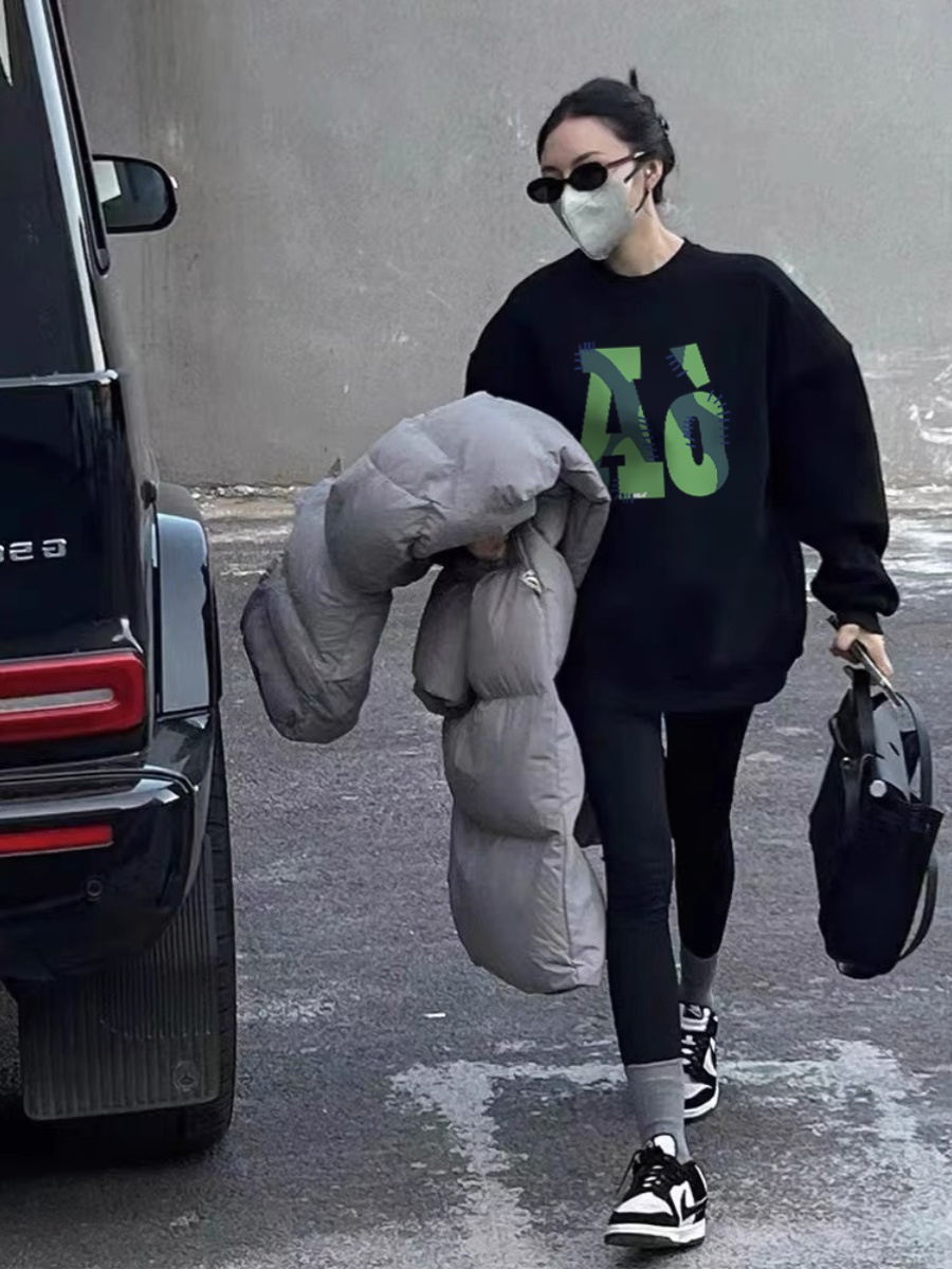 2025 Spring and Autumn New round Neck Pullover Black Thin Sweatshirt Female Loose Easiest for Match Fleece-Lined Fashionable Jacket