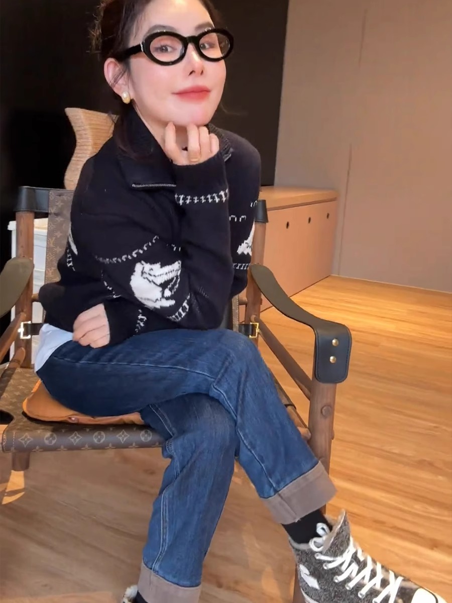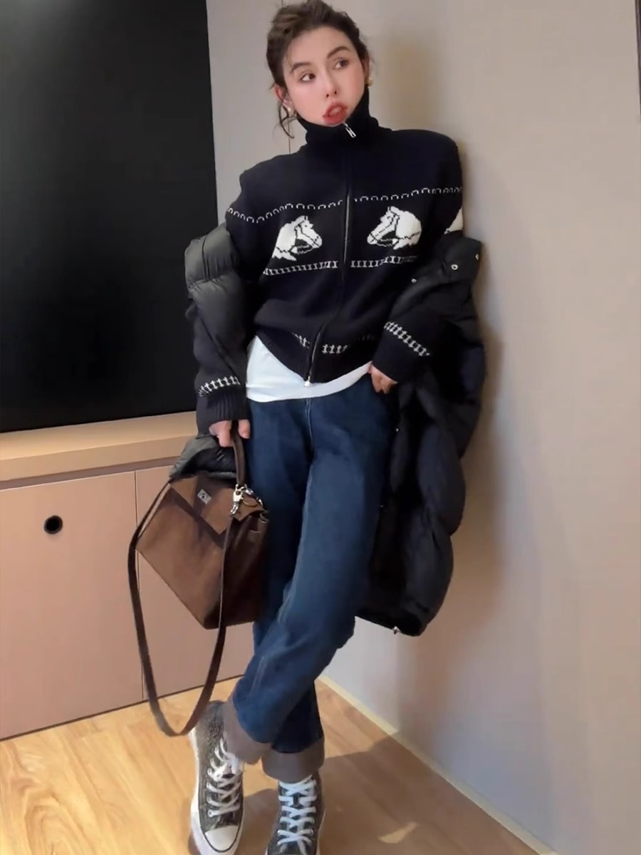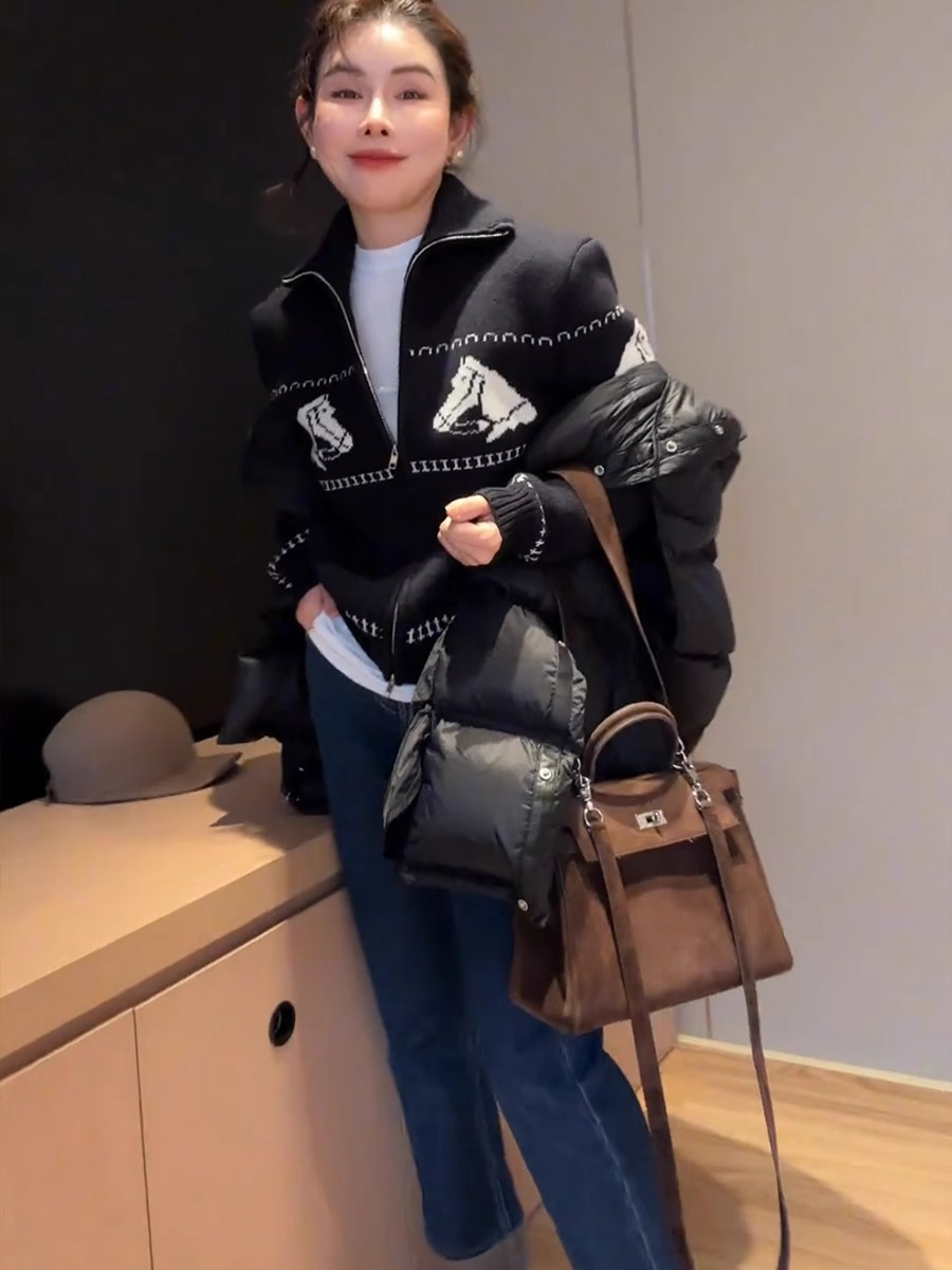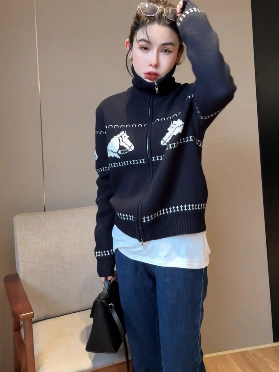 2025 Spring & Fall New Arrival K-style Temperamental Minority Jacquard Stand Collar Zipper Knitting Sweater Western Style Chic Outwear Women