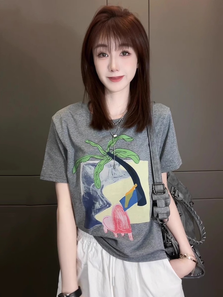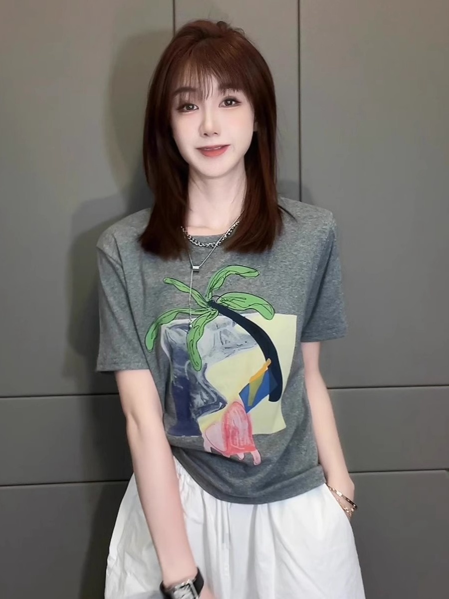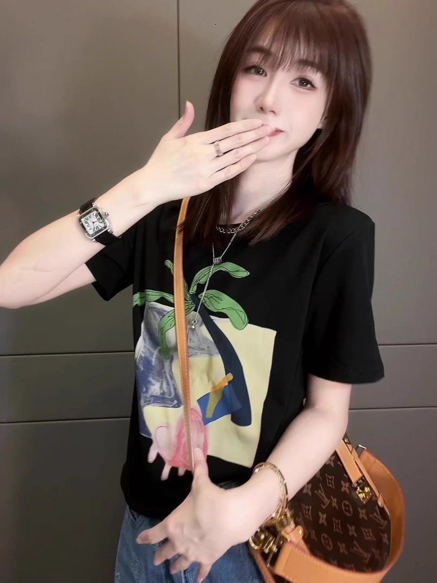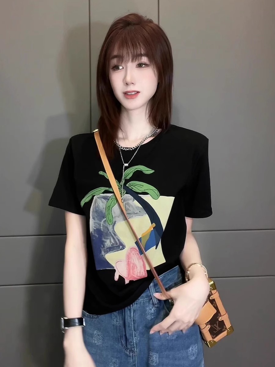 2025 Summer New Arrival K-style Cartoon Print Shoulder Short Sleeve T-shirt Female Silm Slimming and Fashionable Casual Ins Tops