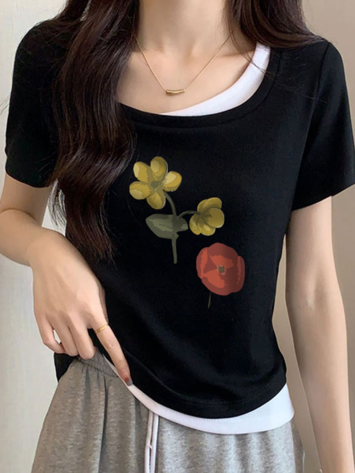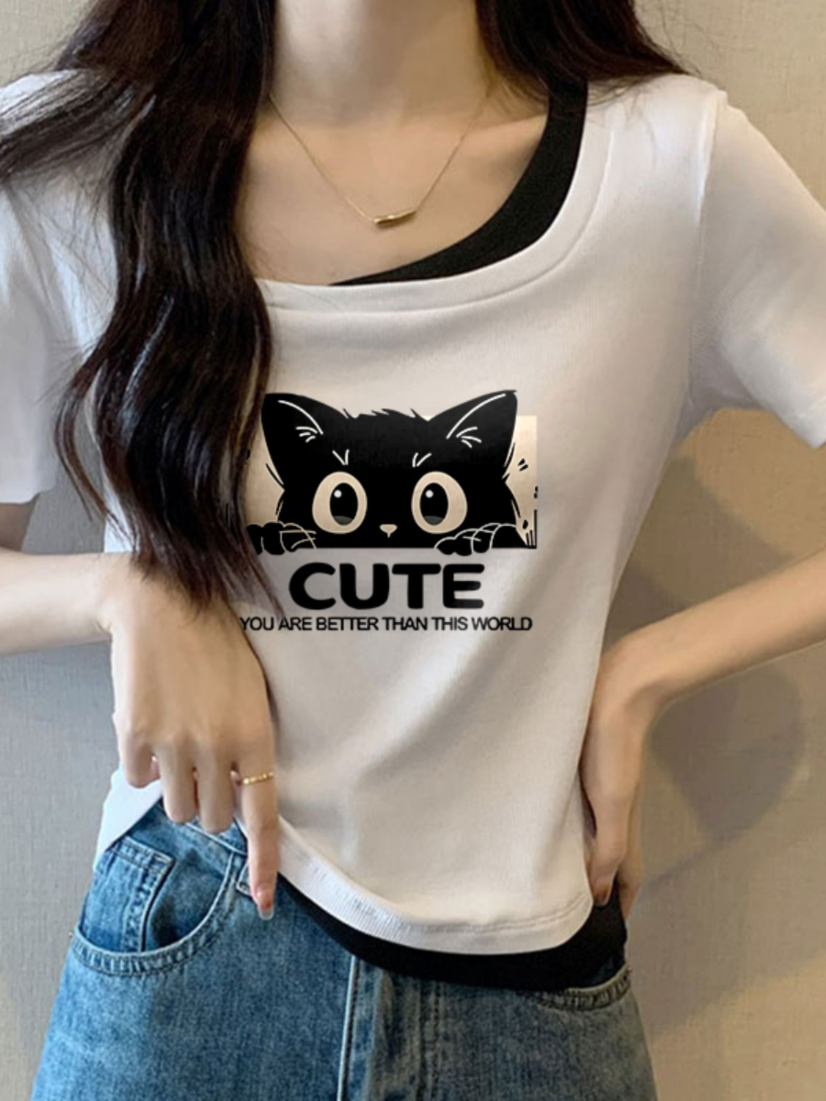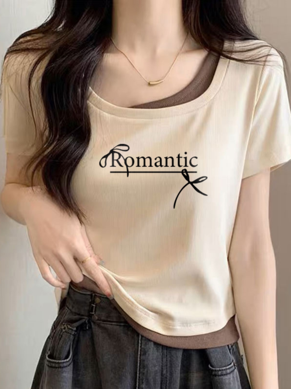 2025 Summer New Arrival Short Fake Two-Piece Silm Shoulder T-shirt Female Color Stylish Niche Style Plus Size Oversized Girls' Top