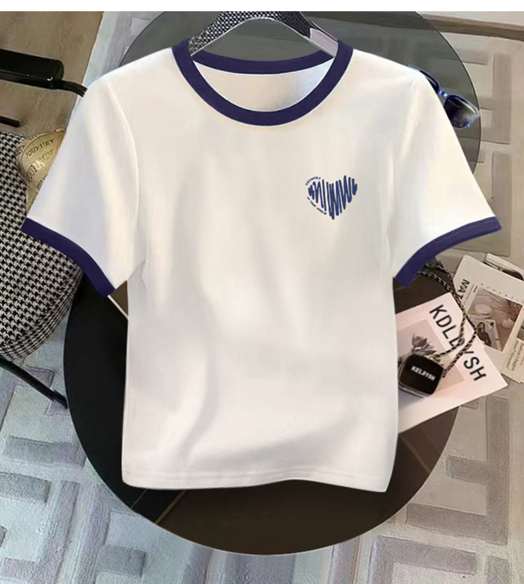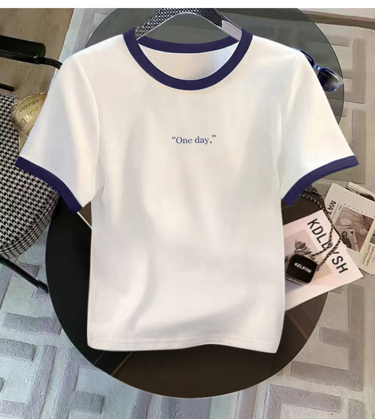 2025 Summer New Arrival Shoulder Width Loose Slimming Cotton T-shirt Female Casual Easiest for Match round Neck Contrast Color Short Sleeve Tops Ins