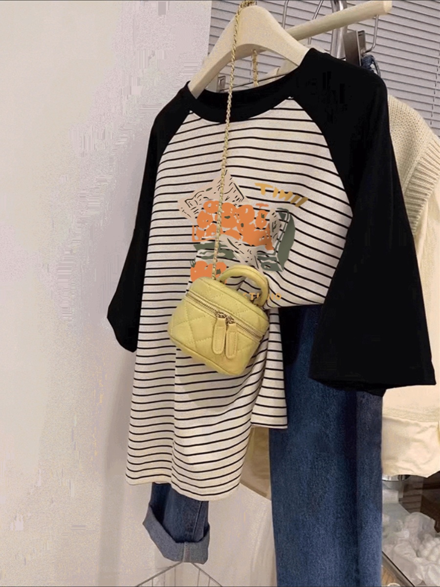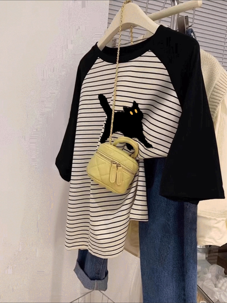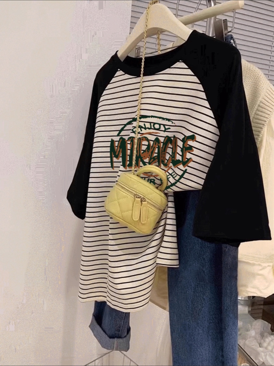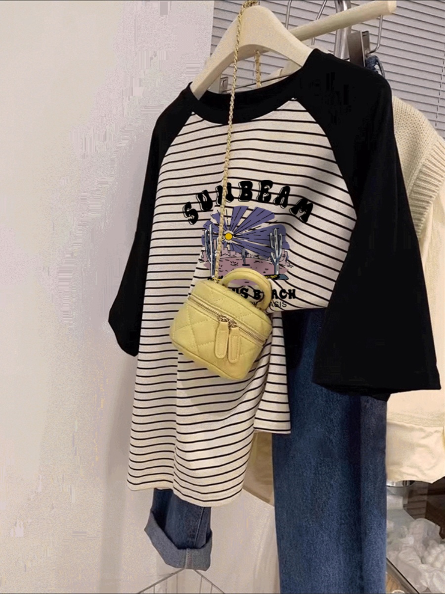 2025 Summer New Arrival Stripes Pure Cotton round Neck Short Sleeve T-Shirt Women's Easiest for Match Loose Western Style Plus Size Tops Bottoming Shirt