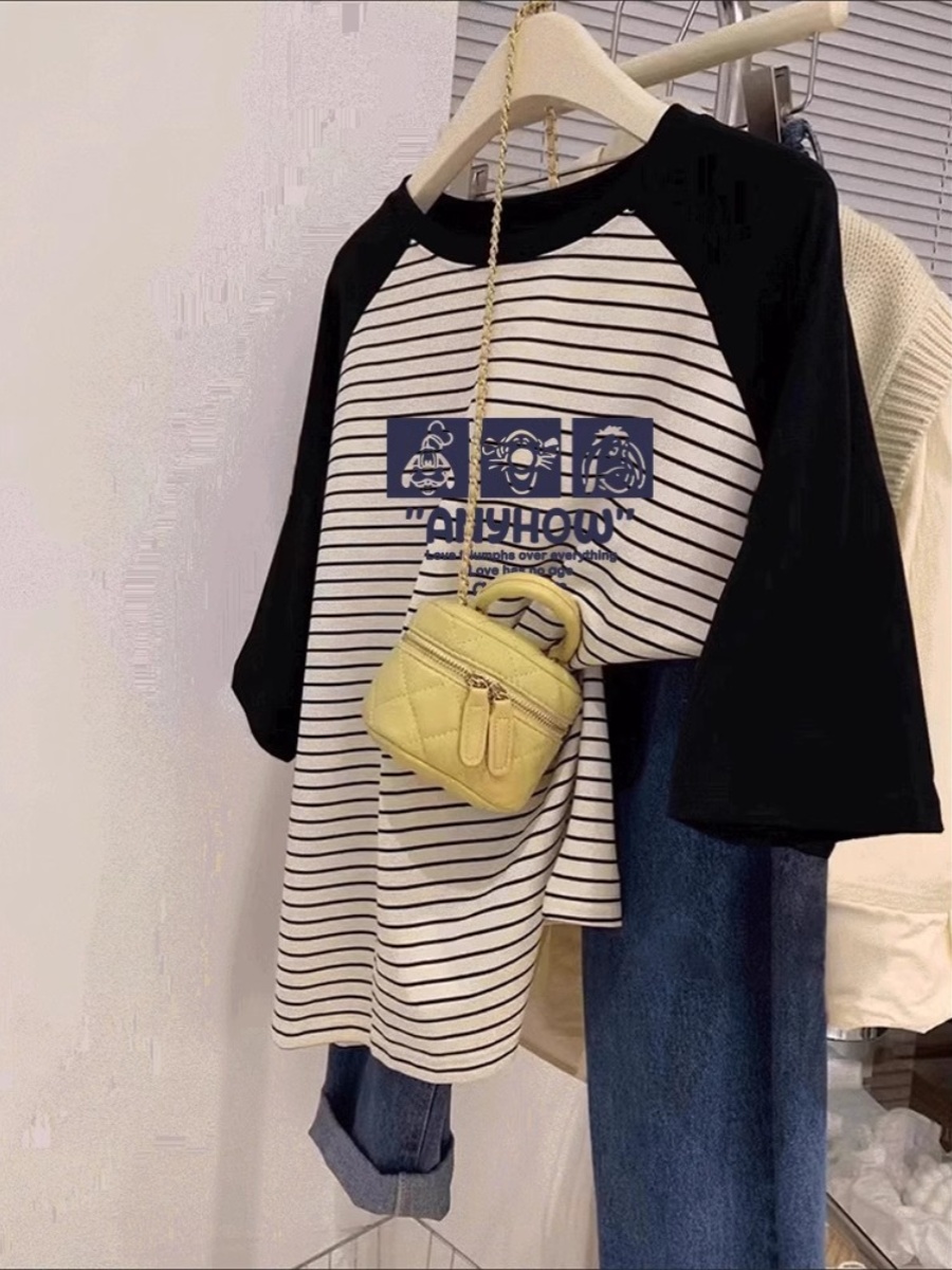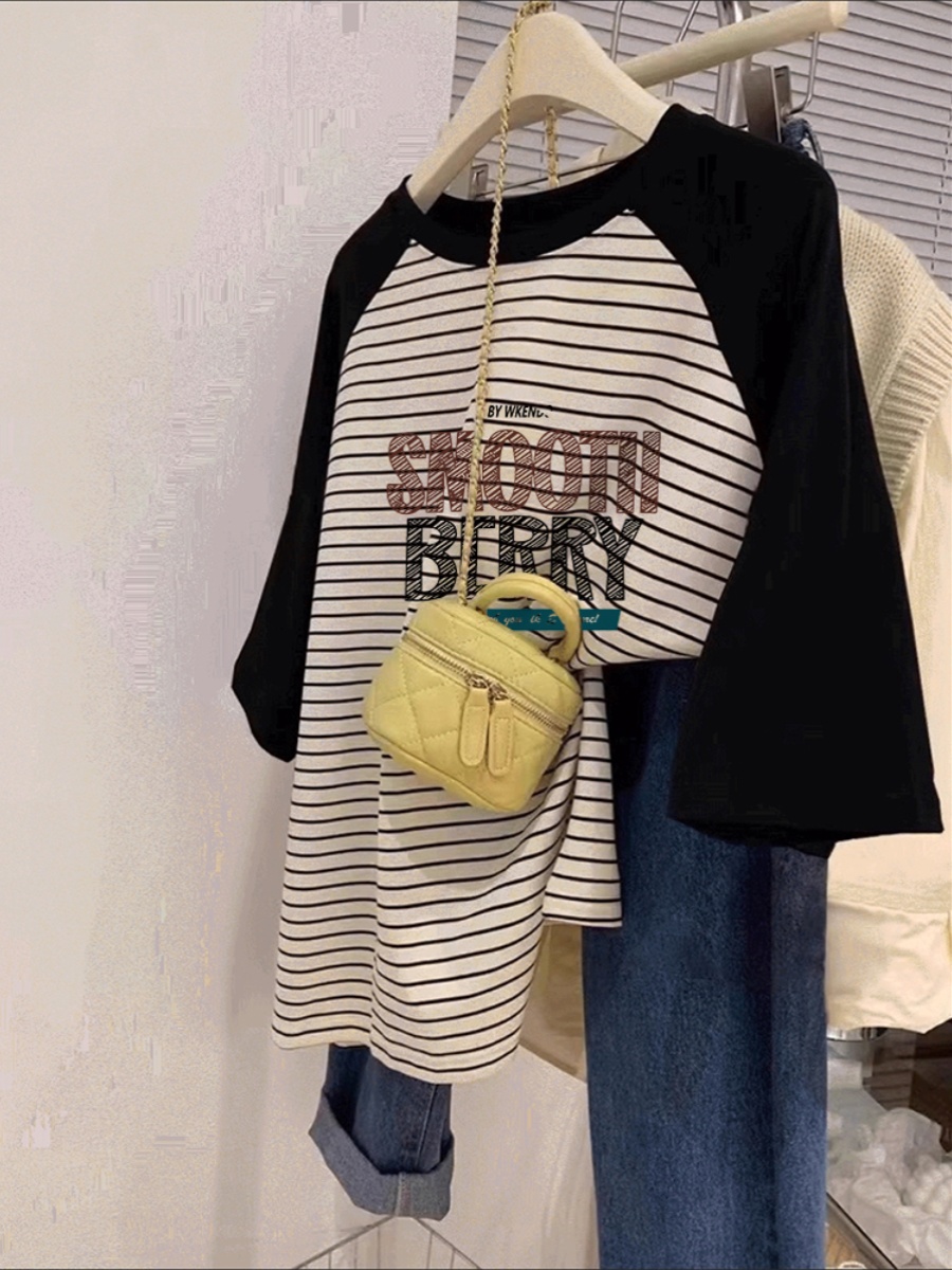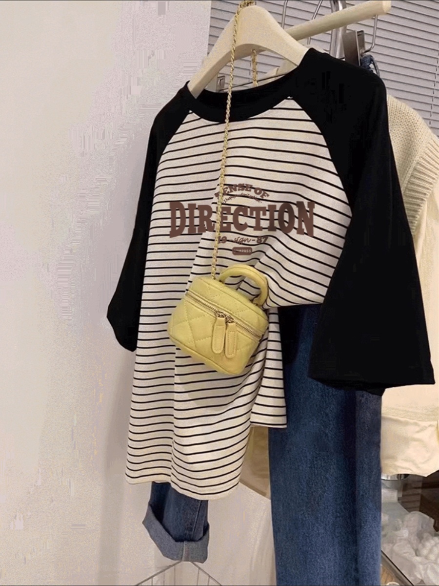 2025 Summer New Arrival Stripes Short Sleeve T-shirt Women's Design Niche Style Raglan Sleeve Hong Kong Style Chic Plus Size Oversized Girls' Top