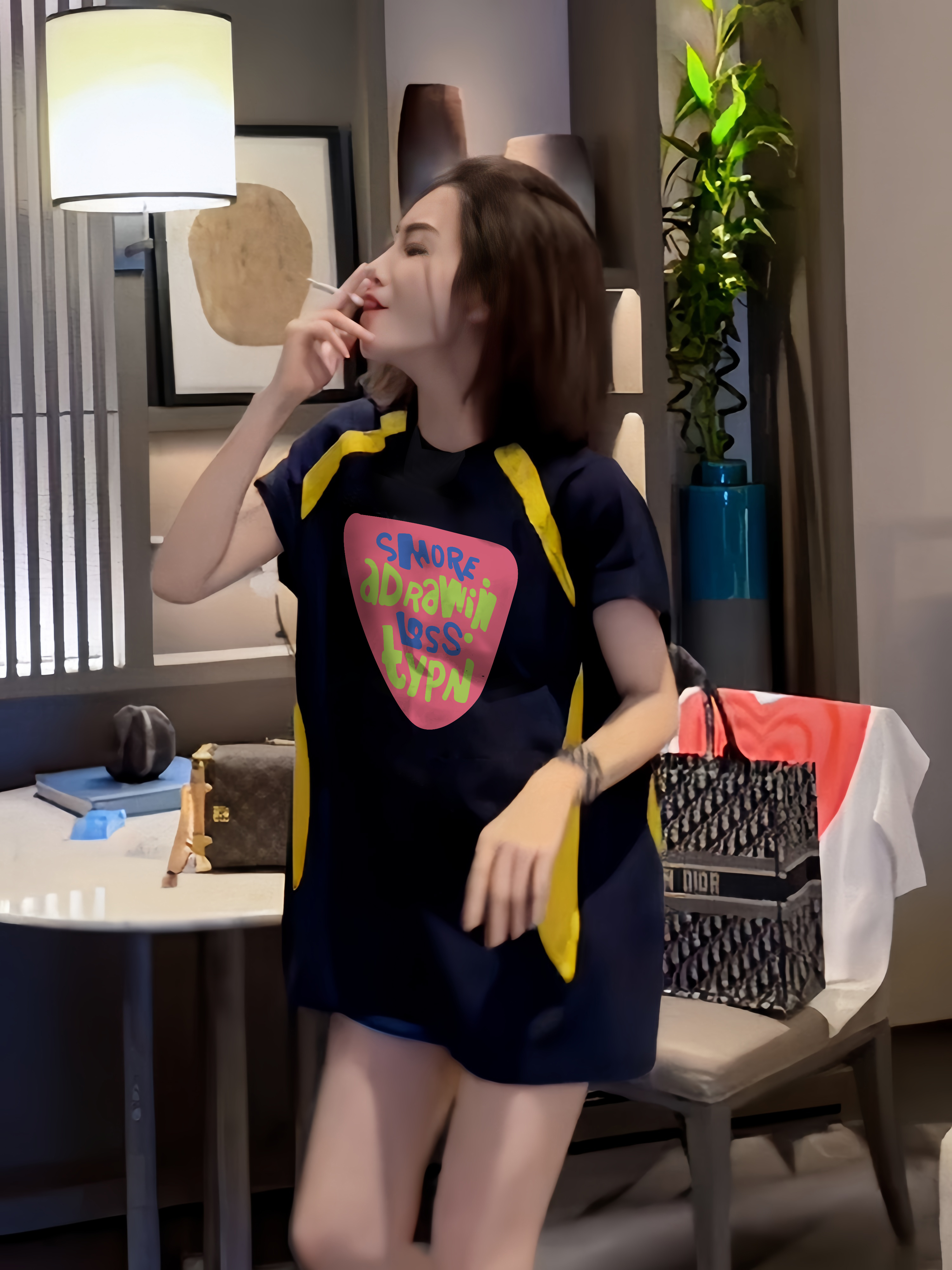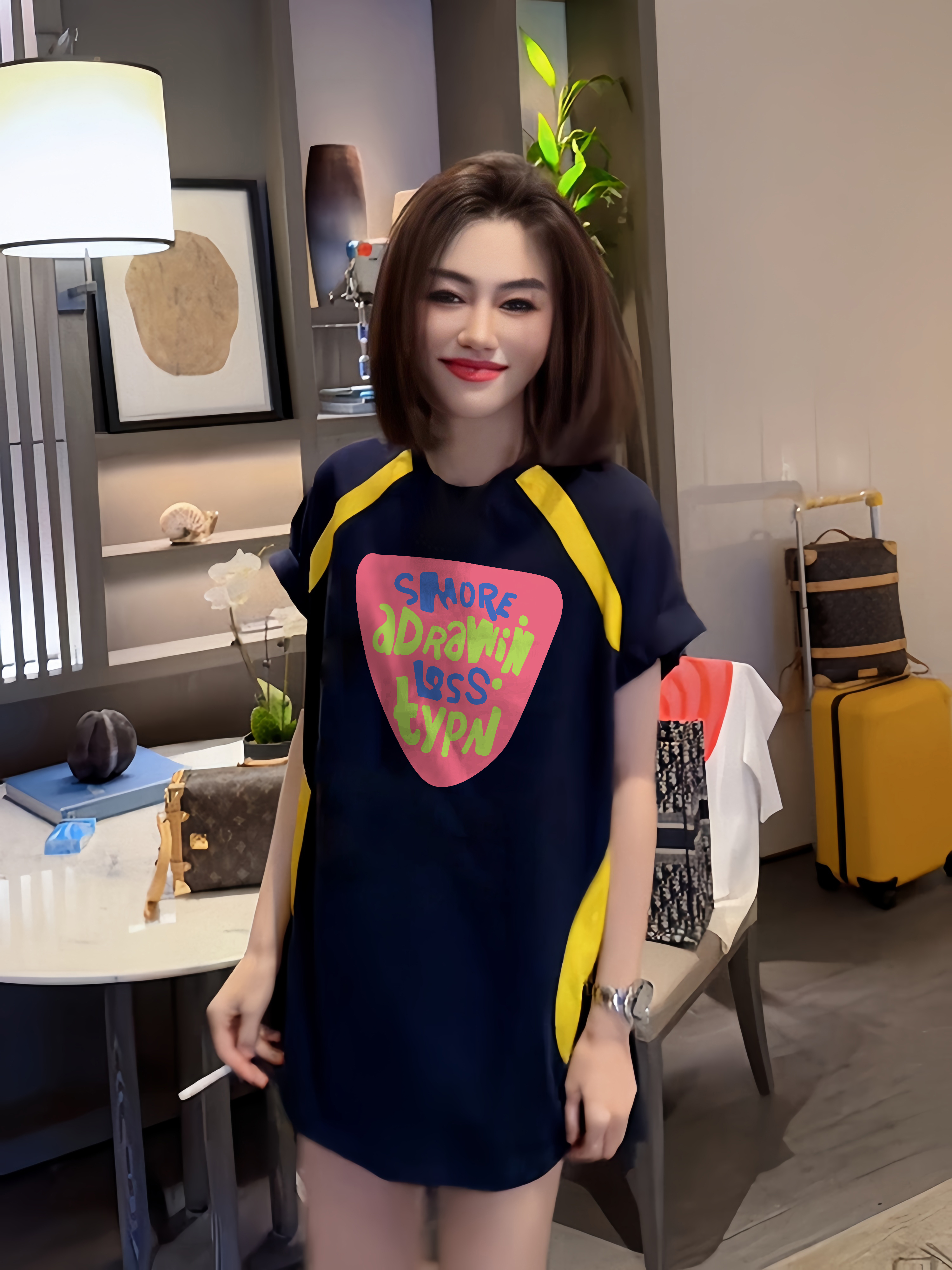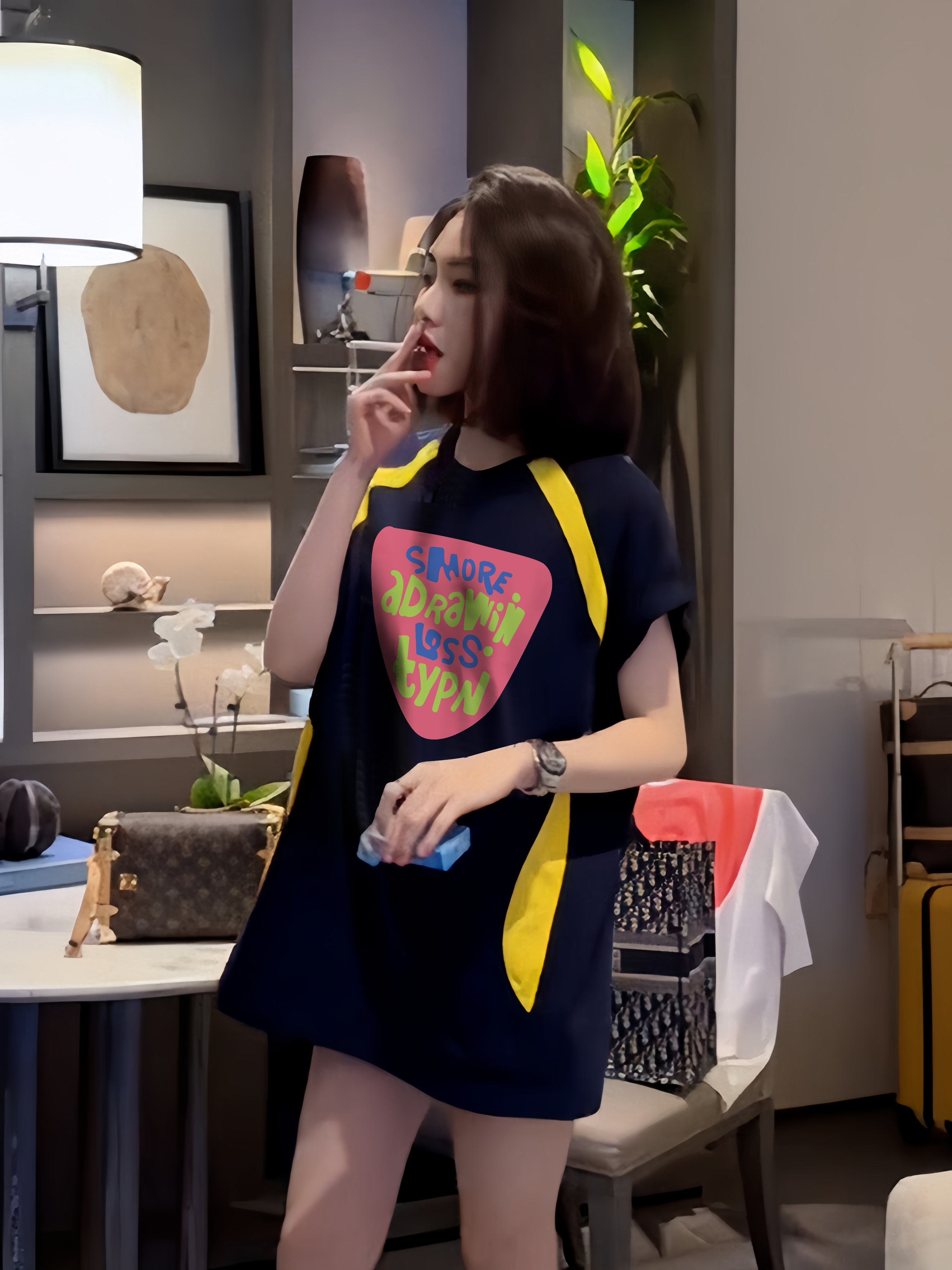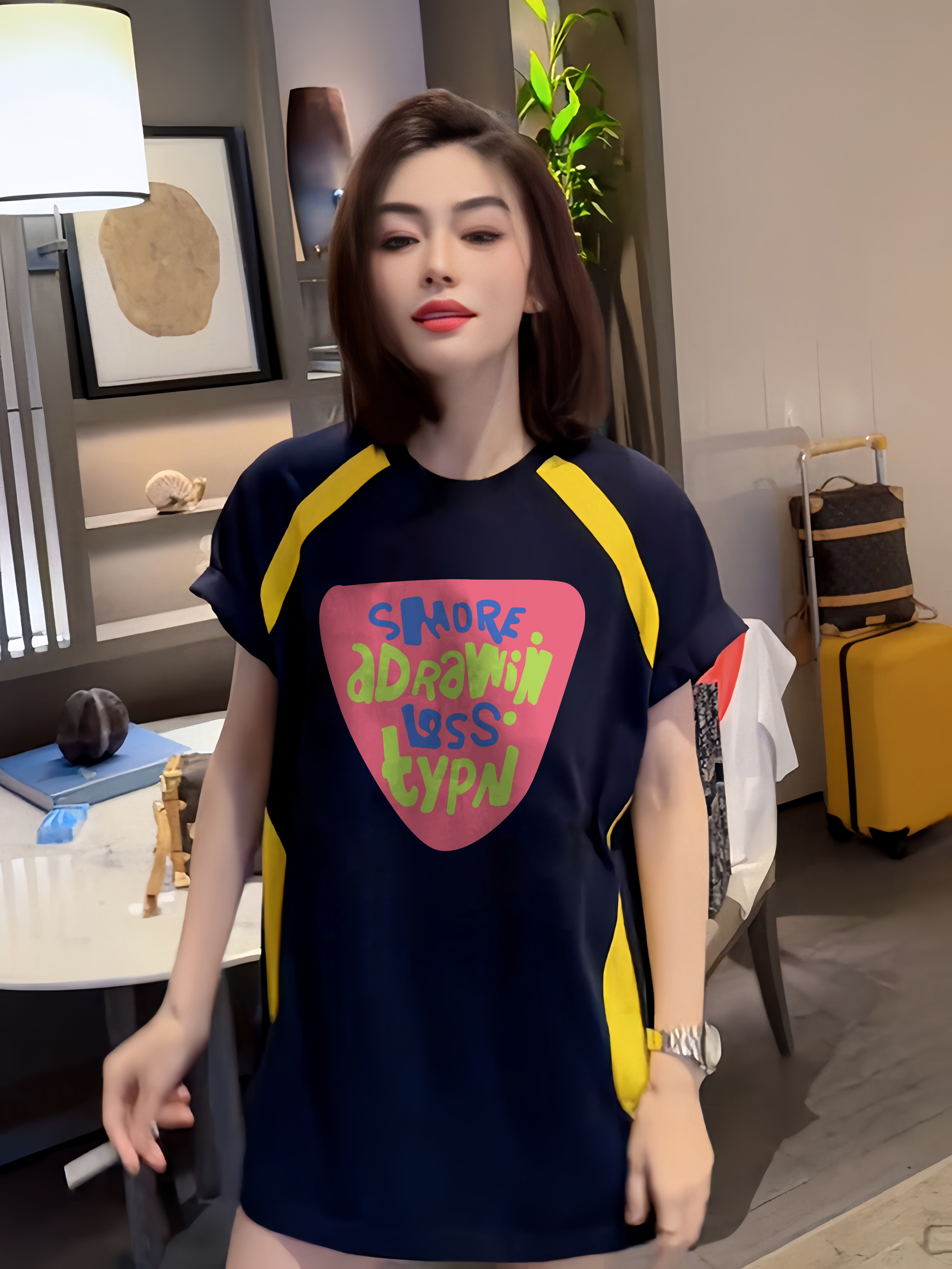 2025 Summer New round Neck Print Short-Sleeved T-shirt Female Stylish Niche Loose Slim Looking Mid Length Long Length Tops Tide