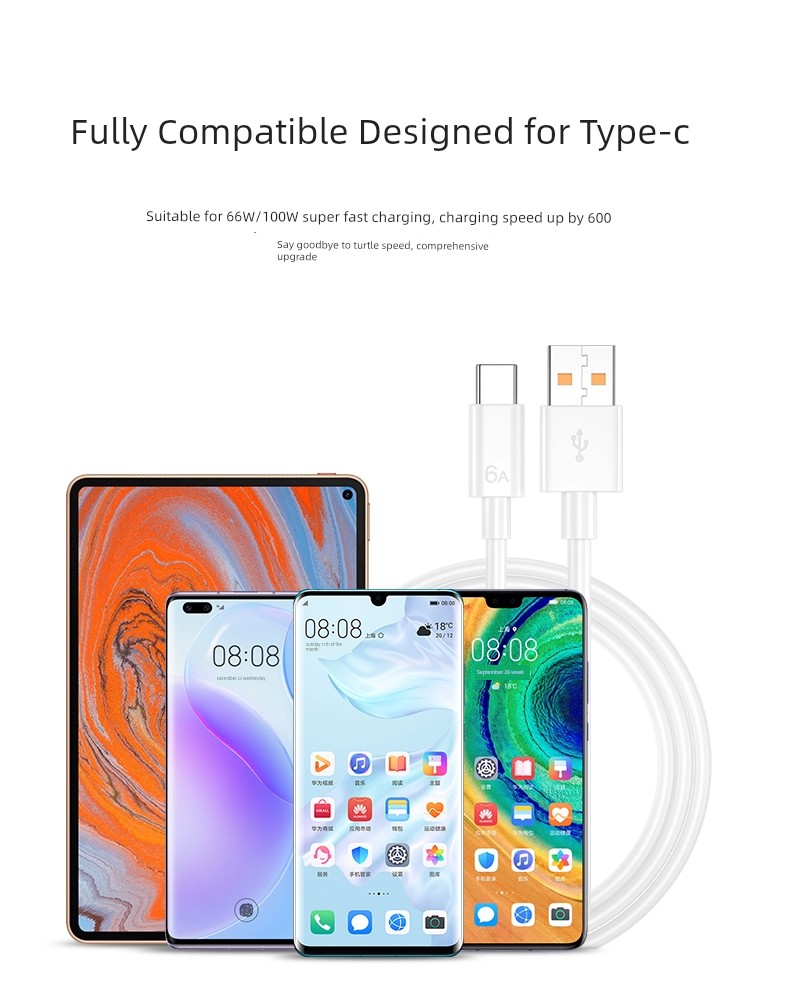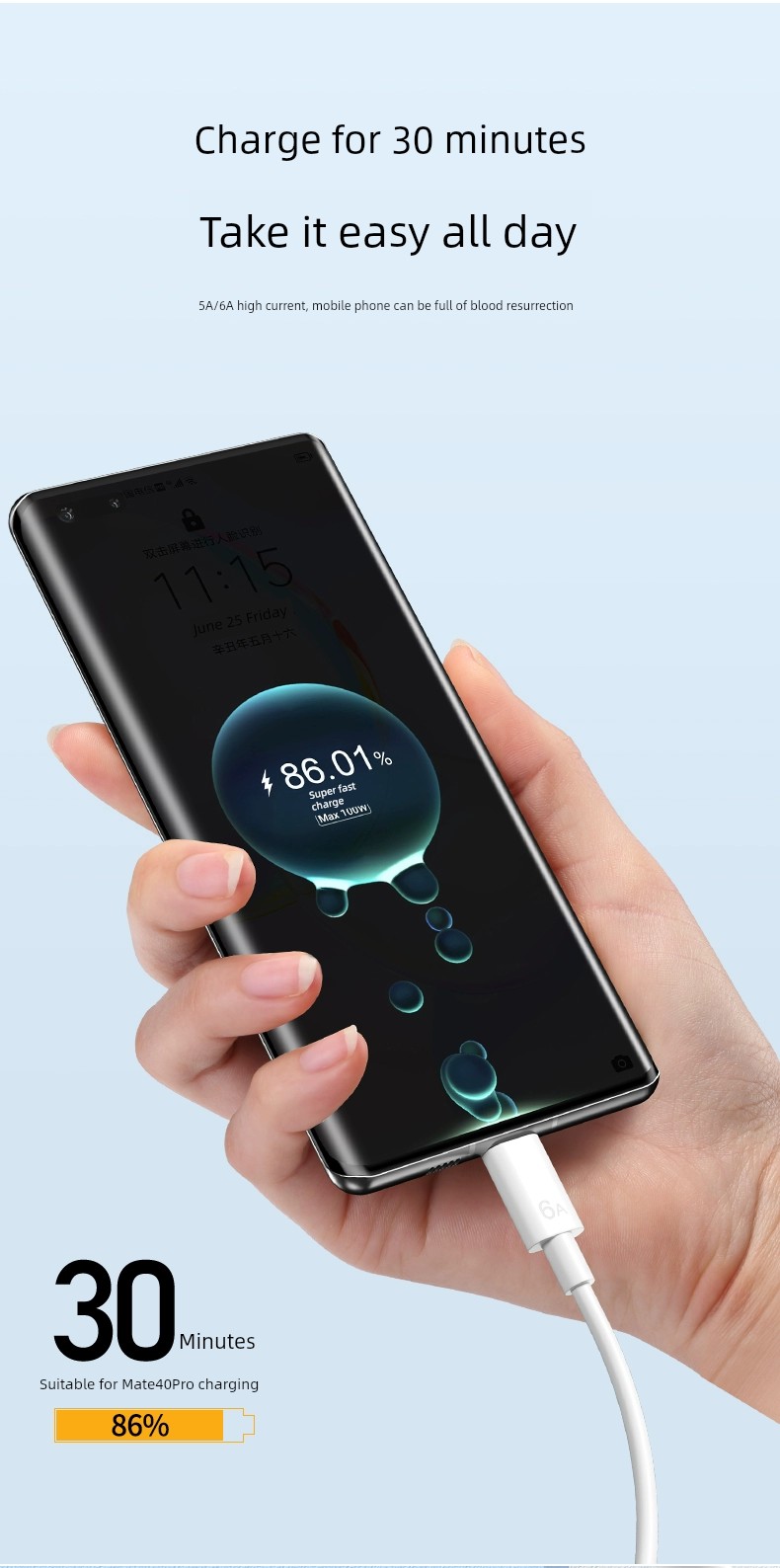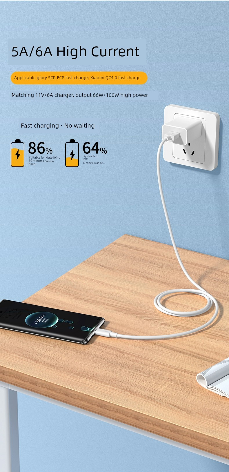 66W Super Fast Charge USB Type-C Cable 6A Genuine Goods BS for P20p30p40mate50 Glory TPC Long Xiaomi Huawei Tpyec Charger Nova8/9 Android Phone