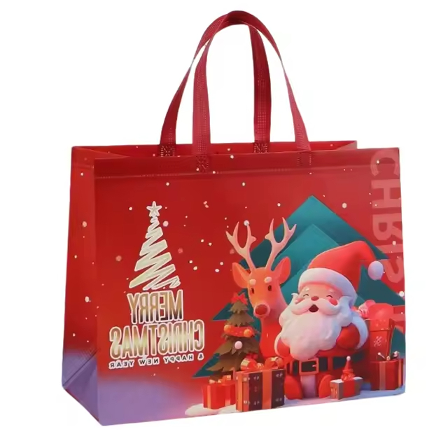 Recyclable Santa Print Nonwoven Tote Bags. Custom Christmas Gift Bags.