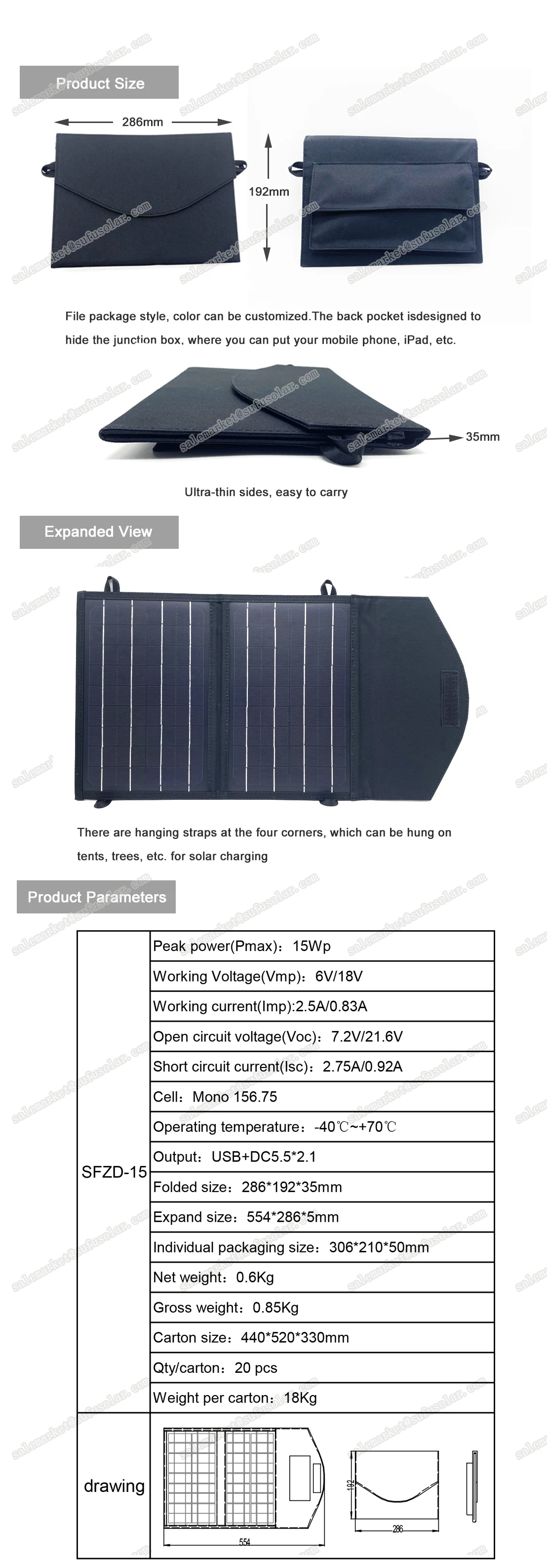 Stable output and reliable charging: The power bank is equipped with a USB charging port, and the USB charging cable is used to connect various charging devices, which is convenient, simple and reliable. In order to improve the quality and stability of charging and protect the safety of the equipment being charged, an output voltage regulator device is also installed on the back of the power bank.Waterproof coating, not afraid of wind and rain: outdoor travel will inevitably encounter harsh environmental and climaticconditions such as wind, frost, snow and rain. The outside of the power bank is coated with a waterproof coating, which caneffectively resist the damage to the circuit caused by rain and snow erosion and ensure charging The treasure is in good condition and in normal use.It can be hung, and it can be used with confidence: some people ask, don’t you always use the solar cell facing the sun in your hand, don’t worry about this, the four small holes on the four corners of the power bank can solve this problem, and it can be hung on the backpack. On objects such as, branches, etc., you can safely charge without holding it with your hands.