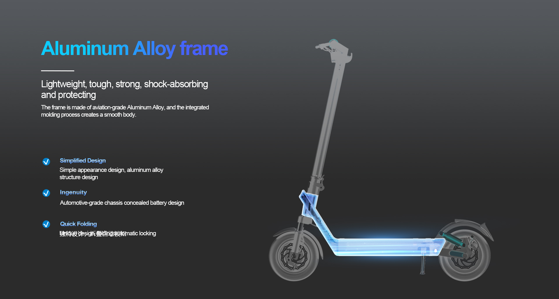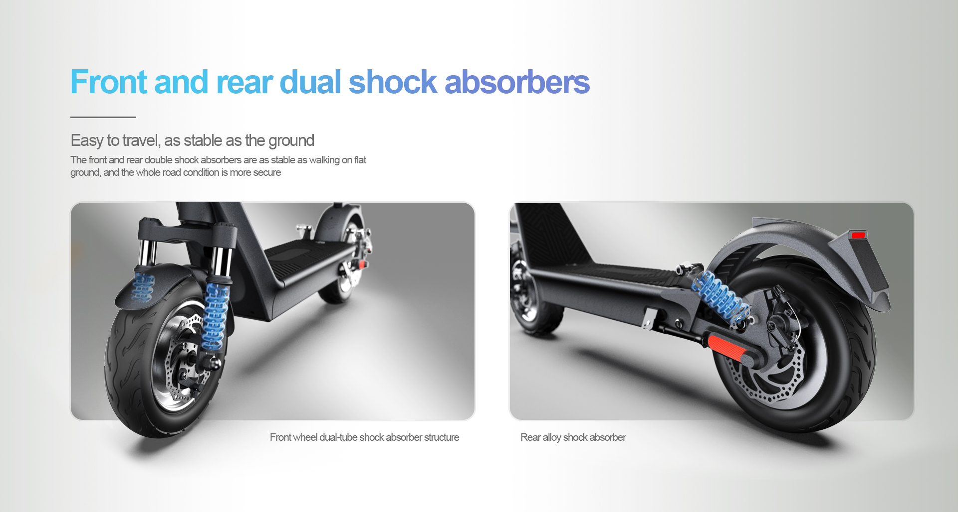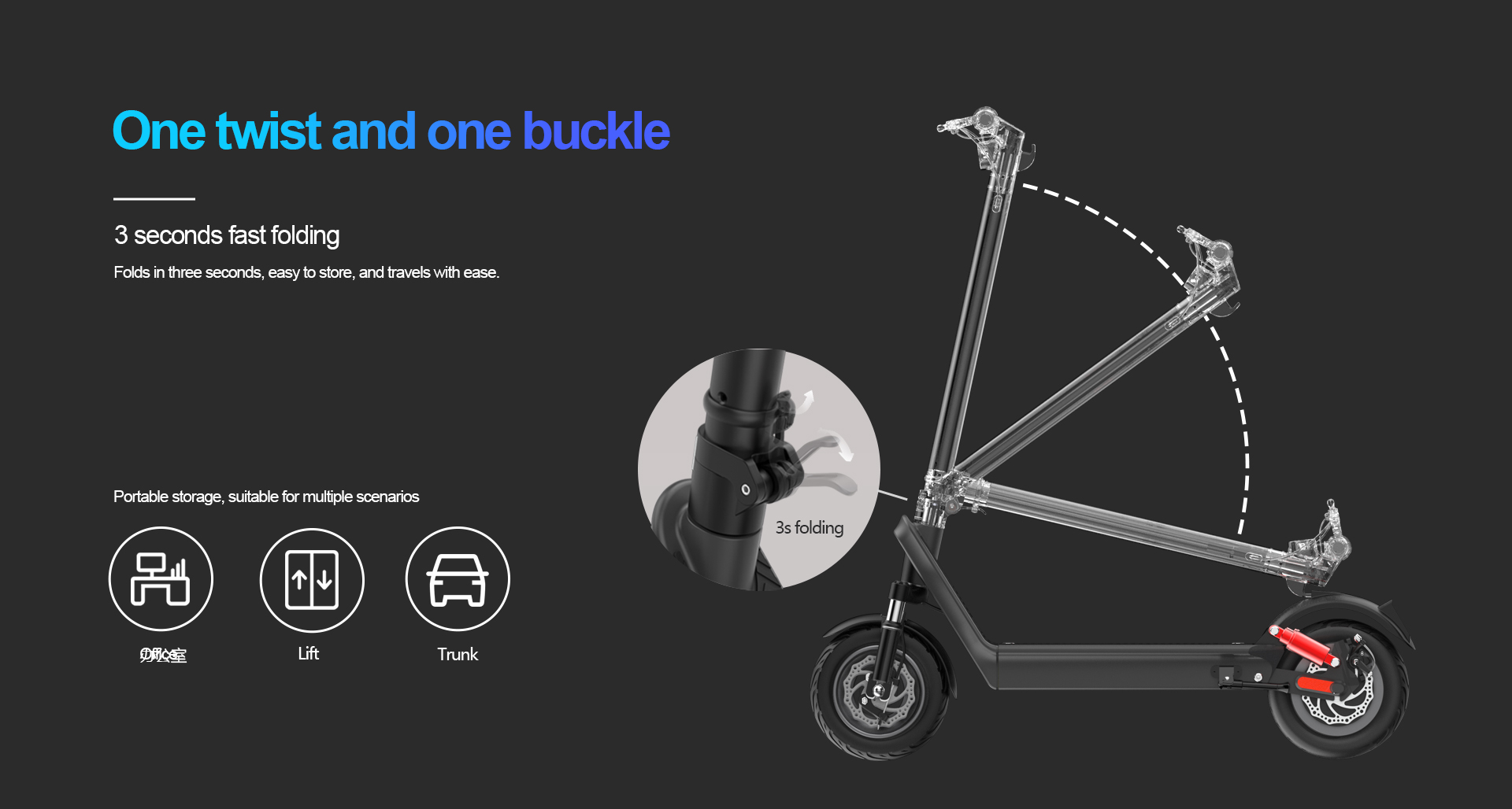 Its front and rear dual shock absorbers ensure a bump-free experience even on uneven pavements, keeping rides as stable as walking on flat ground. Built with an aviation-grade aluminum alloy frame (integrated molding process), this scooter balances lightweight portability and tough durability, handling long-term daily use effortlessly. The 3-second fast folding design (one twist + one buckle) lets you stow it quickly in office corners, car trunks, or elevators—perfect for busy urban lifestyles.