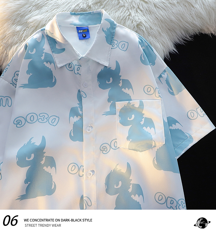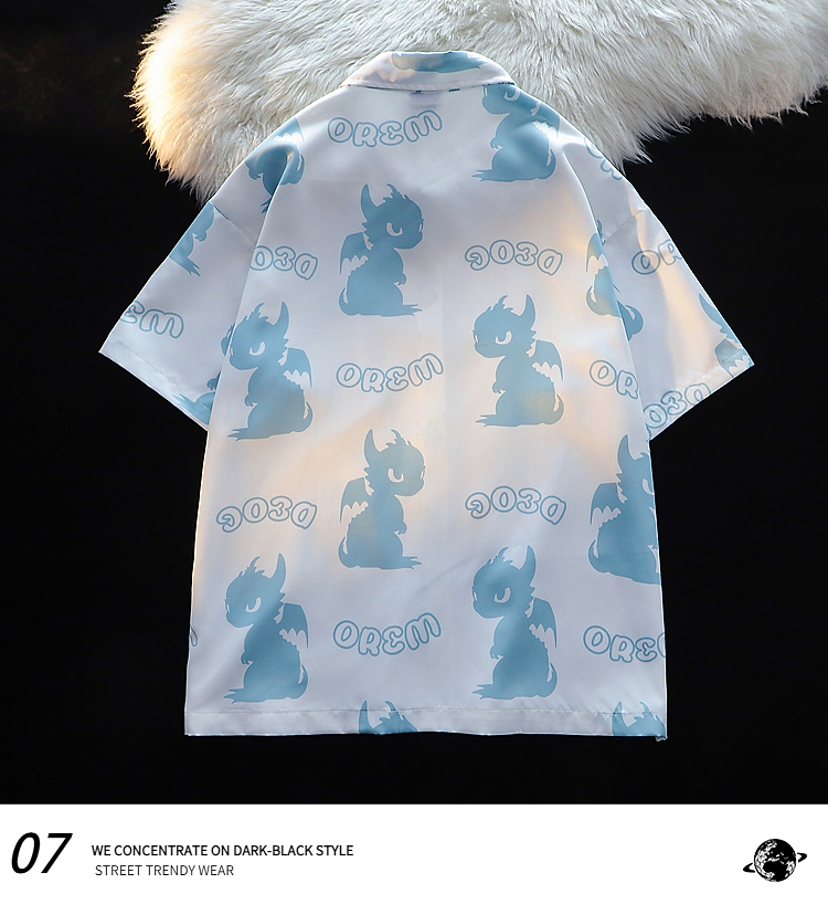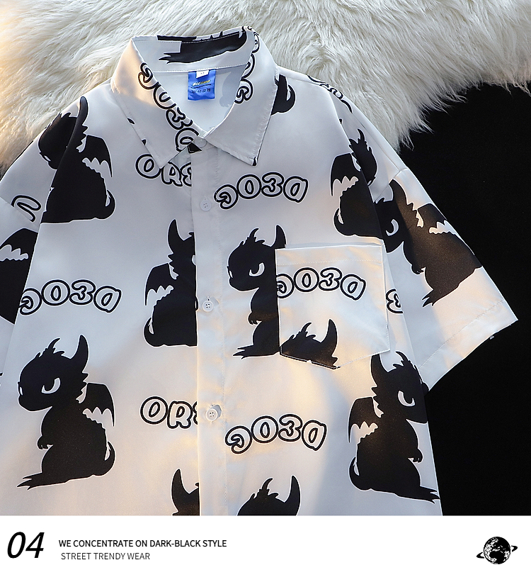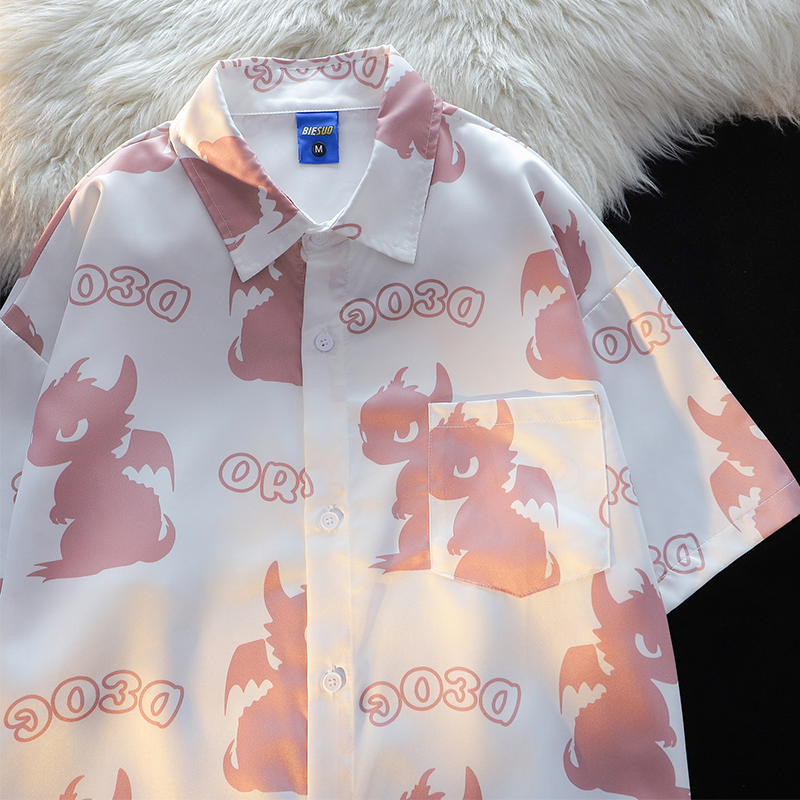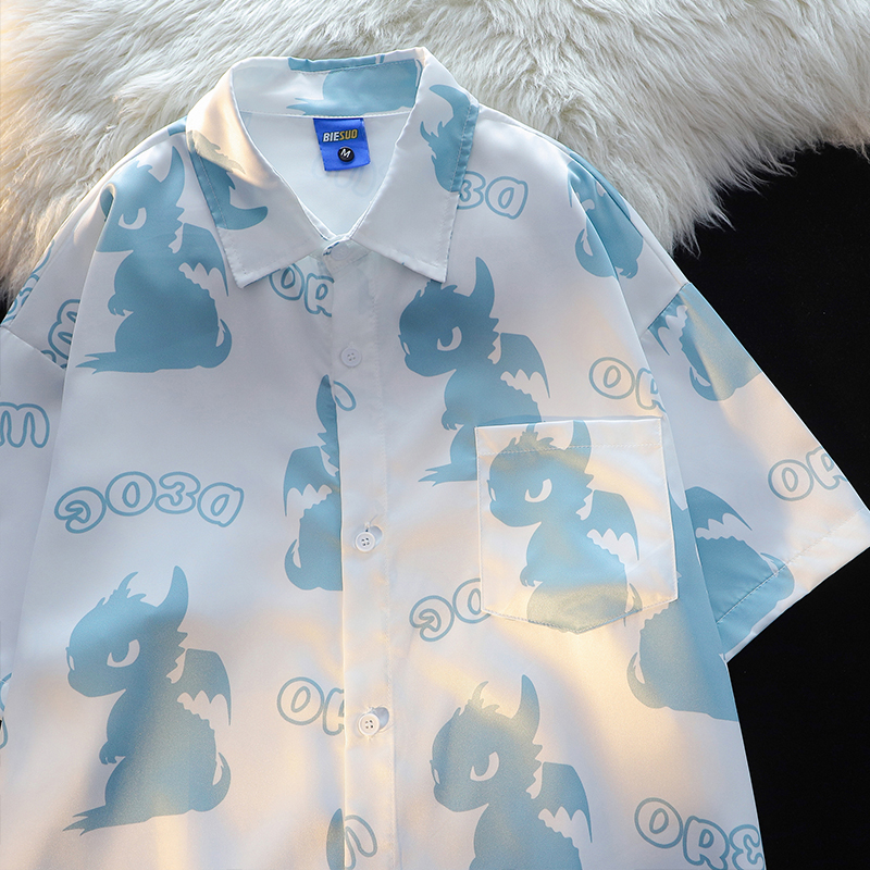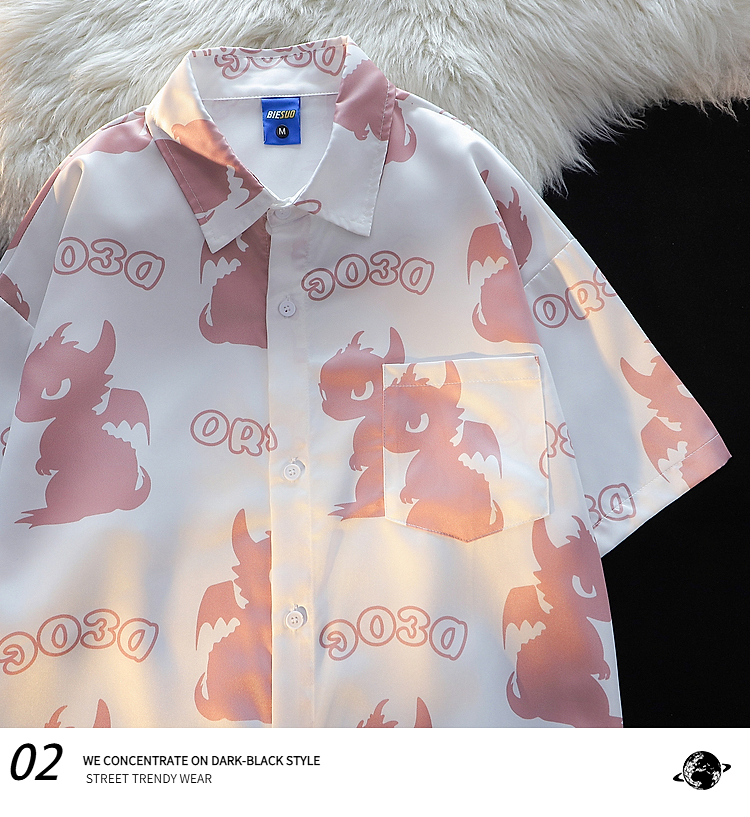 American Fashion Brand Cute Dinosaur Full Printed Short Sleeve Shirt Women's Summer Loose Lazy Hong Kong Style Couple's Half Sleeve Shirt