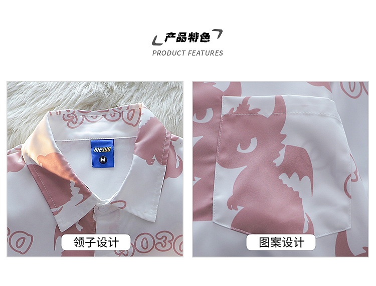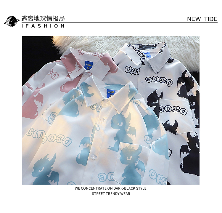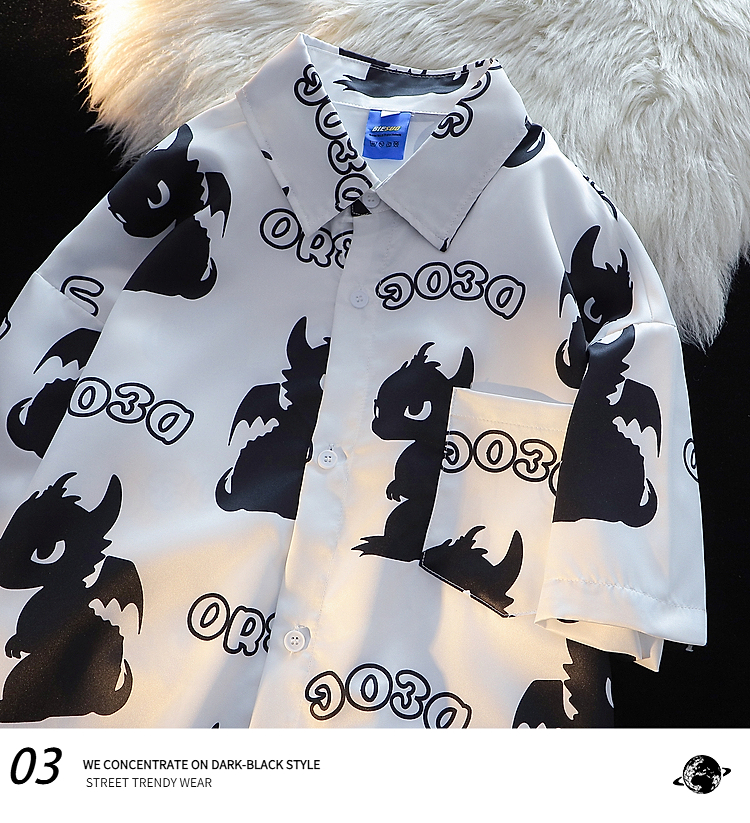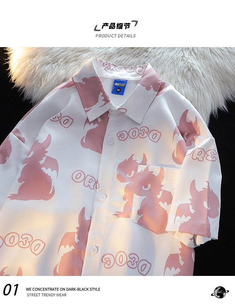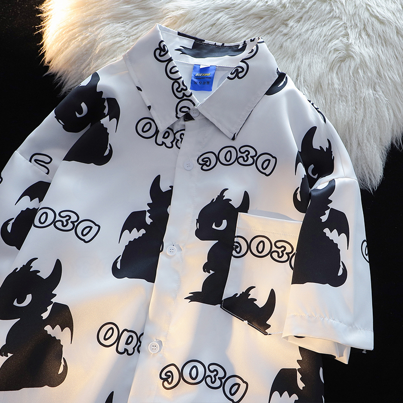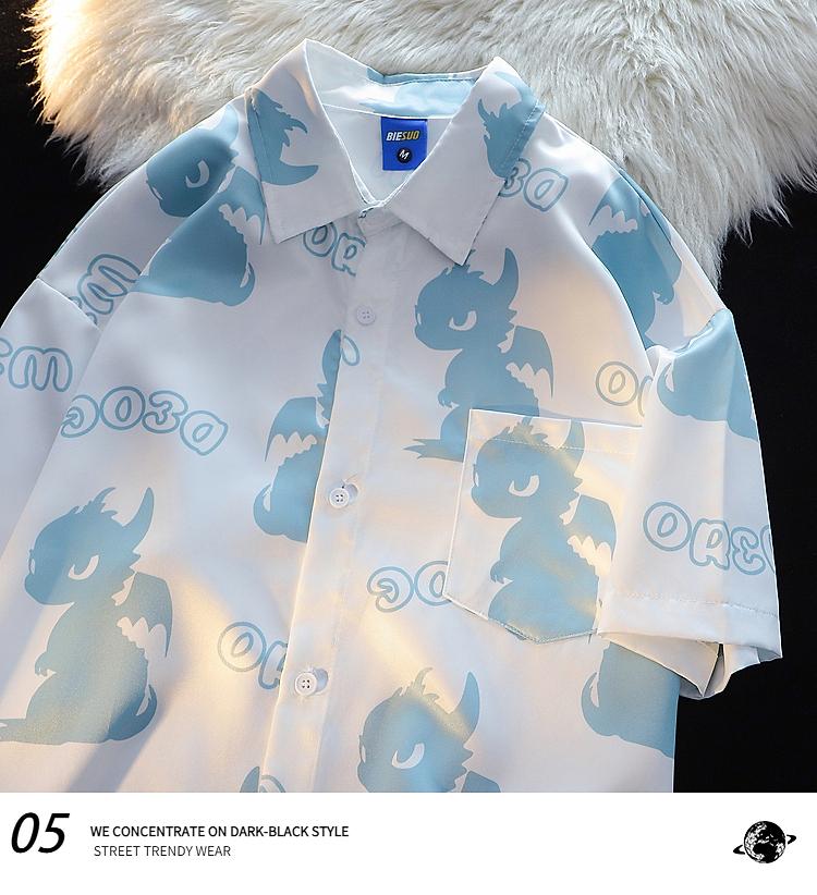 American Fashion Brand Cute Dinosaur Full Printed Short Sleeve Shirt Women's Summer Loose Lazy Hong Kong Style Couple's Half Sleeve Shirt
