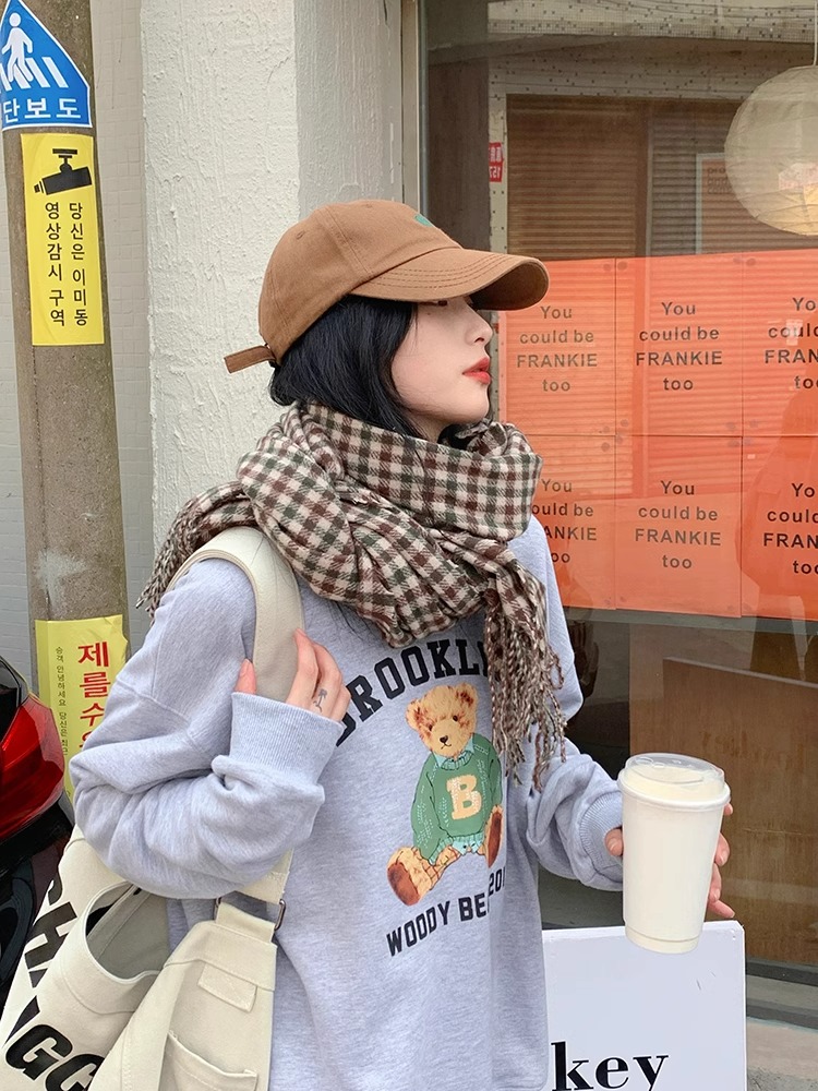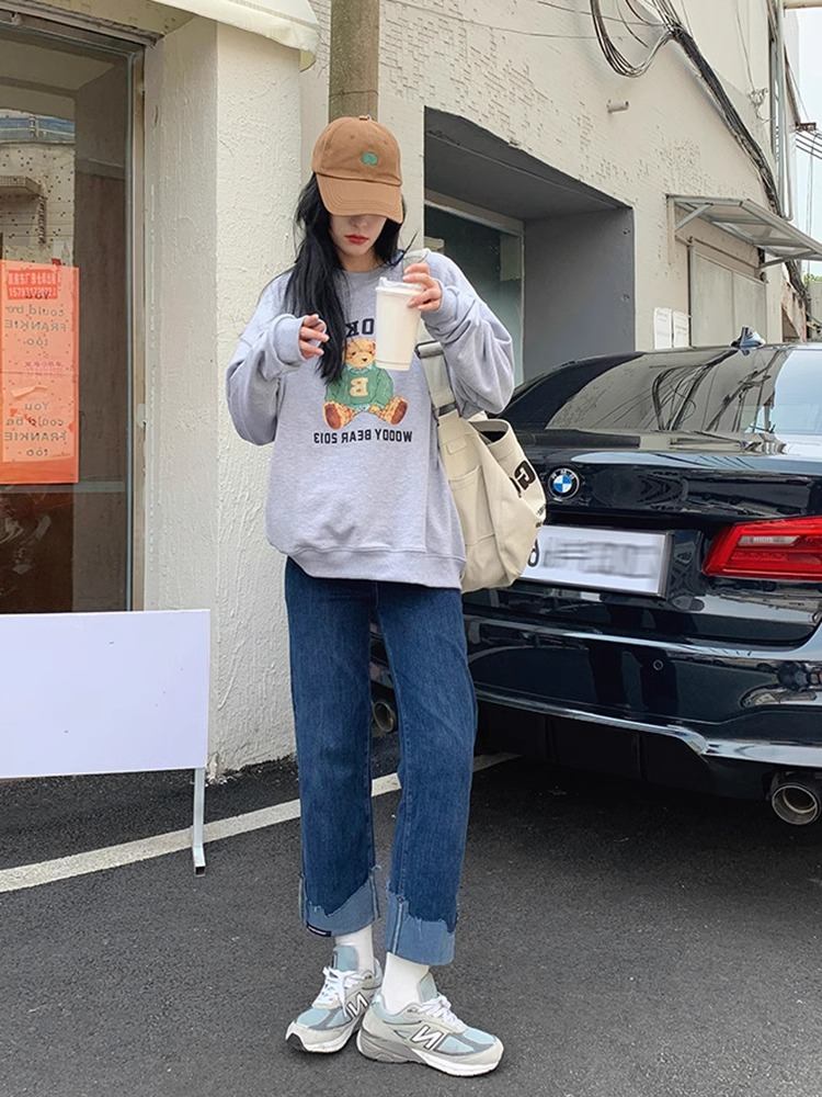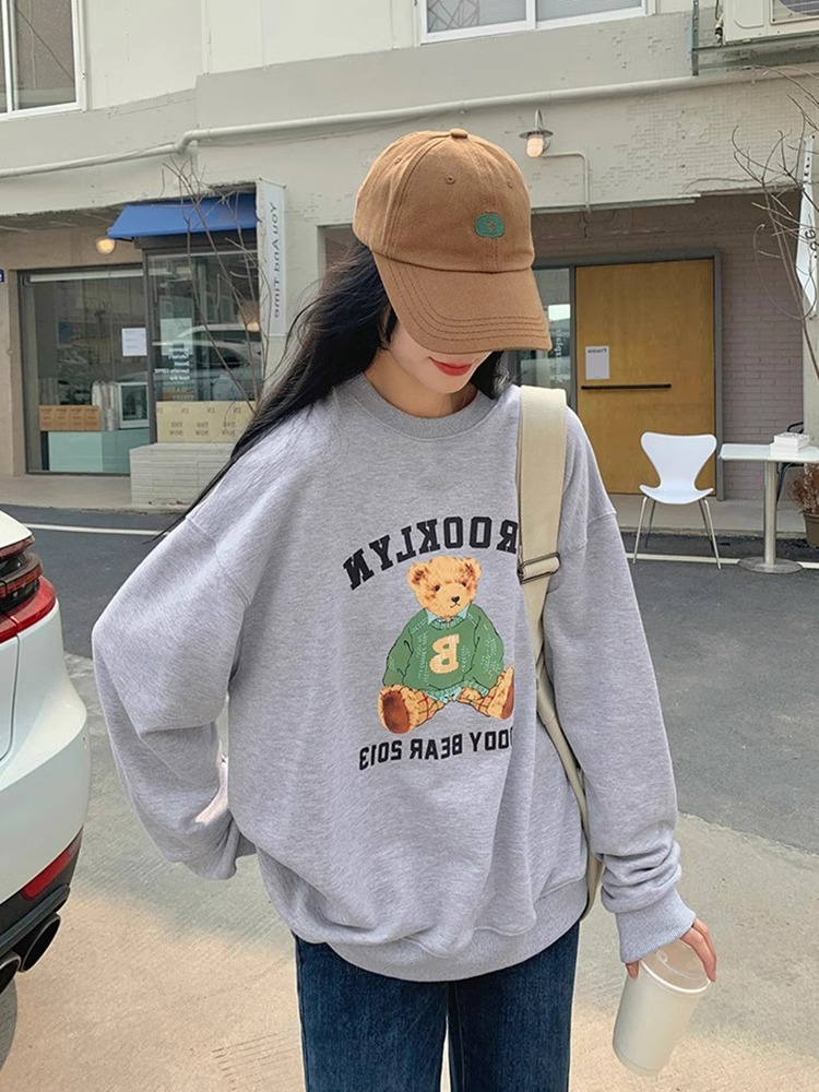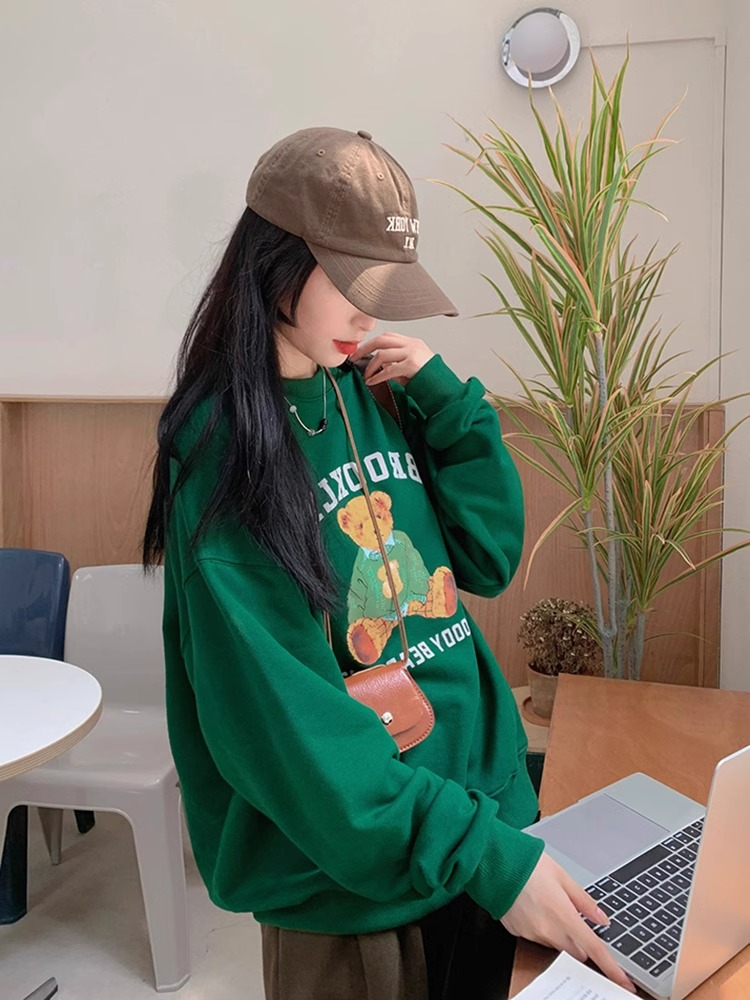 American Fried Street Green Bear round Neck Hoodie Women 2025 Spring and Autumn New Lazy Loose Hong Kong Style Chic Top Fashion