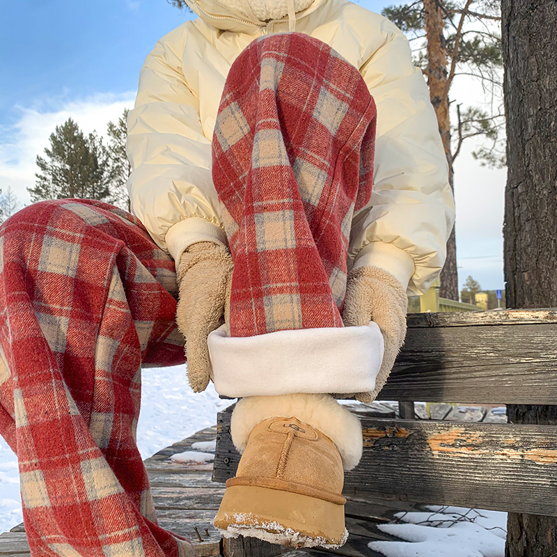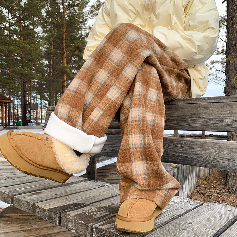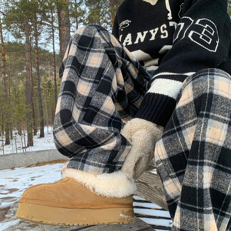 American Retro Color Matching Plaid Casual Pants for Women 2025 New Arrival Winter Loose Velvet Thickened Straight-Leg Wide-Leg Pants