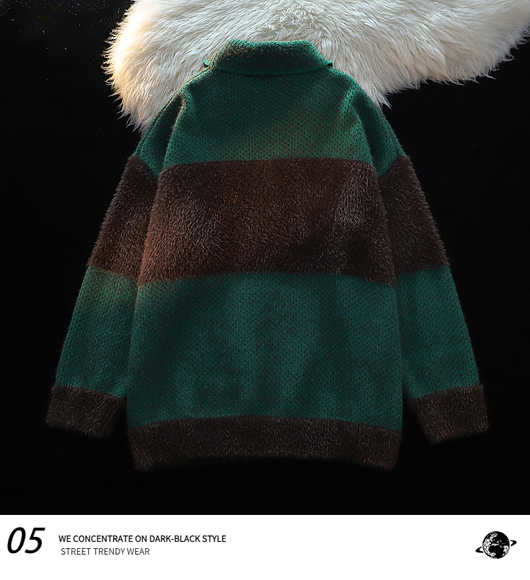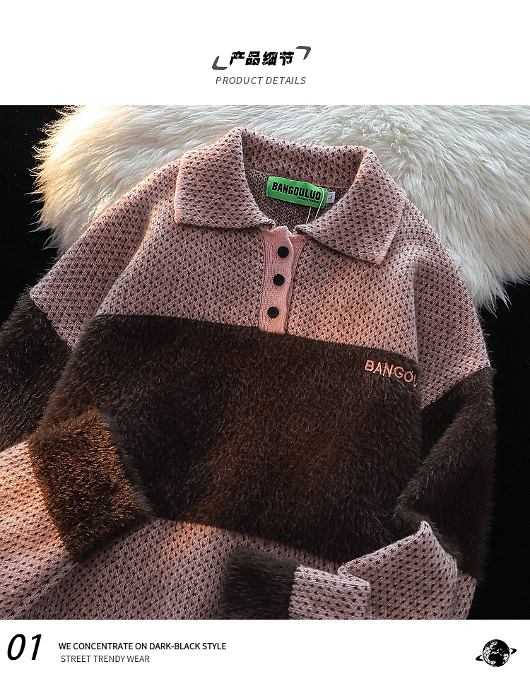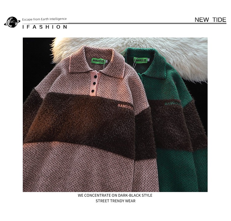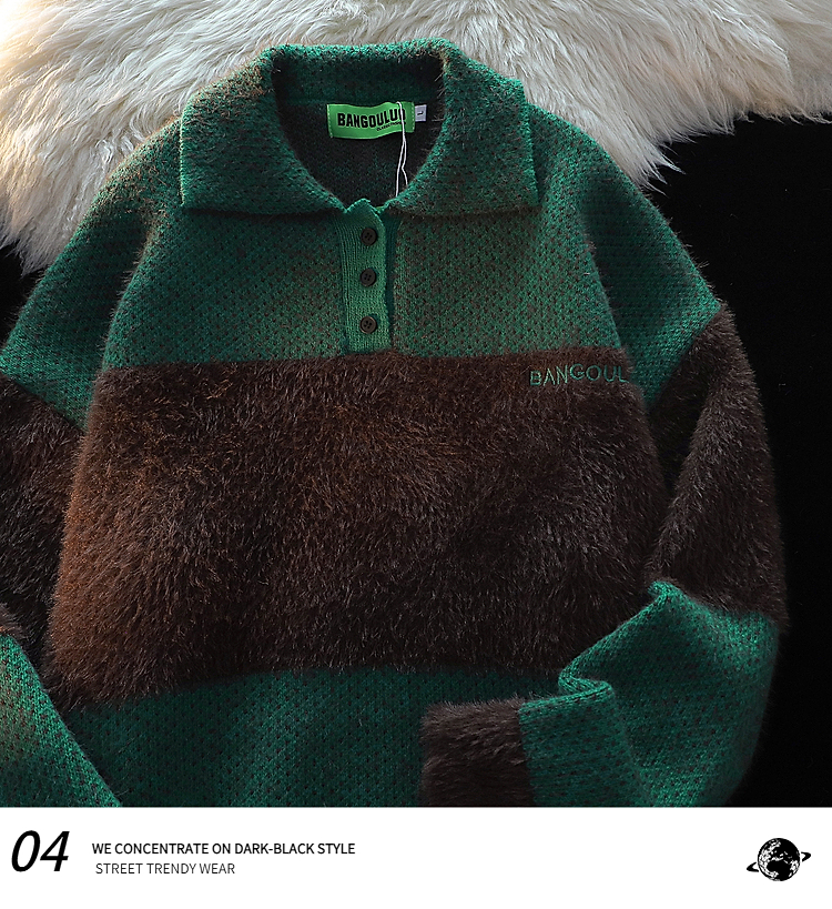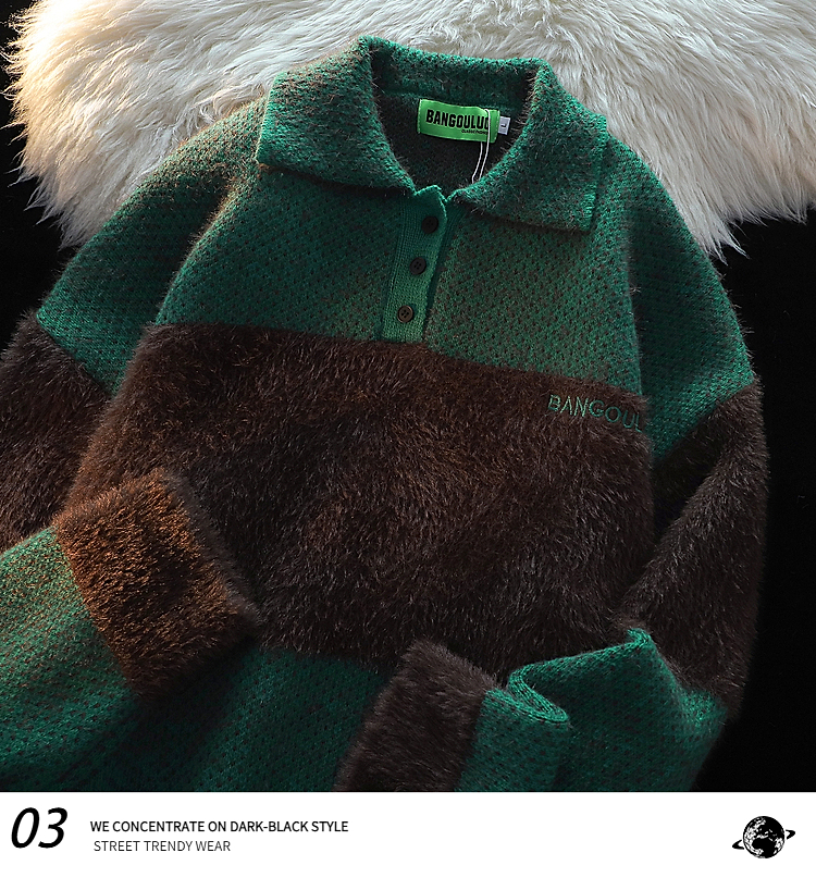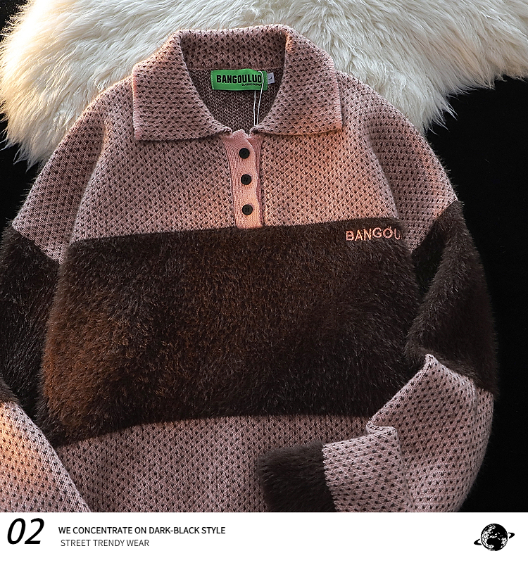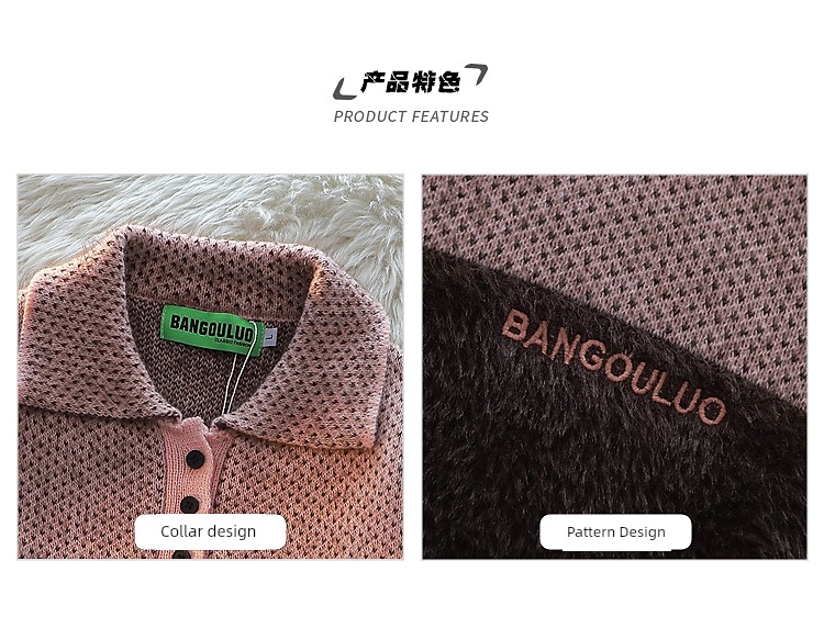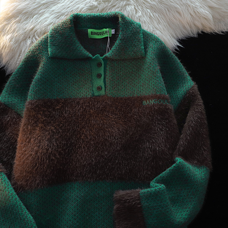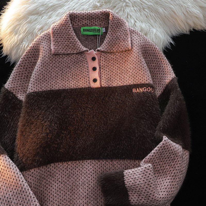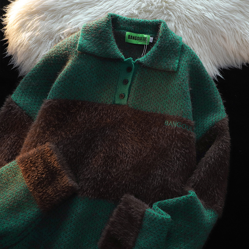 American Retro Embroider Polo Collar Sweater Female 2025 Winter New Arrival Couple Mohair Splicing Knitwear Tops