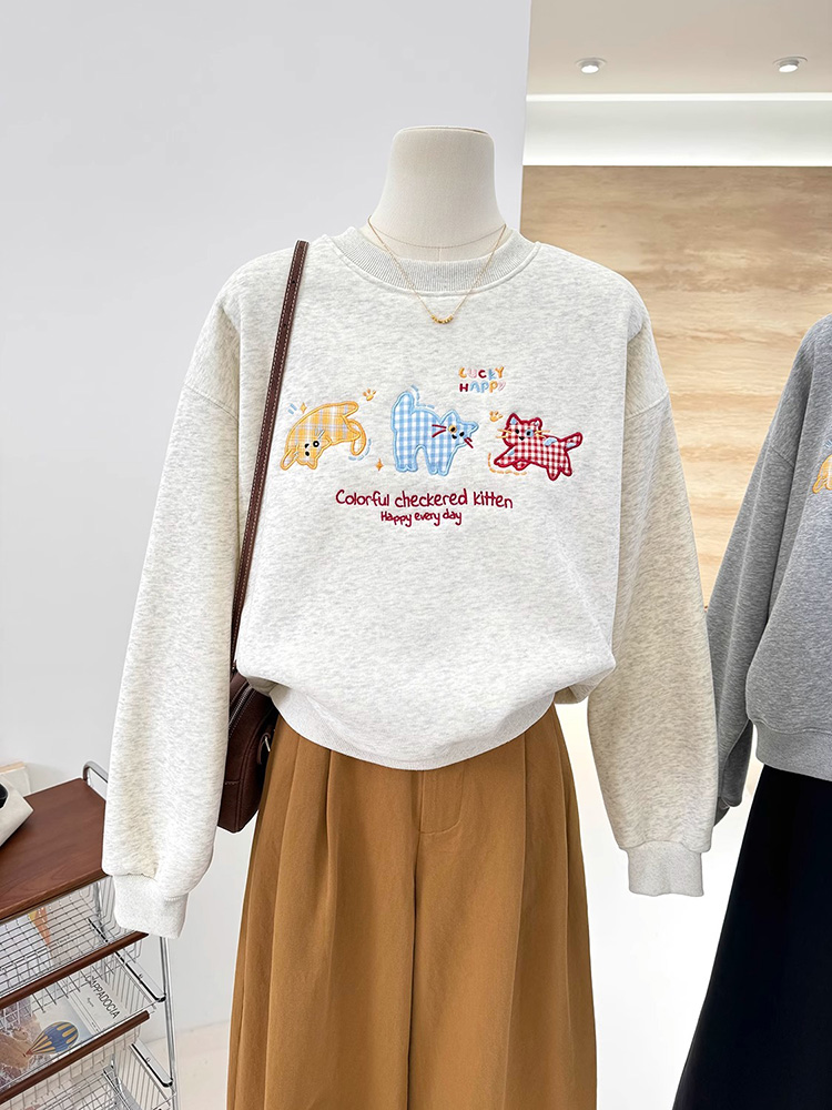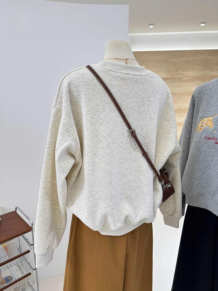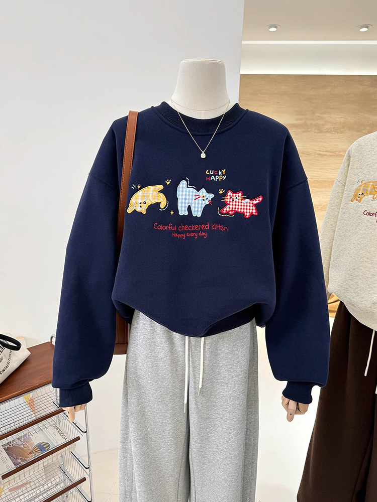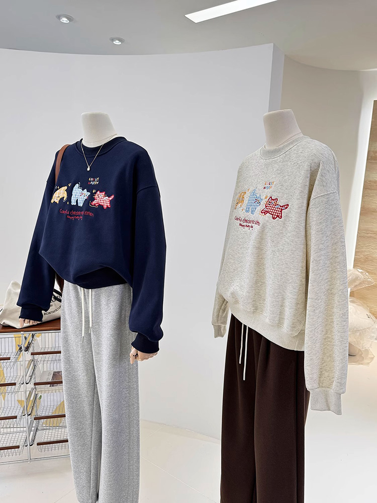 American Retro Embroidered Crew Neck Sweatshirt Female 2025 New Arrival Best Selling Plus Size Plus Size Ladies Korean Style Idle Style Top without Hood
