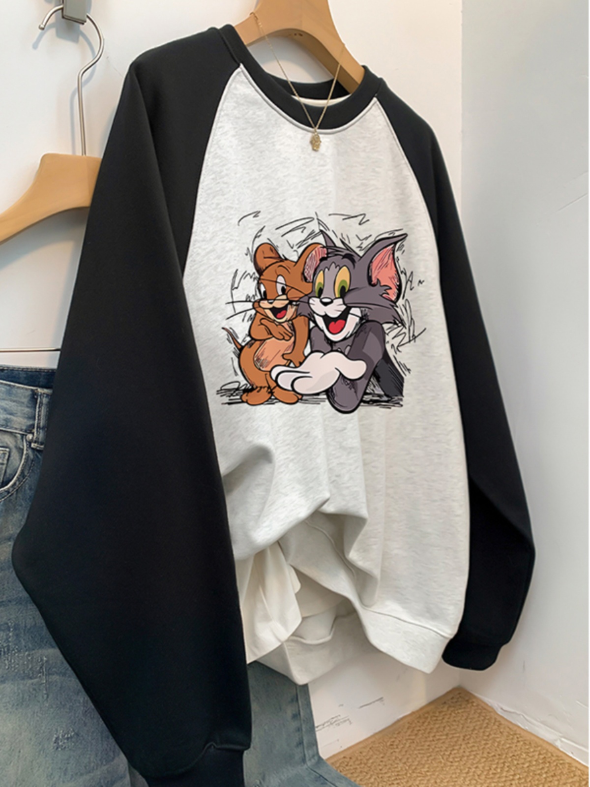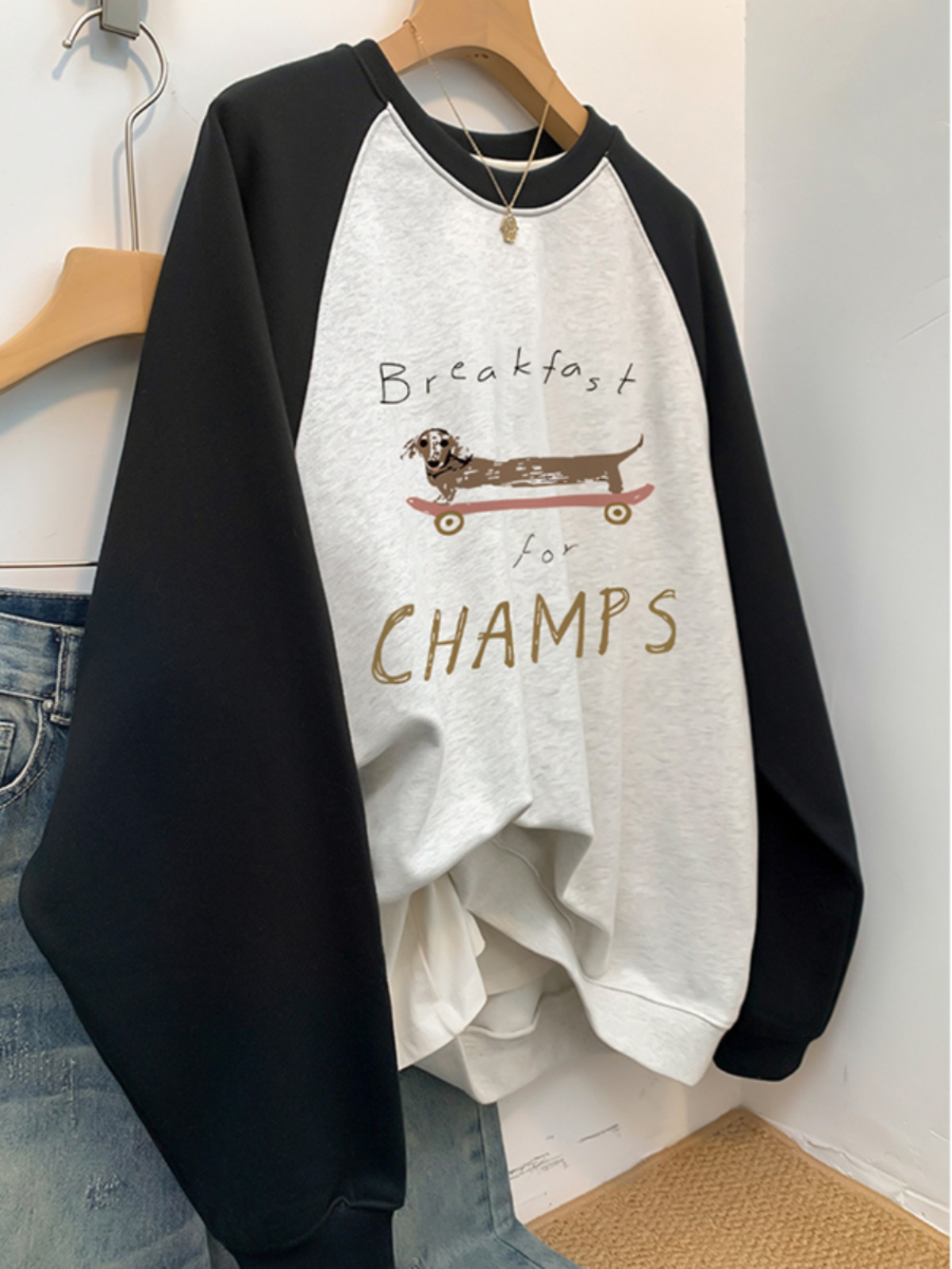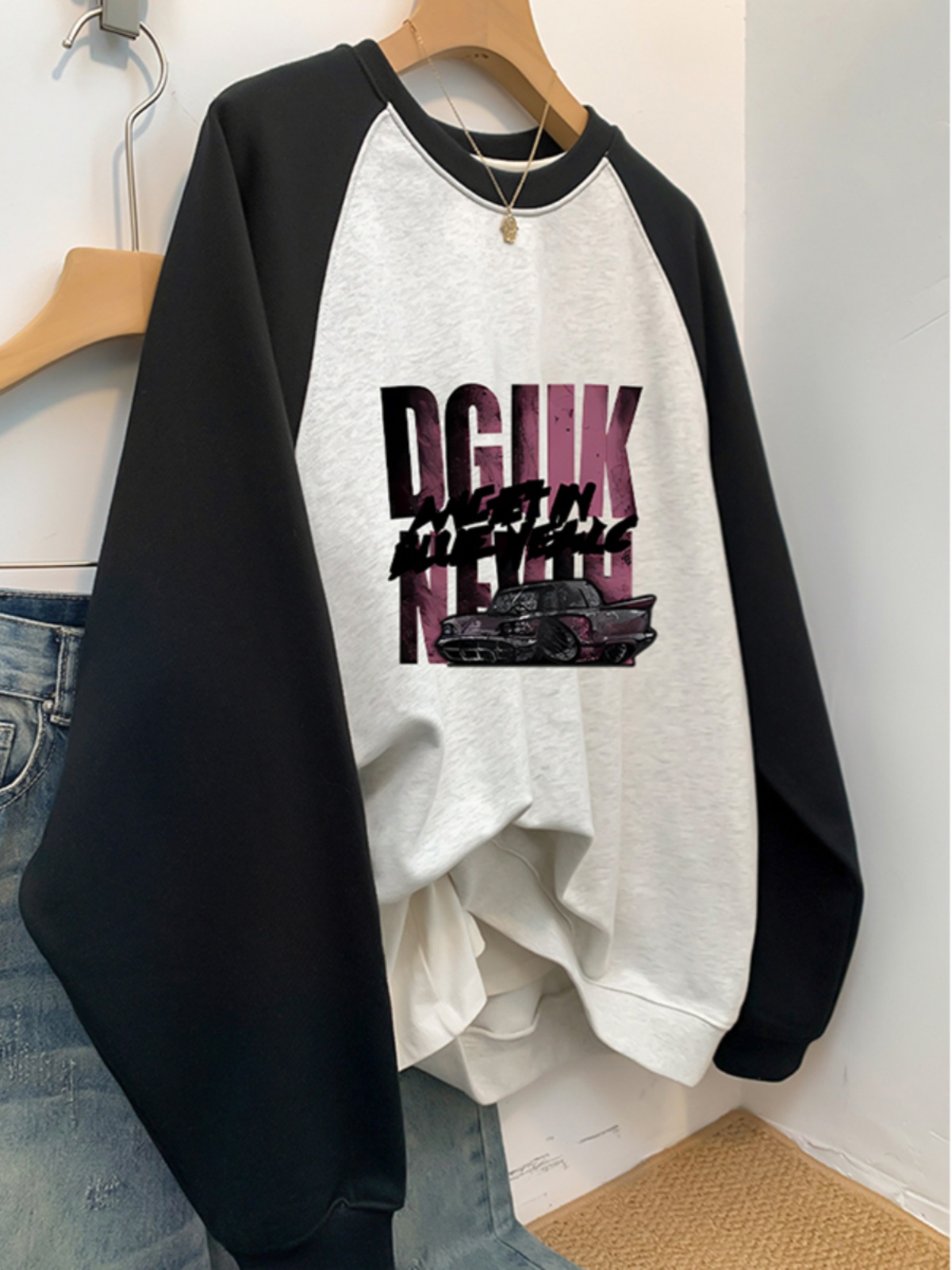 American Retro Fall and Winter Fleece-lined Thickened Raglan Sleeve round Neck Sweatshirt Female Stylish Loose Plus Size Chubby Girl Jacket Tide