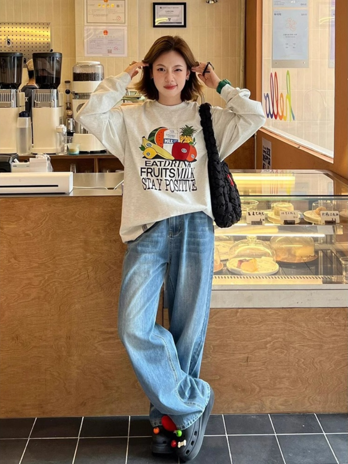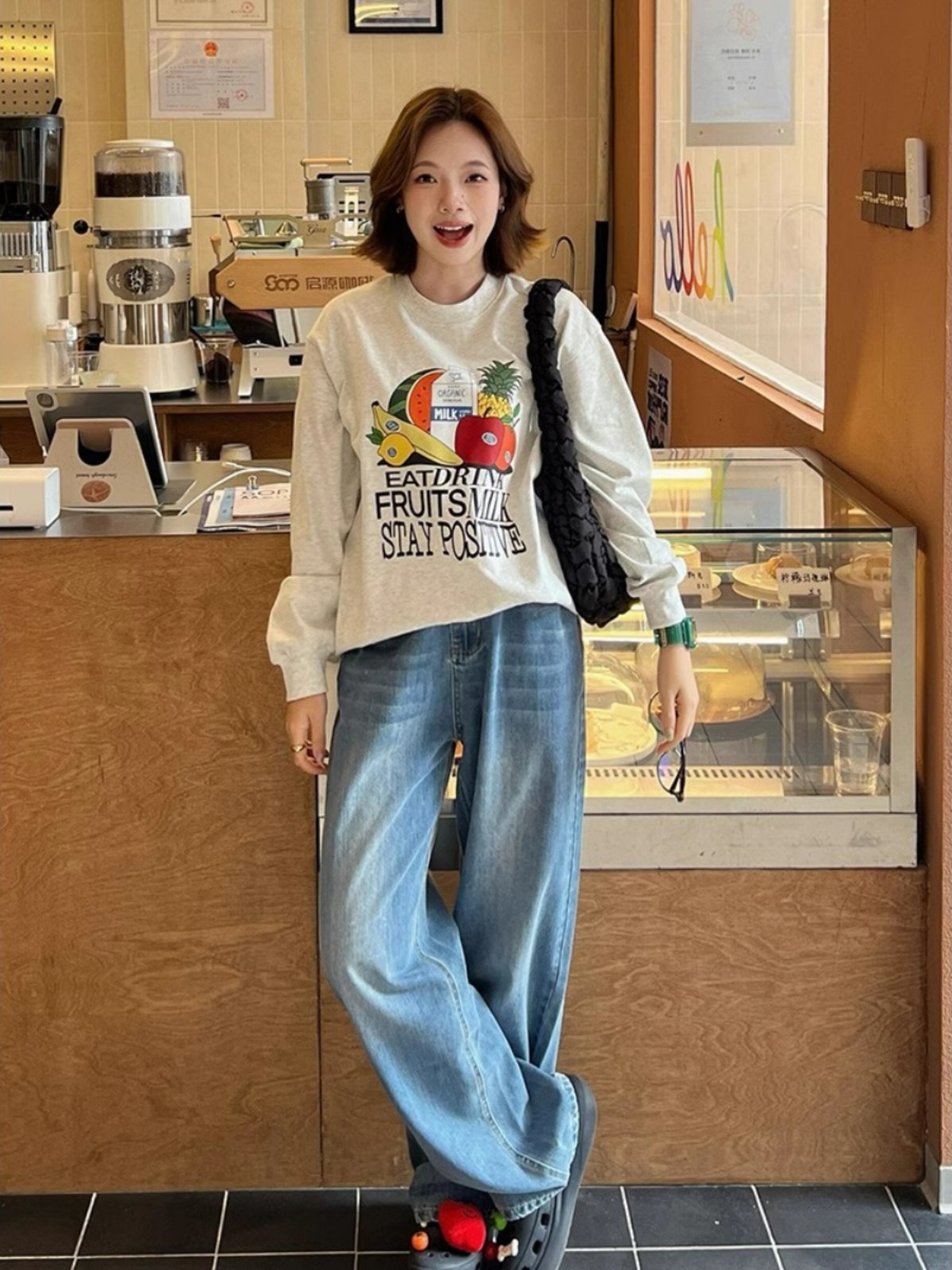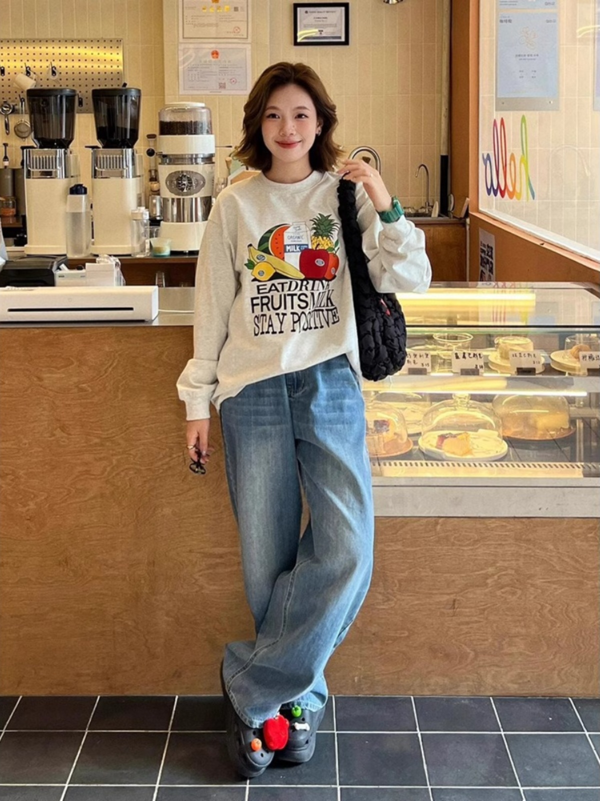 American Retro Gray round-Collar Sweatshirt Women's Spring and Autumn Fruit Letters Print Loose Casual Pullover Long Sleeve Top
