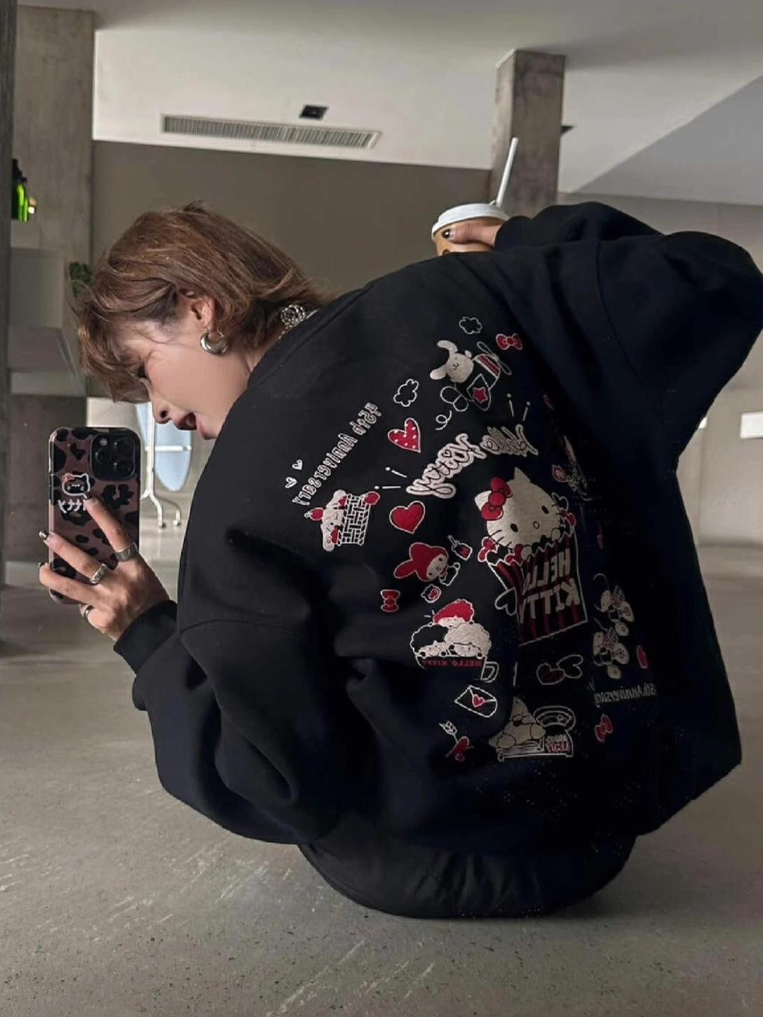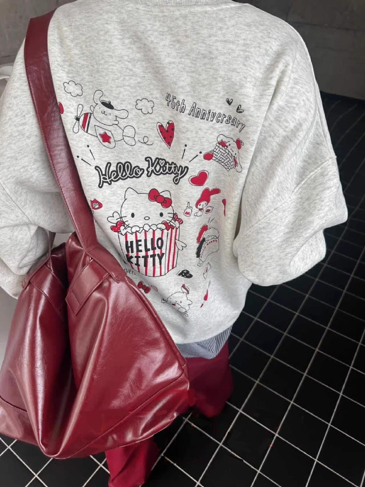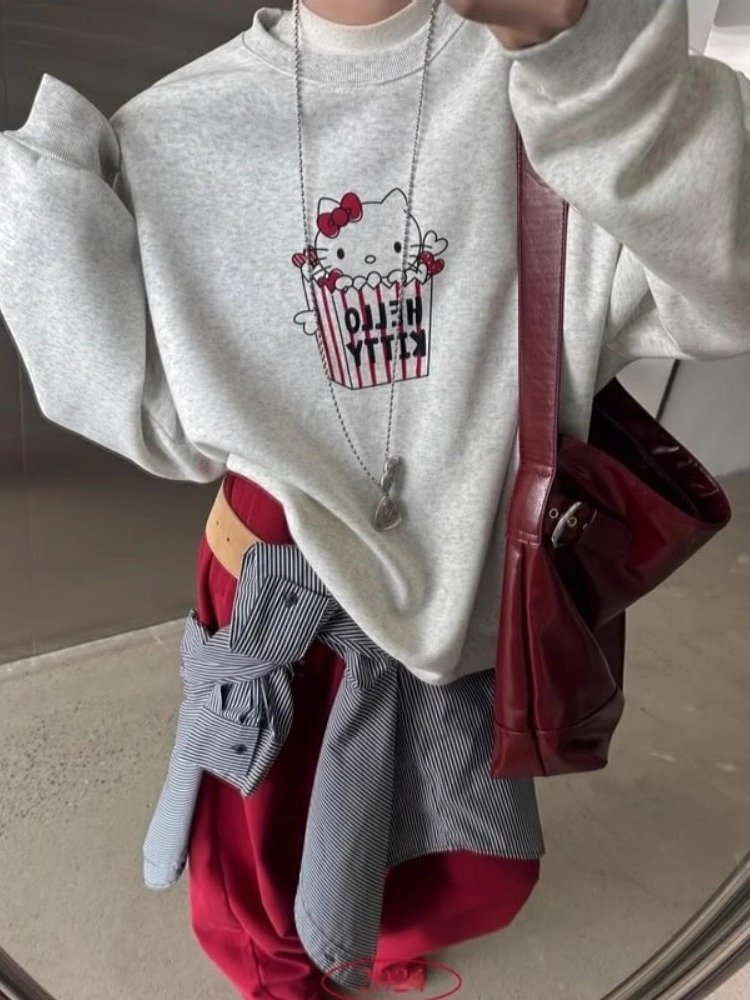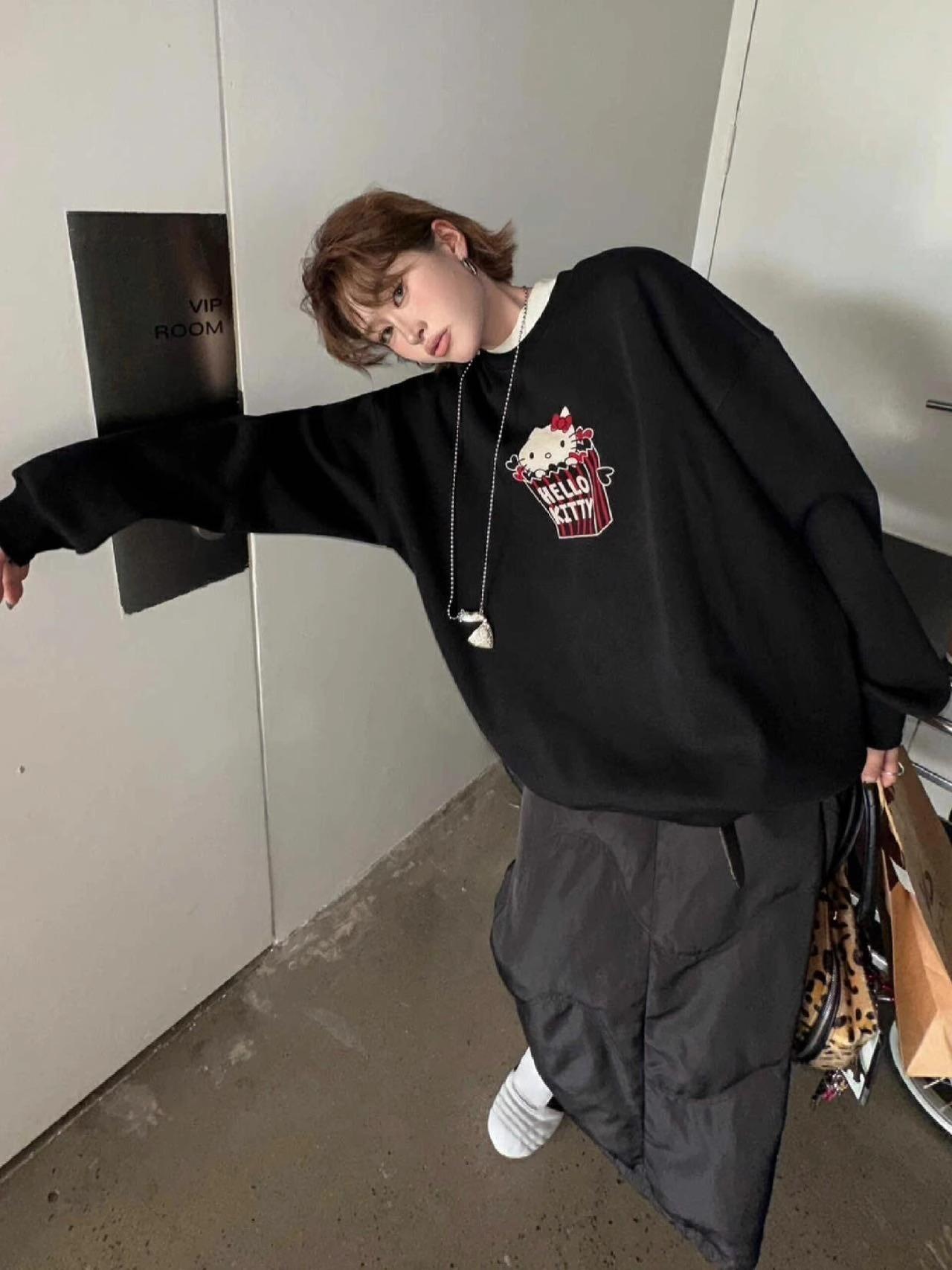 American Retro Niche Style Cartoon Kitty Cat Print Loose round Neck Fleece-Lined Sweater Female Spring & Fall Lazy Style Top