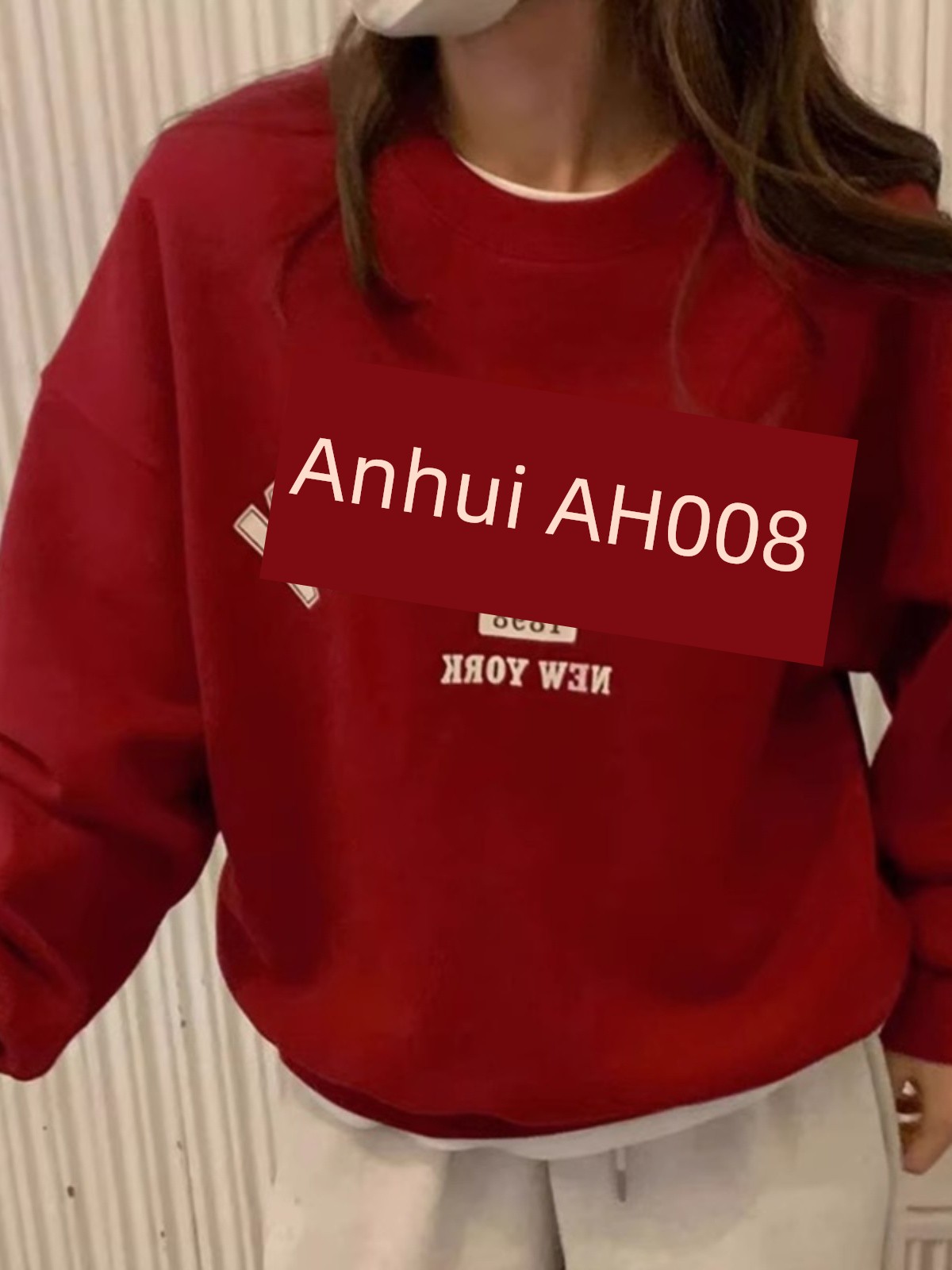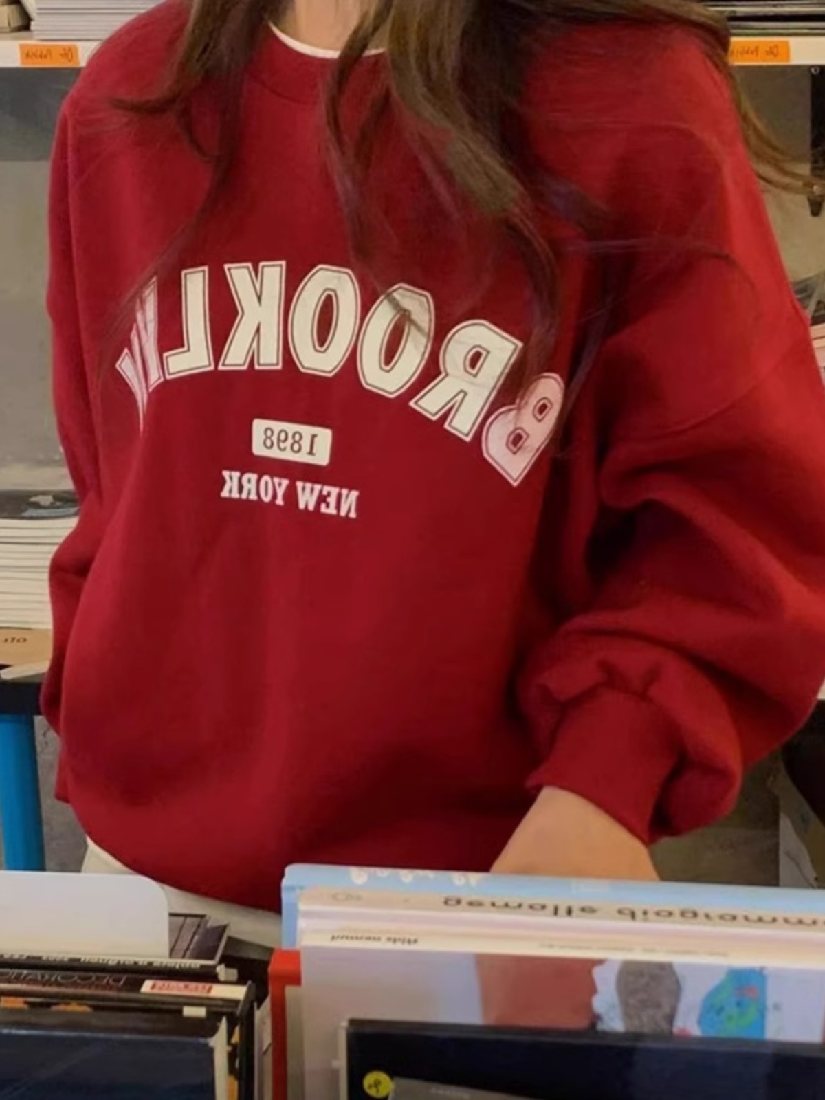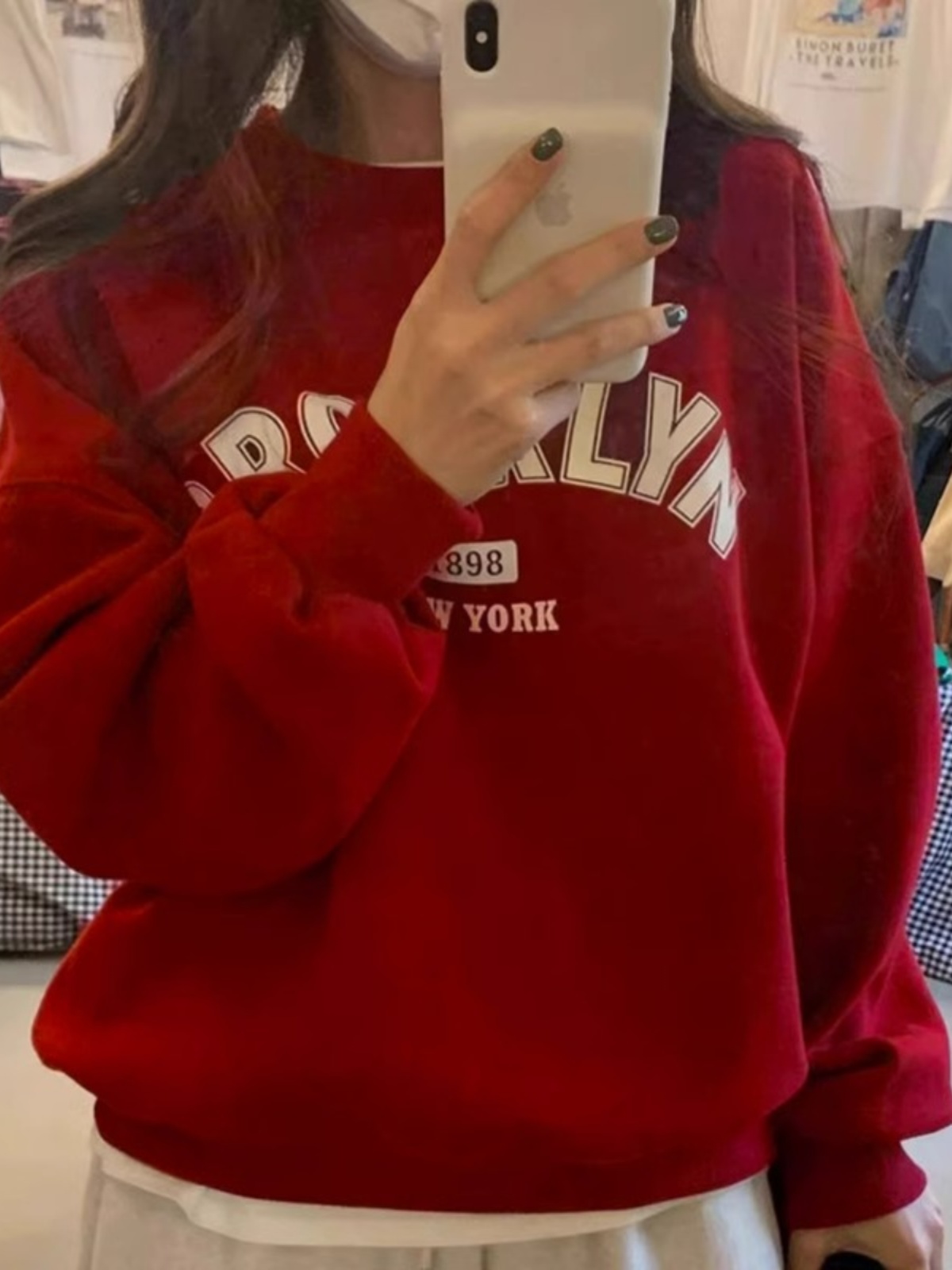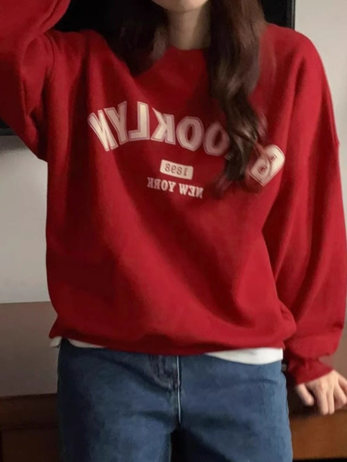 American Retro Oversize Sweatshirt Women round Neck Spring and Autumn 2025 Stylish Minority All-Match Red Tops