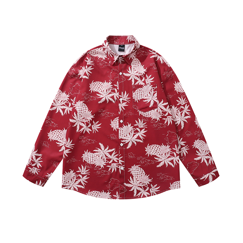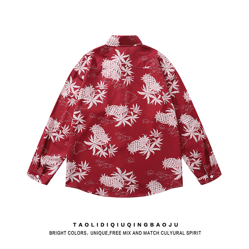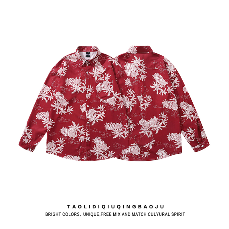 American Retro Pineapple Full Printed Red Shirt Women's Autumn Loose BF Lovers Wild Drape Long Sleeve Shirt Coat