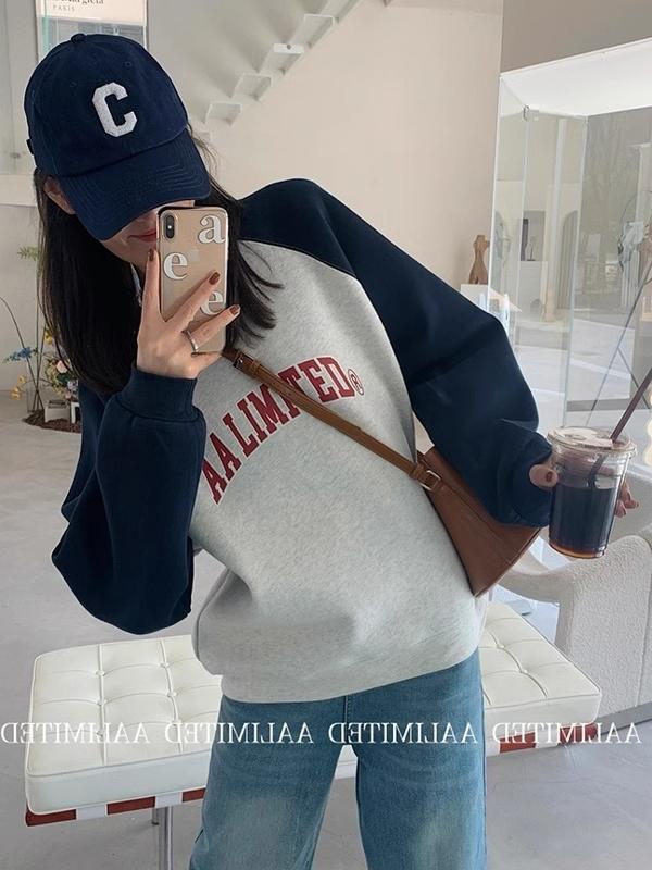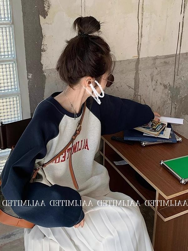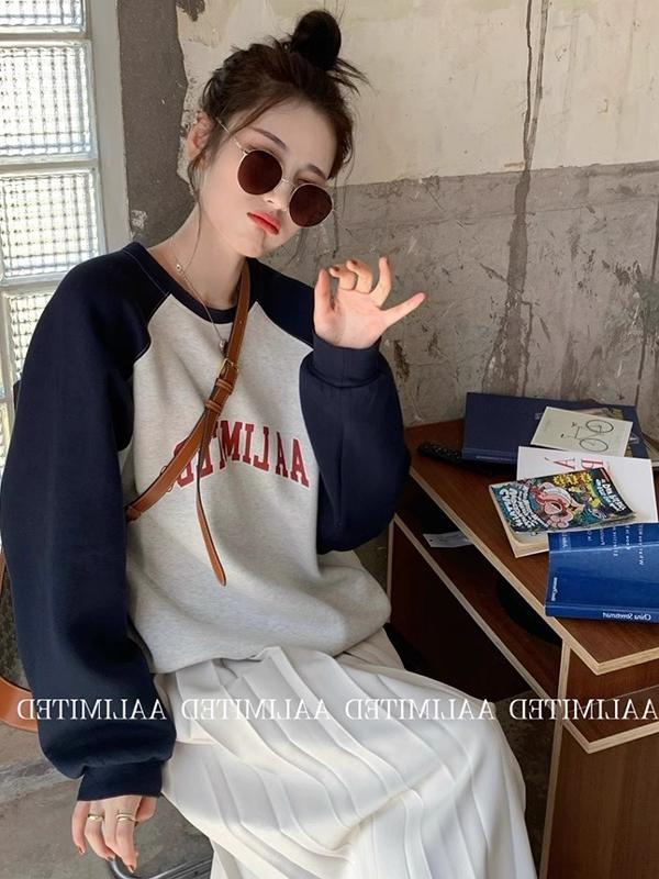 American Retro Raglan Long Sleeve Crew Neck Sweater Women's Spring and Autumn Small Fancy Lazy Chic Shoulder Tops