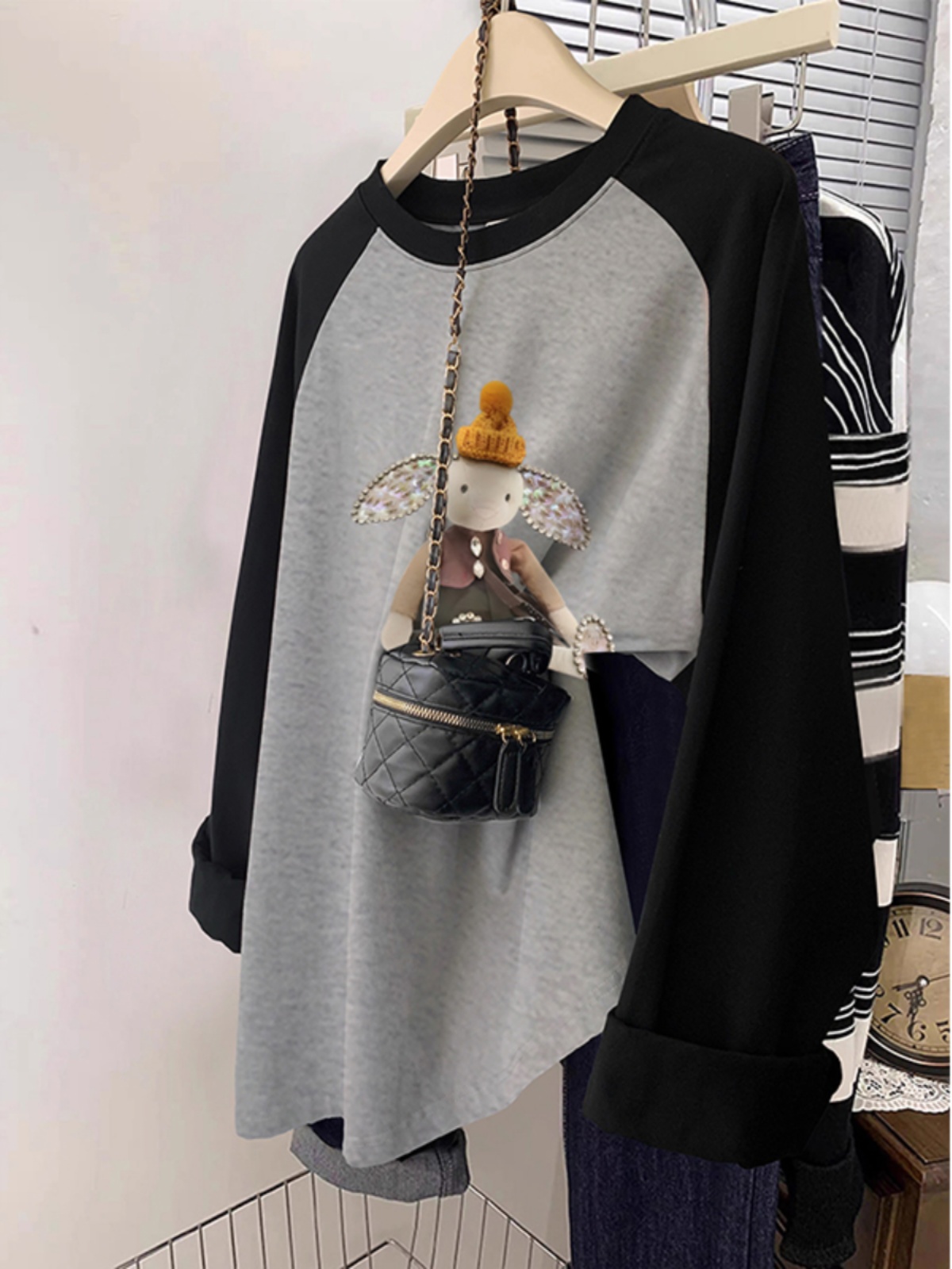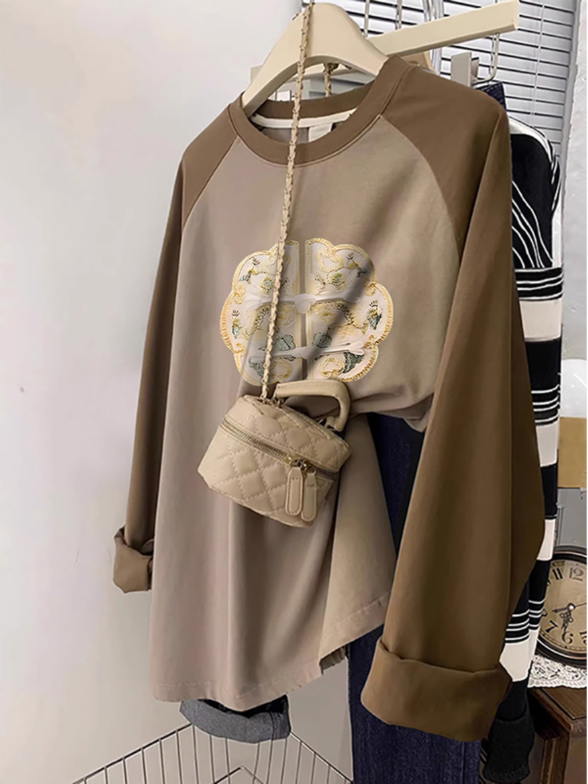 American Retro Raglan Long Sleeves T-Shirt Women's Fall and Winter Brushed New Arrival Plus Size Plus Size Ladies Slim Looking Inner Bottoming Shirt Tops