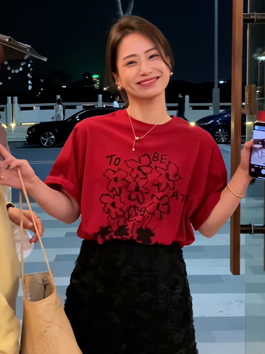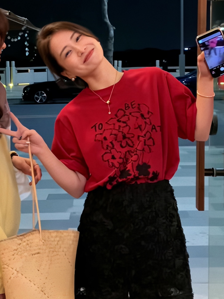 American Retro Red round-Neck Printed Half Sleeve 2025 Summer New Pure Cotton Short Sleeve T-Shirt Female Stylish Niche Style