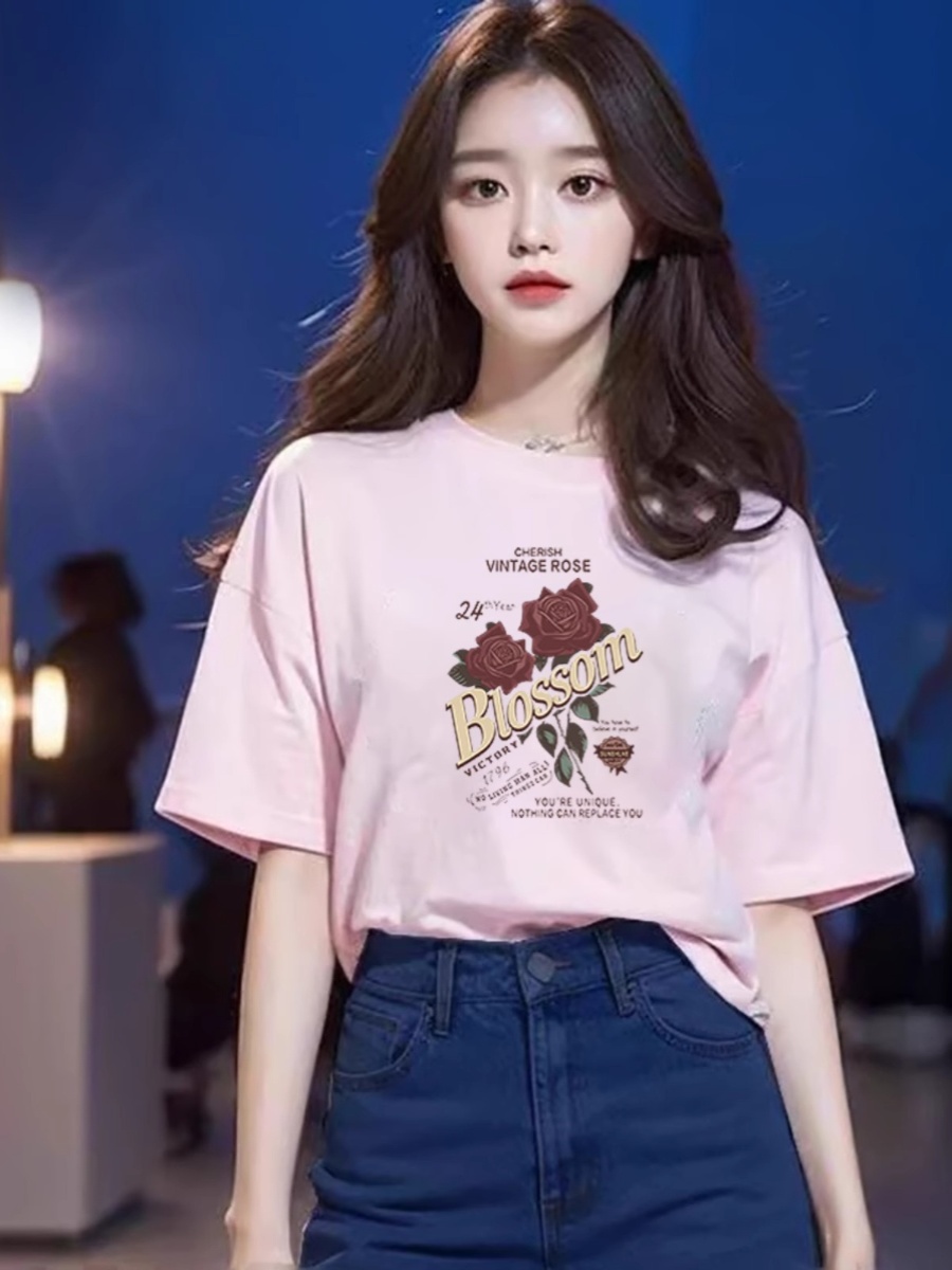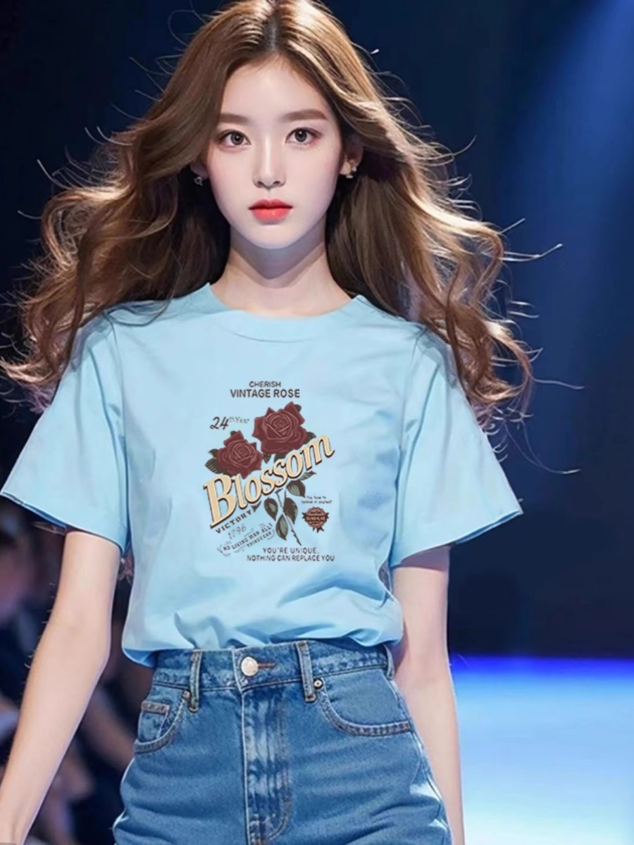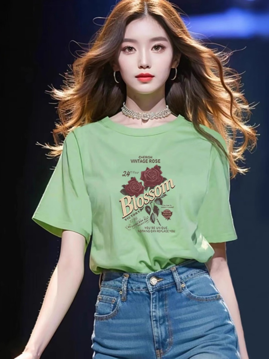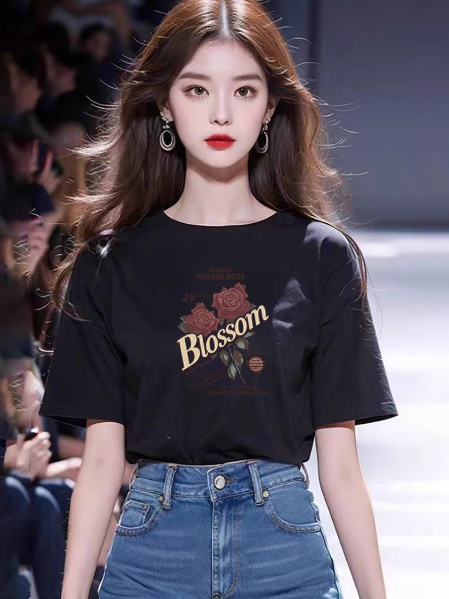 American Retro Rose Letter Print Short-Sleeve White T-shirt Female Summer New K-style Pure Cotton Niche Style round Neck Tops