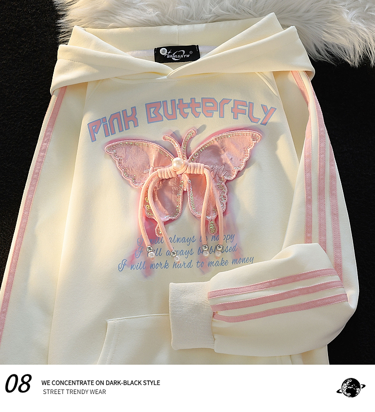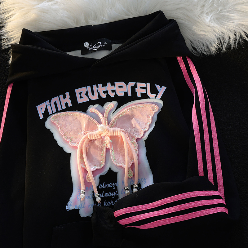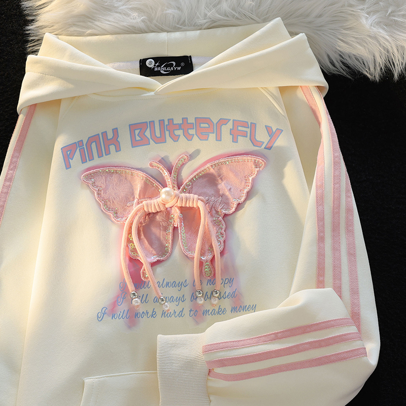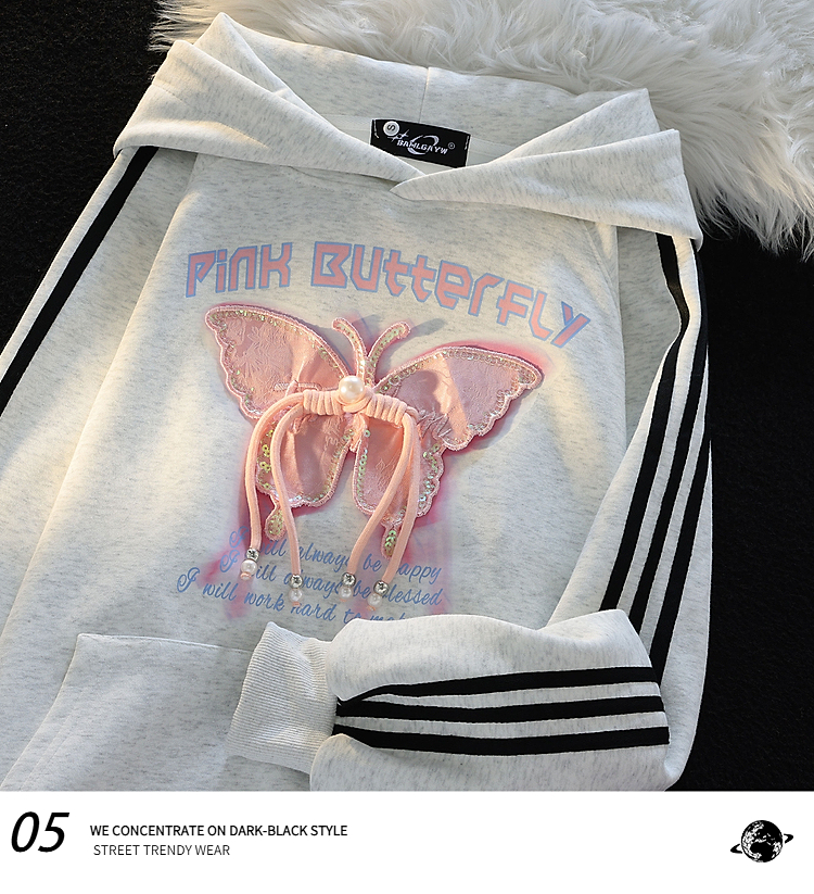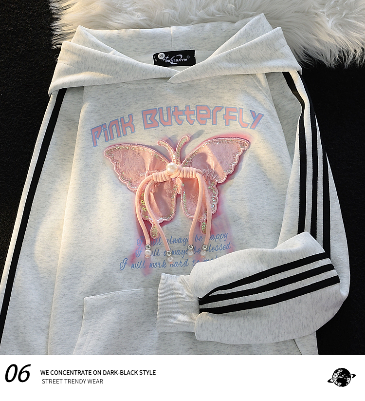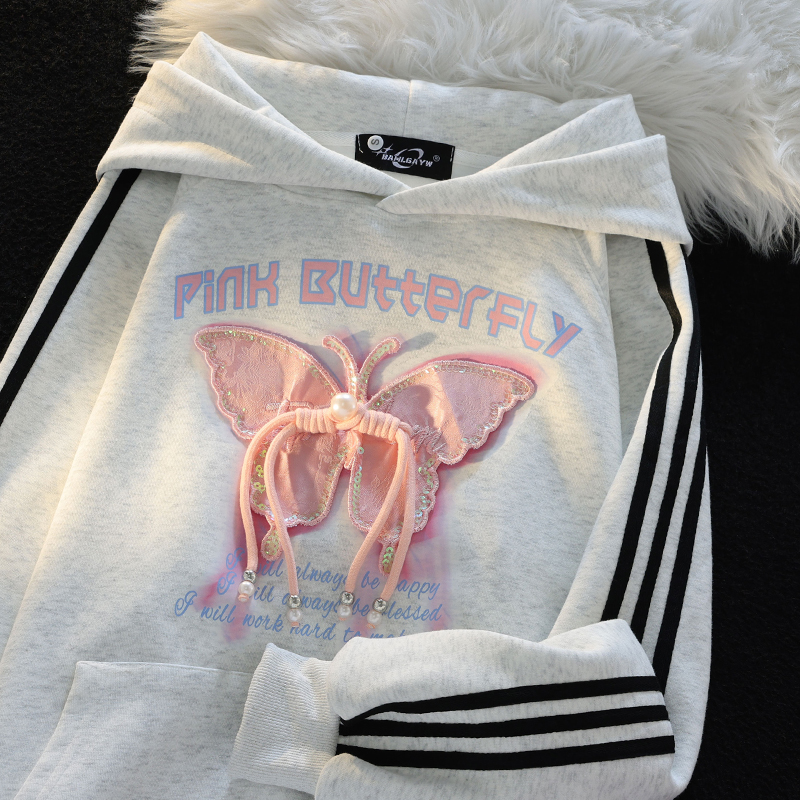 American Vintage Butterfly Embroidery Hoodie Women's Autumn Loose Lazy Chic Couple Style Gray Hooded Outerwear