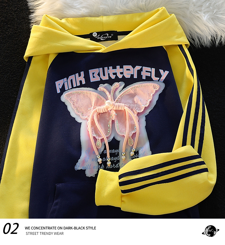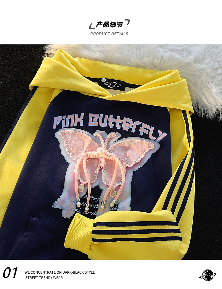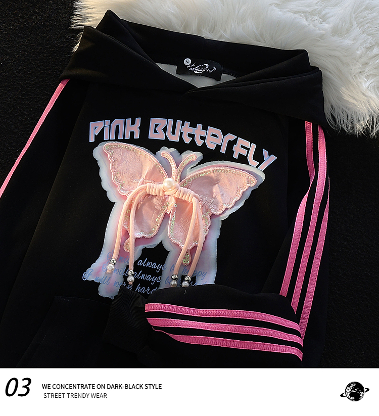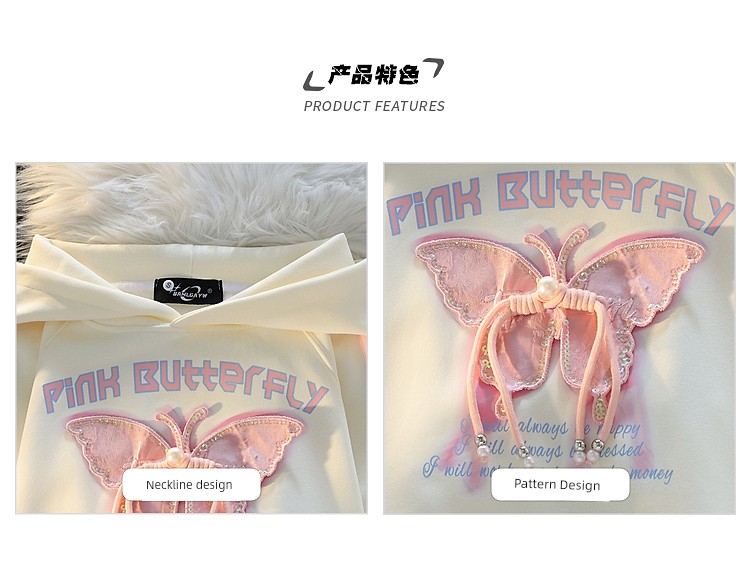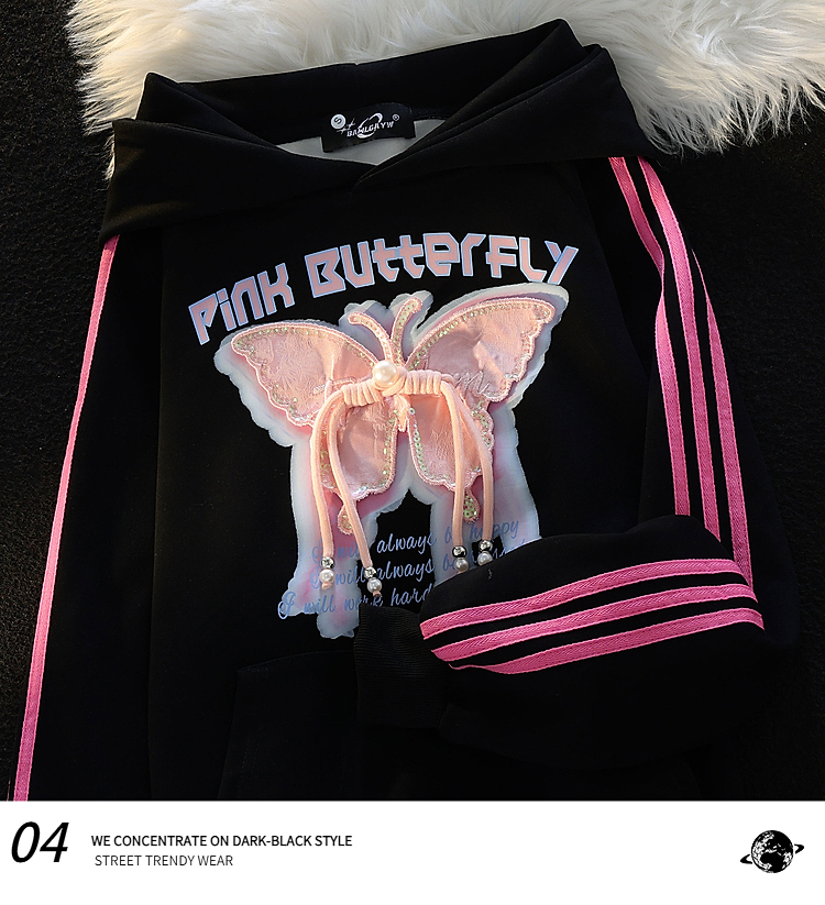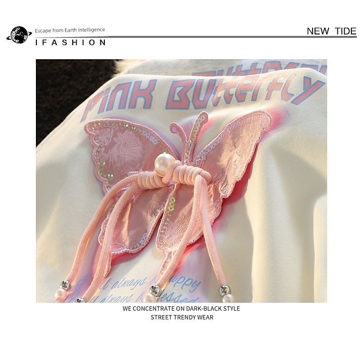 American Vintage Butterfly Embroidery Hoodie Women's Autumn Loose Lazy Chic Couple Style Gray Hooded Outerwear