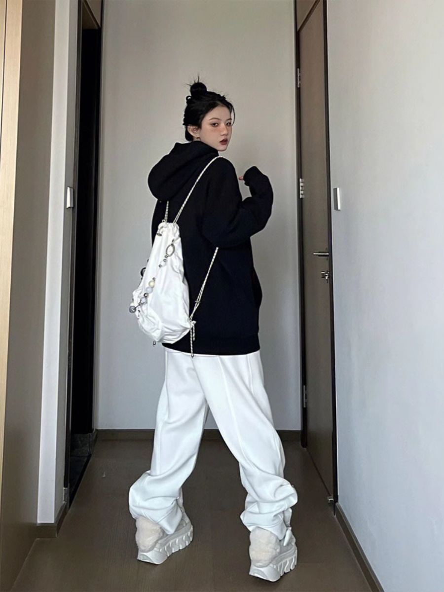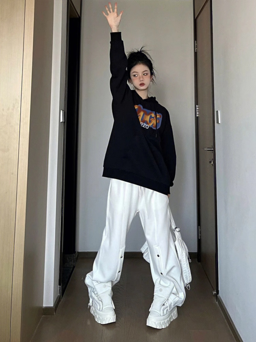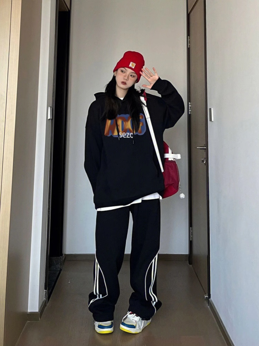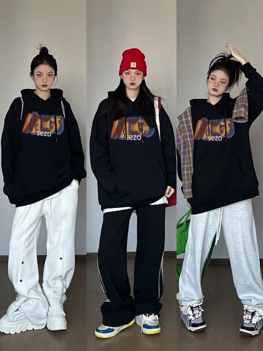 American Vintage Letter Print Black Hoodie for Women - Loose Spring/Autumn Fashion Outerwear