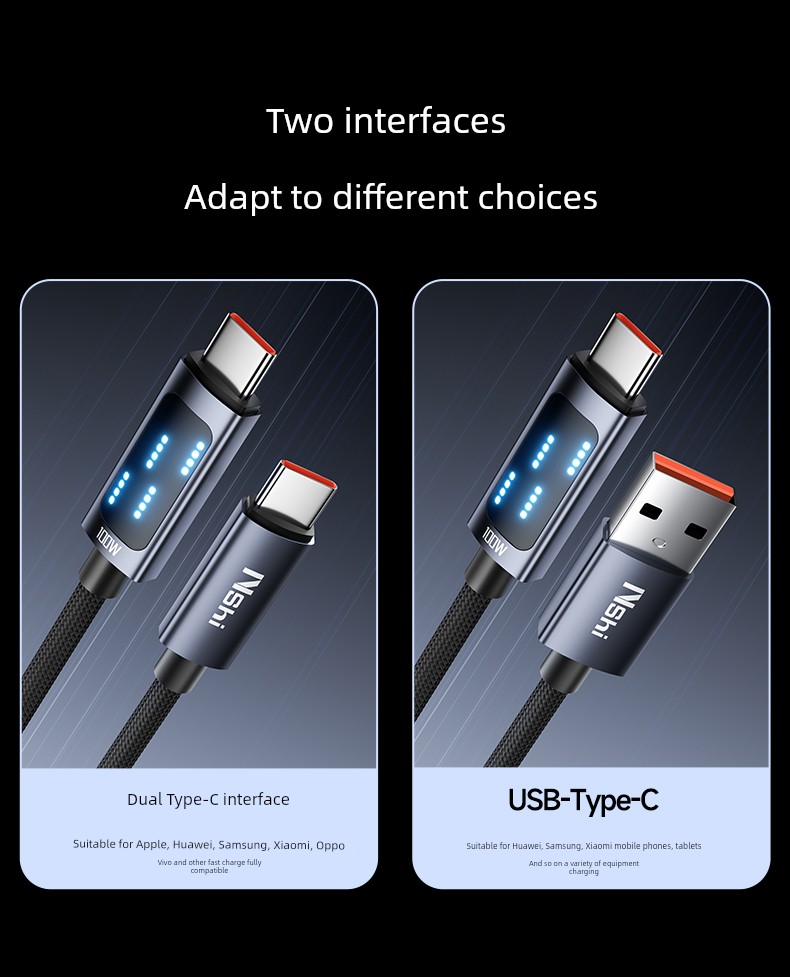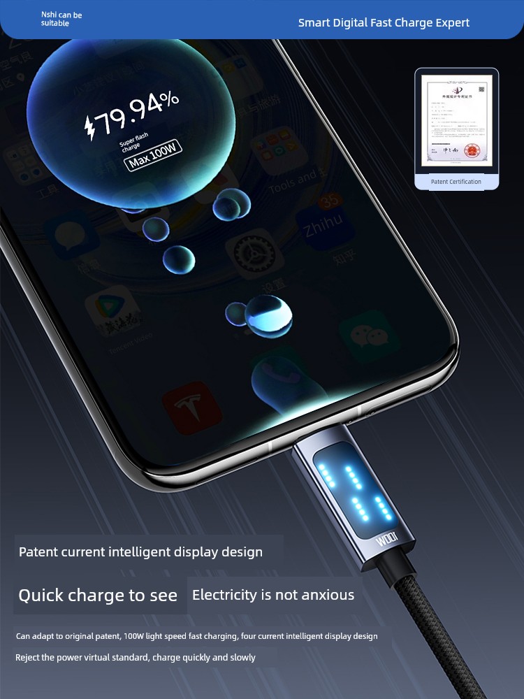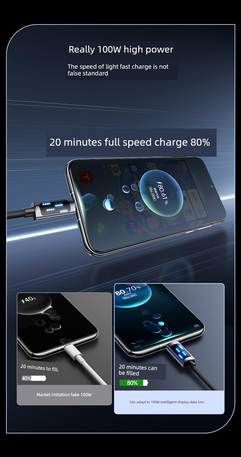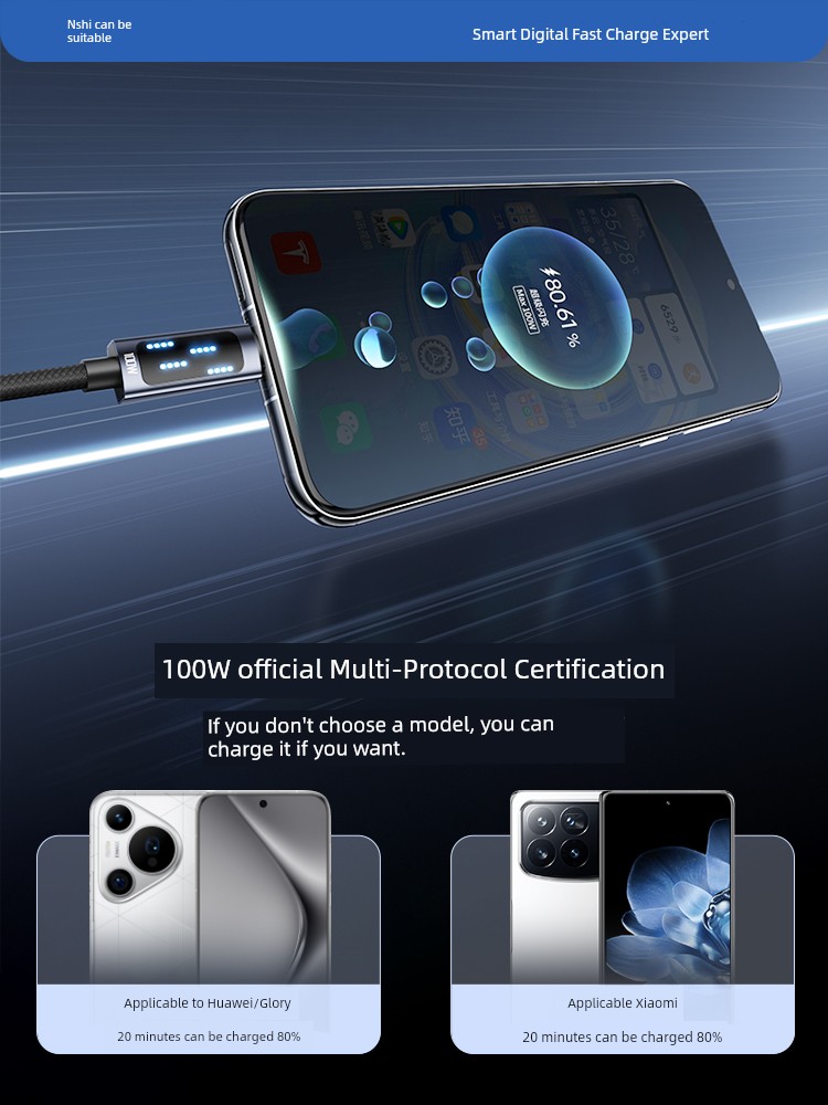 Applicable to 100W Super Fast Charge Data Cable Typec Smart Digital Display for Huawei Honor Xiaomi Oppo Flash Charger Vivo Android Mobile Phone Belt Display Light TPC Charging Cable 66W Punch