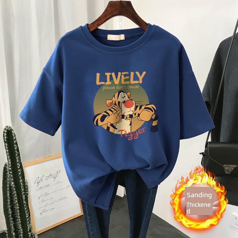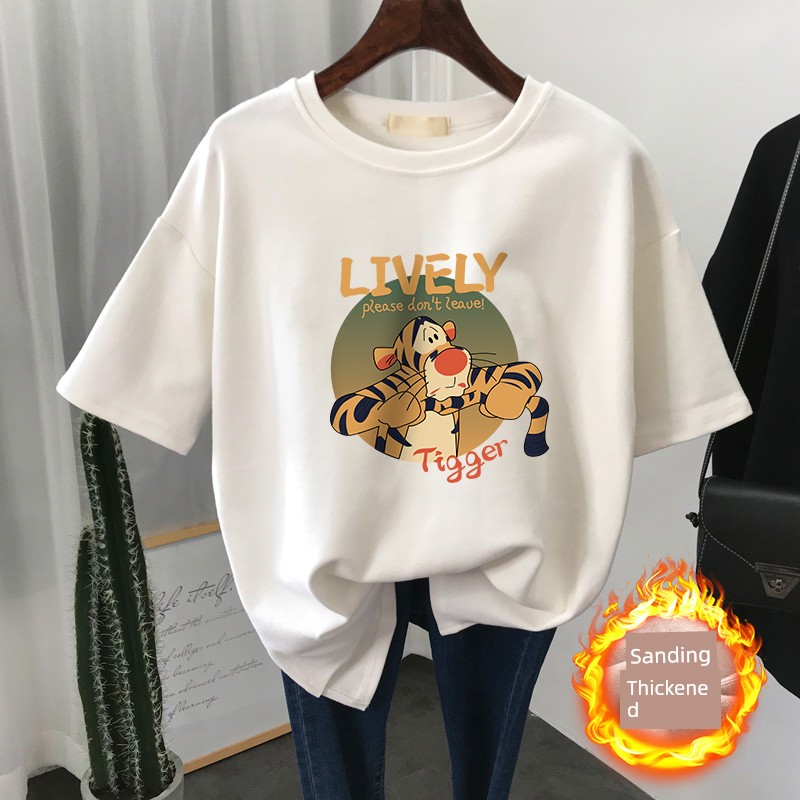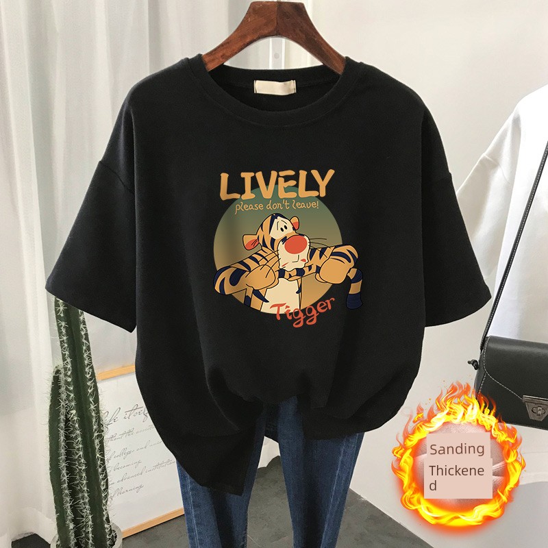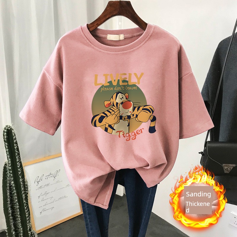 Autumn and Winter Loose Slim Looking Plus Size Ladies Brushed Short Sleeve T-shirt