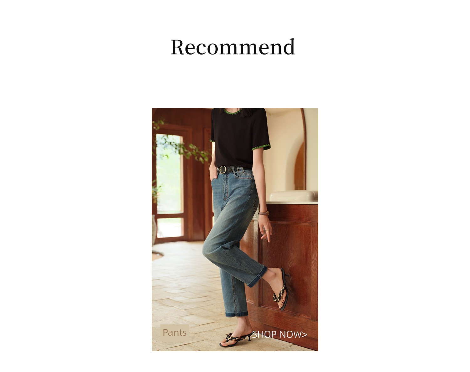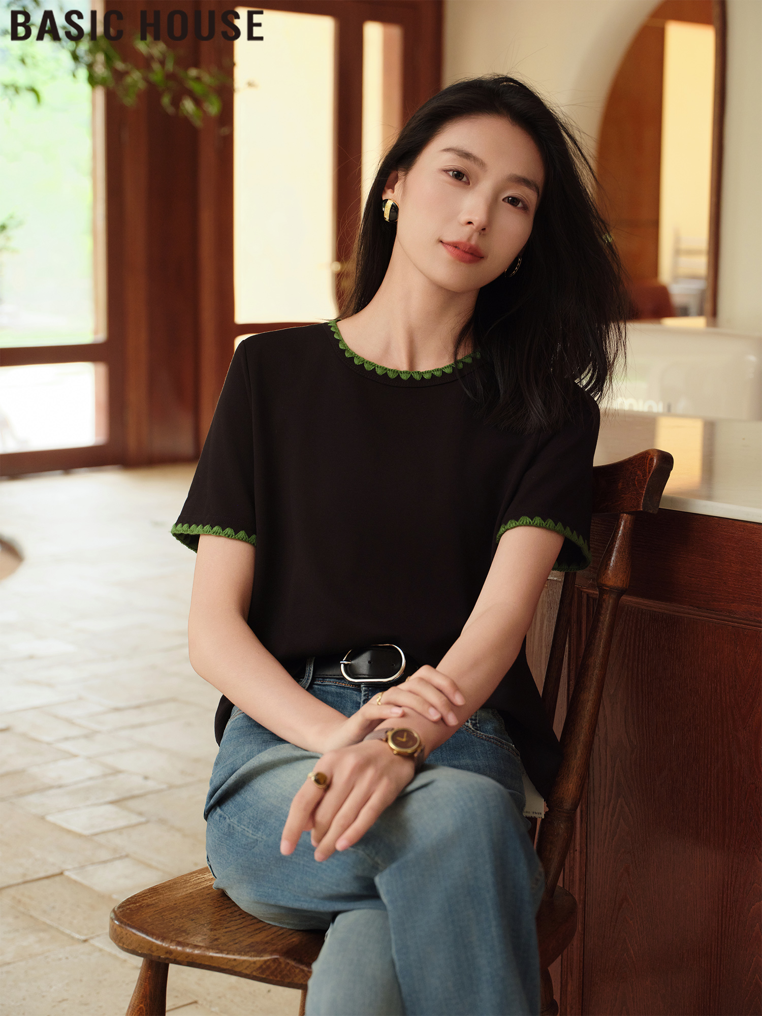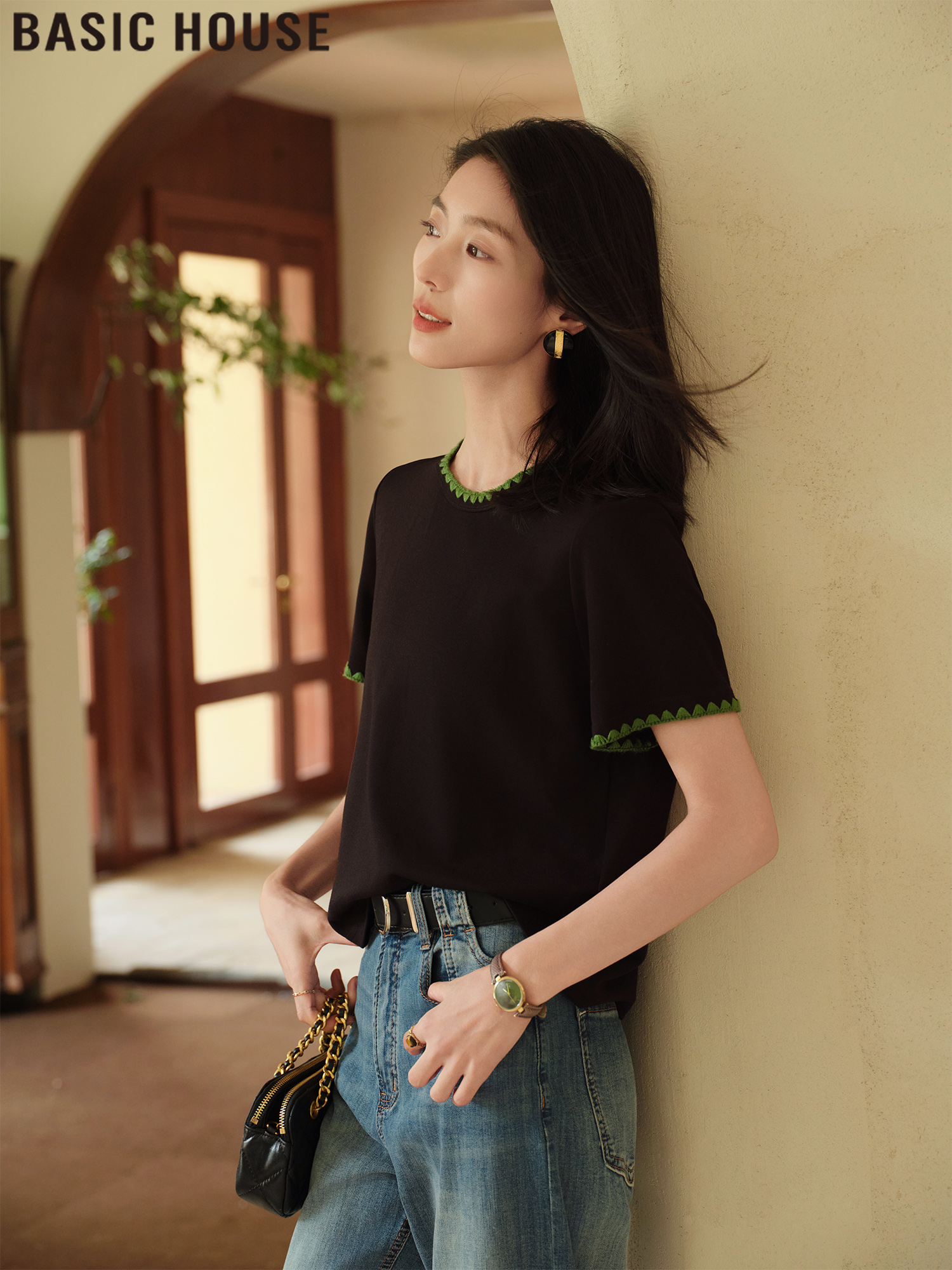 Basic House/Baijiahao Art Rhythm Embroidery Contrast Color Short Sleeve T-shirt Top Female 2025 Summer New Arrival