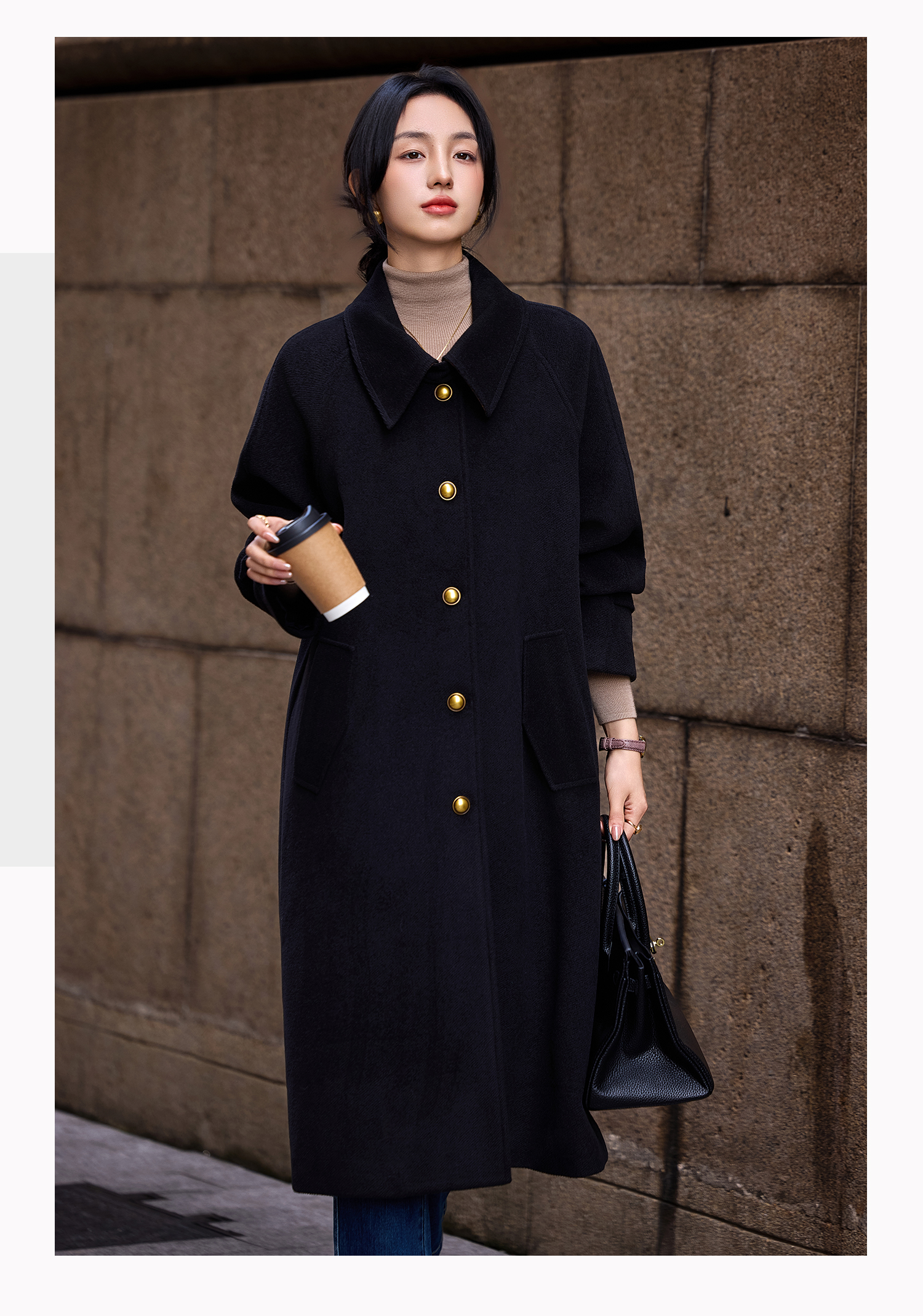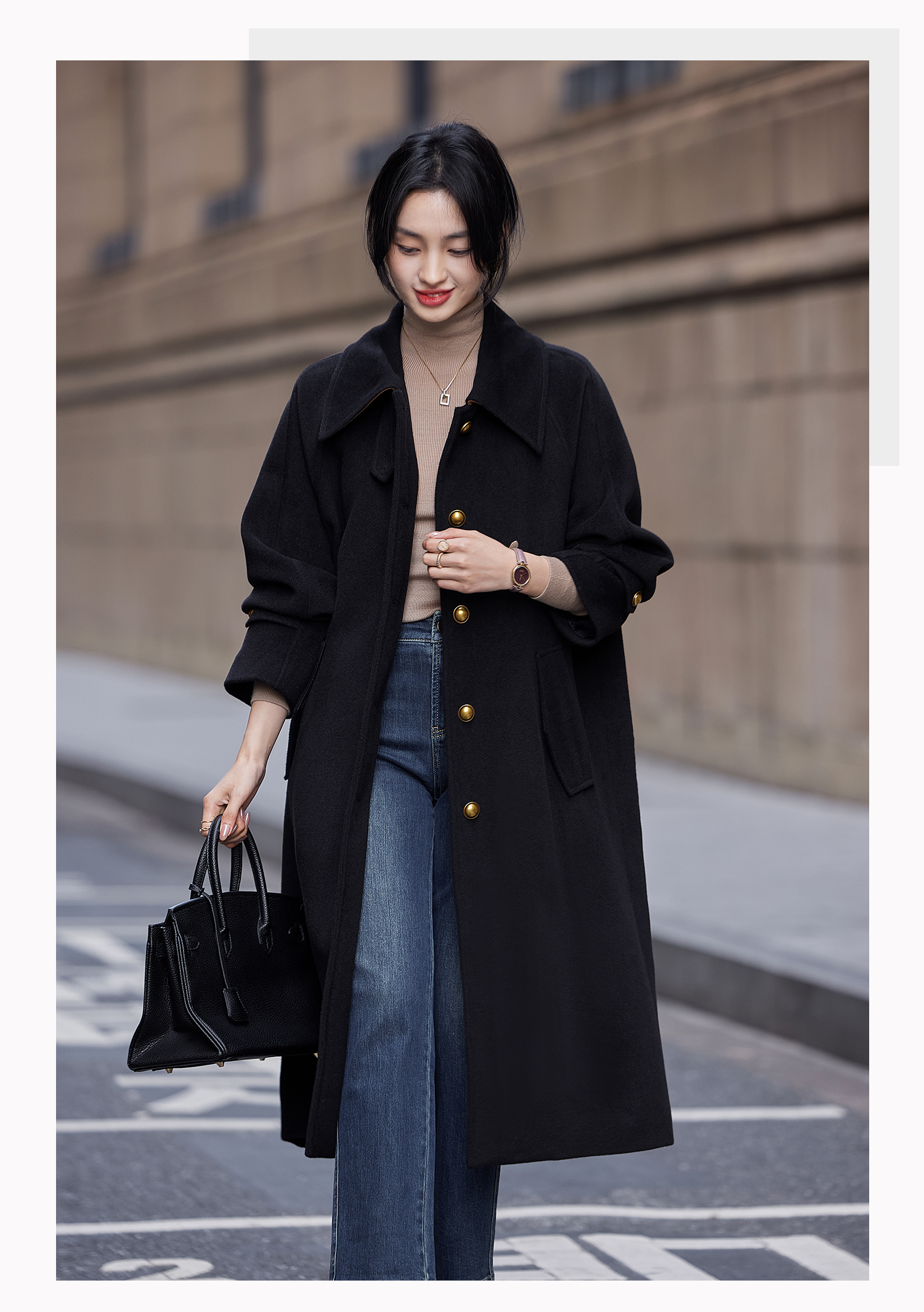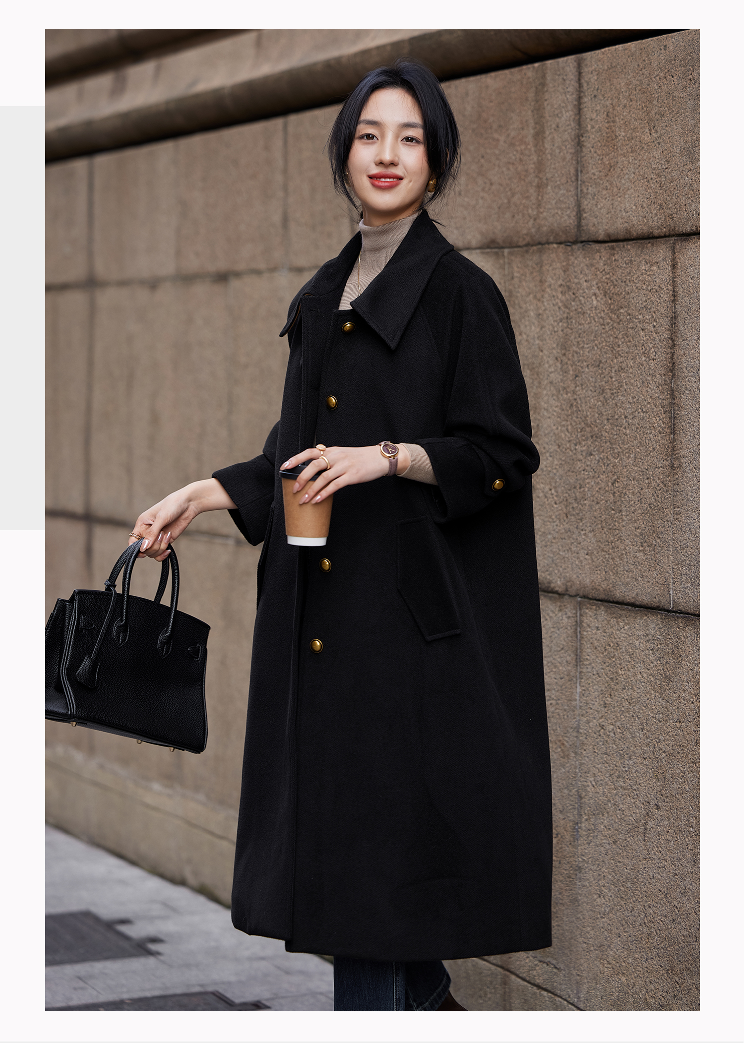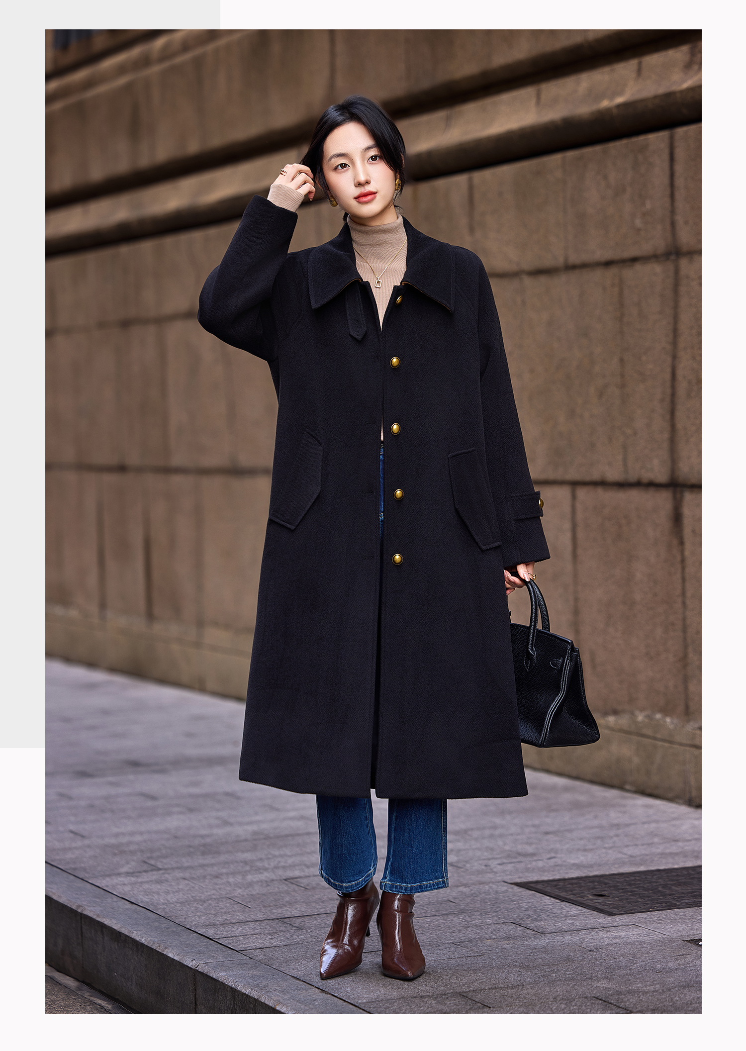 Basic House/Baijiahao Hepburn Wind Black Lapel Woolen Outwear Long Woolen Coat Women's Spring