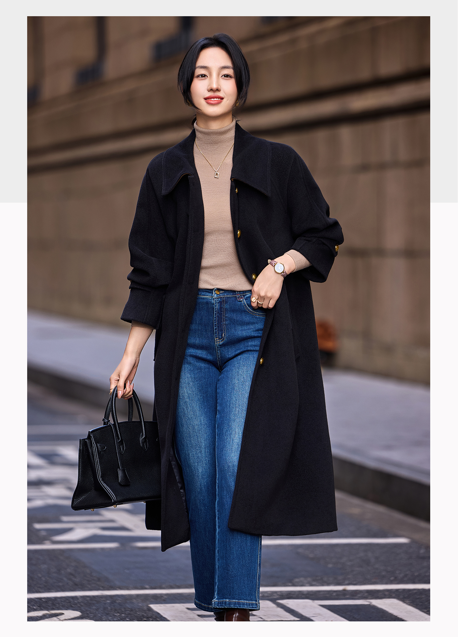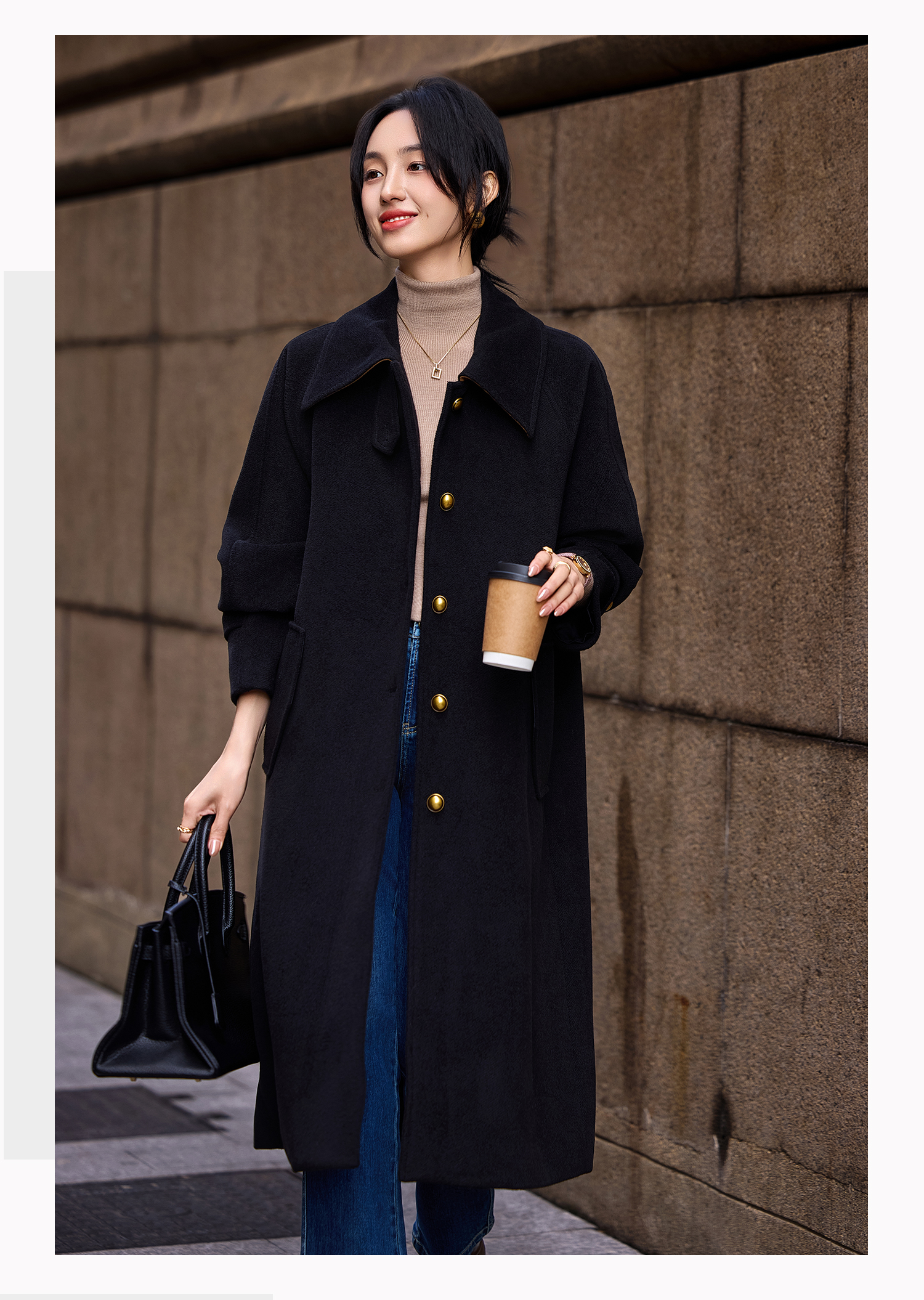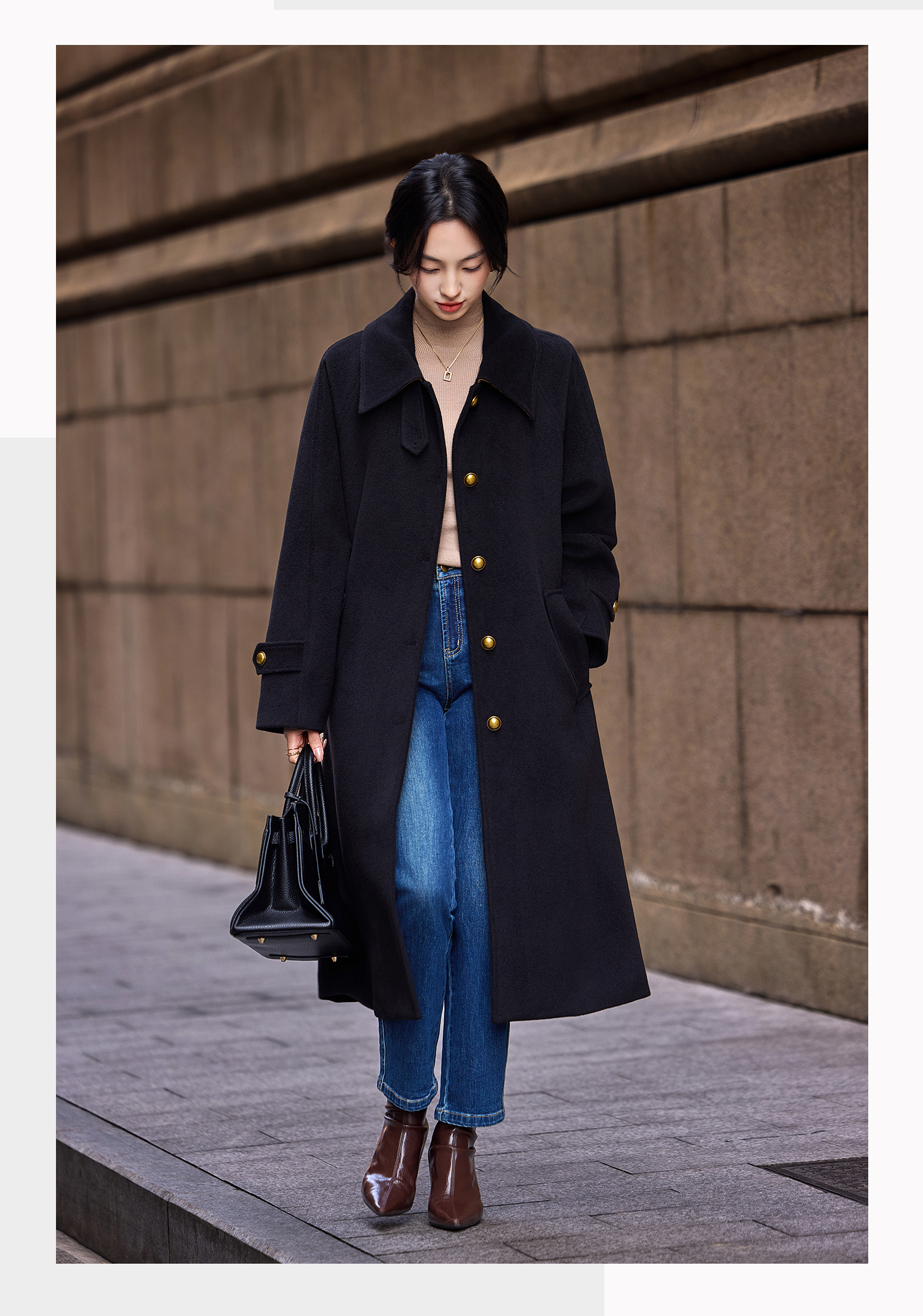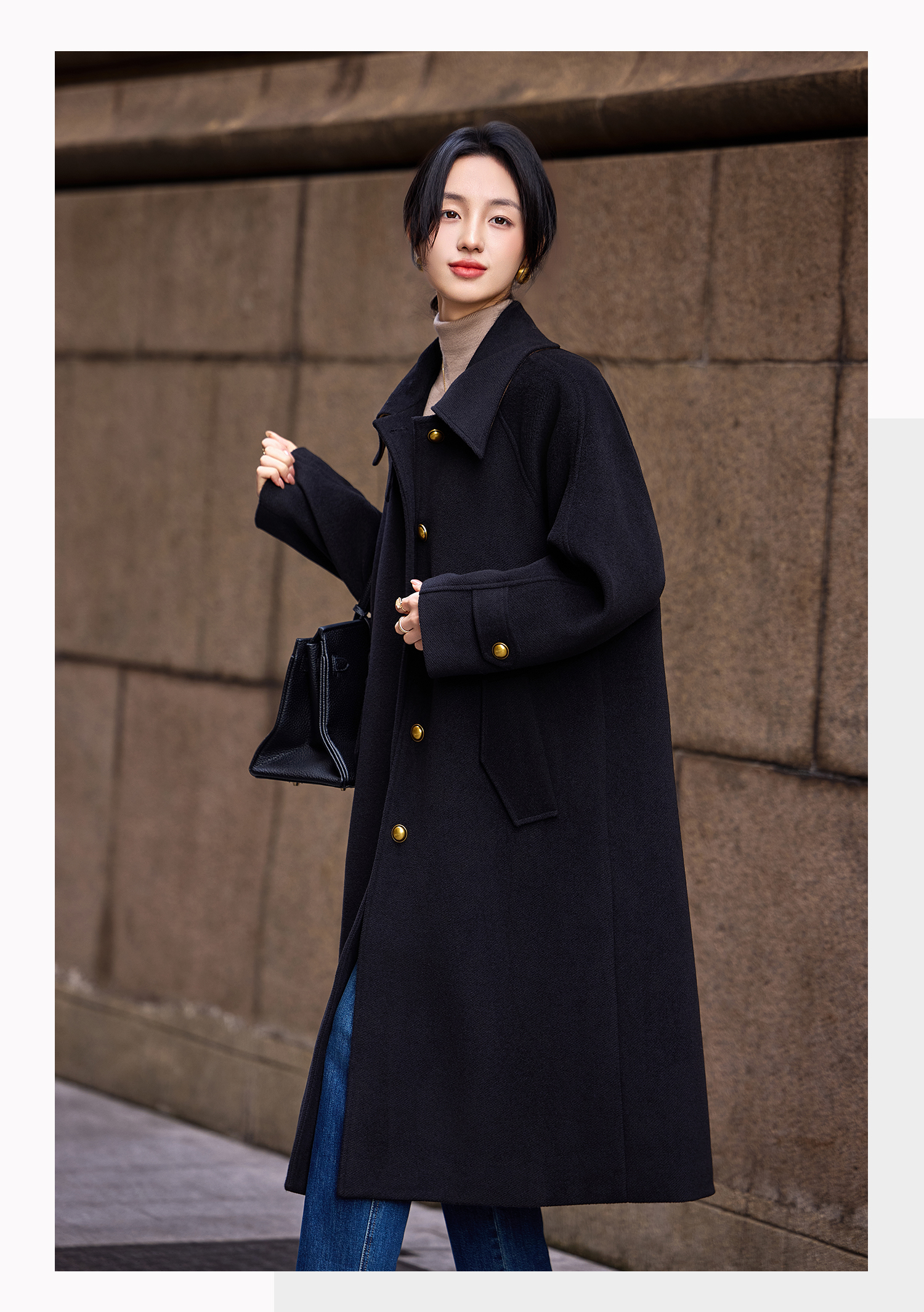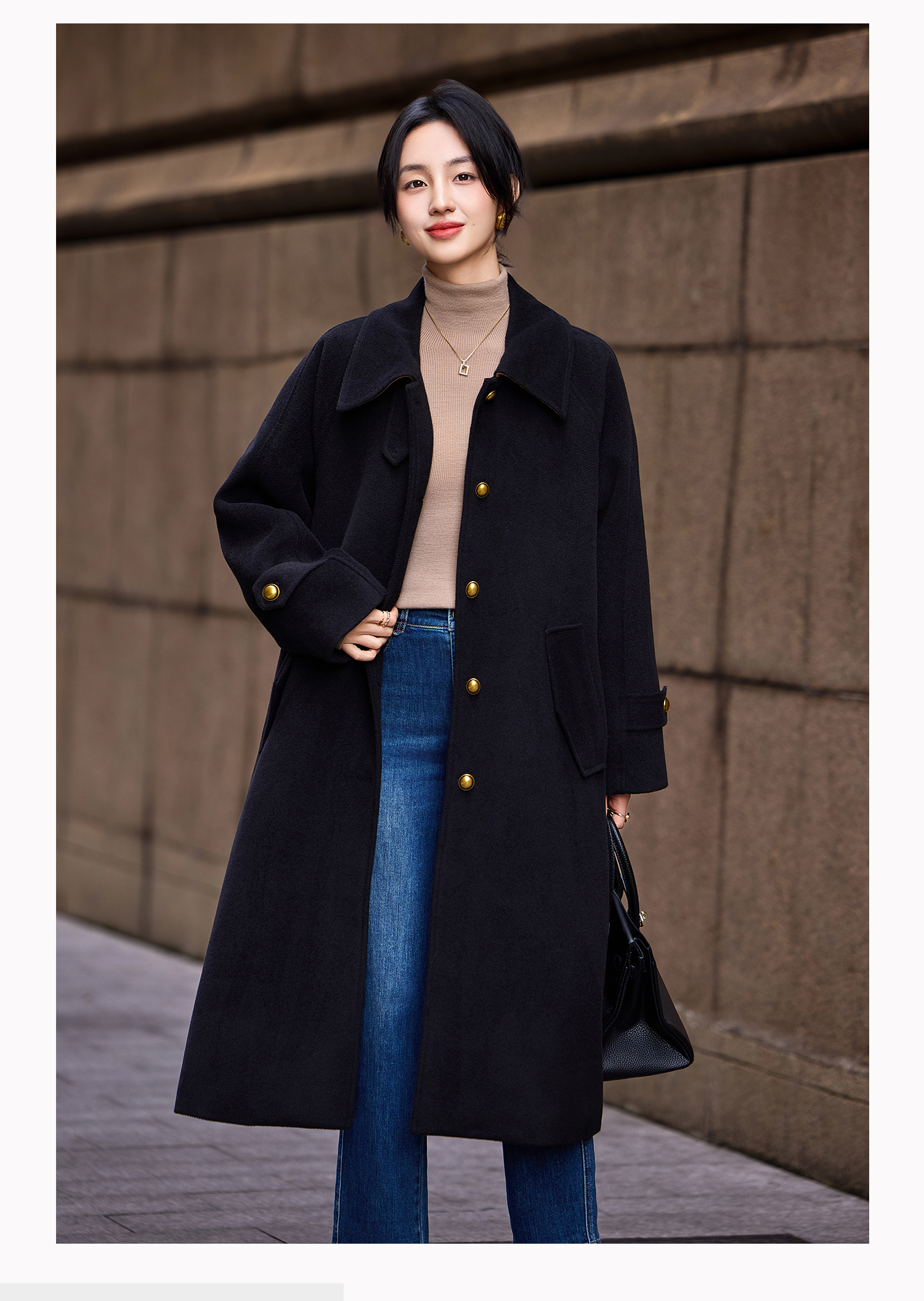 Basic House/Baijiahao Hepburn Wind Black Lapel Woolen Outwear Long Woolen Coat Women's Spring