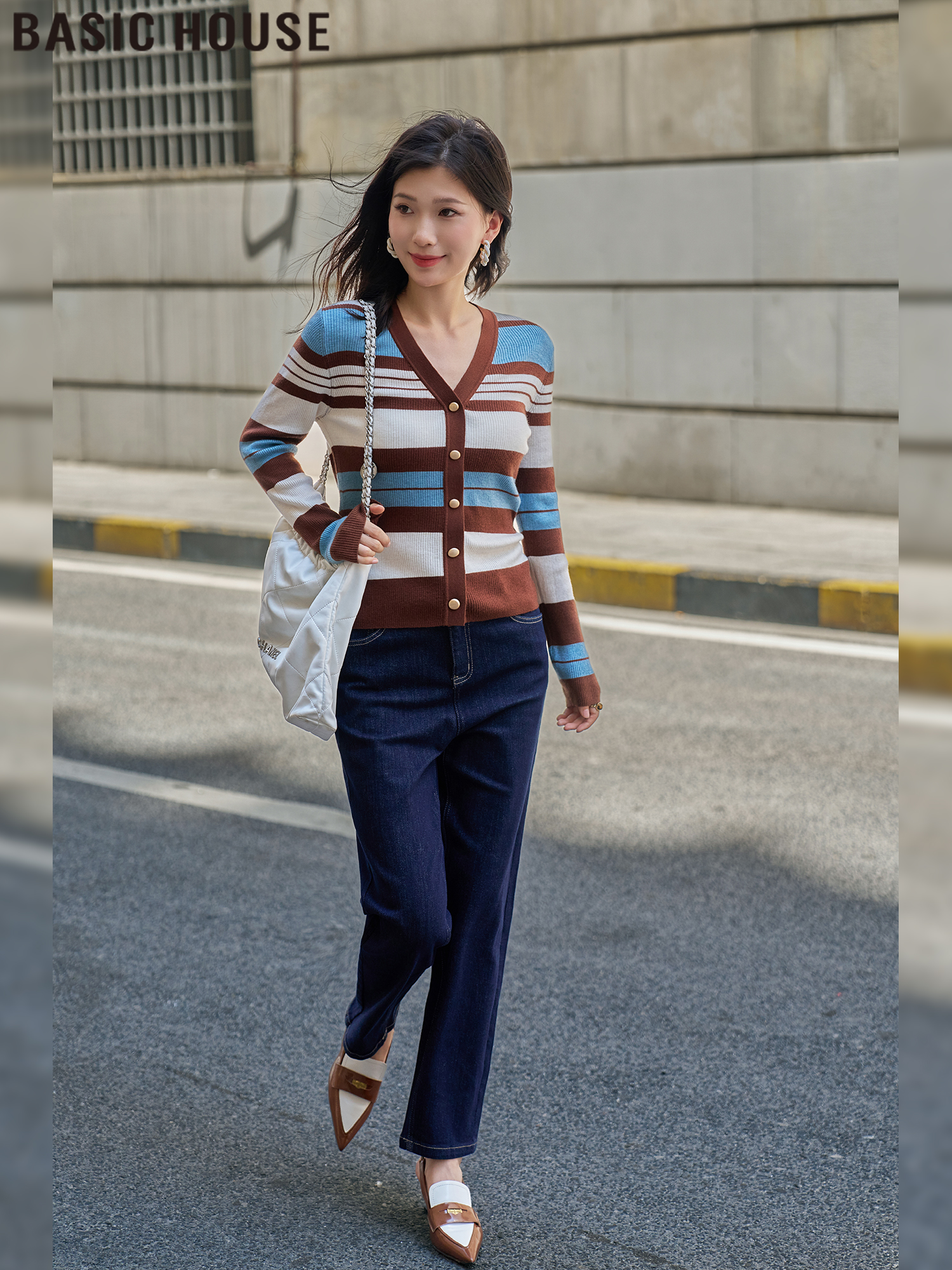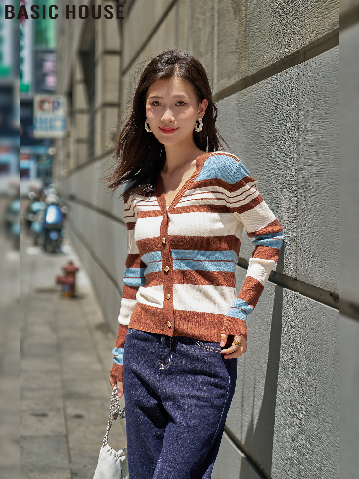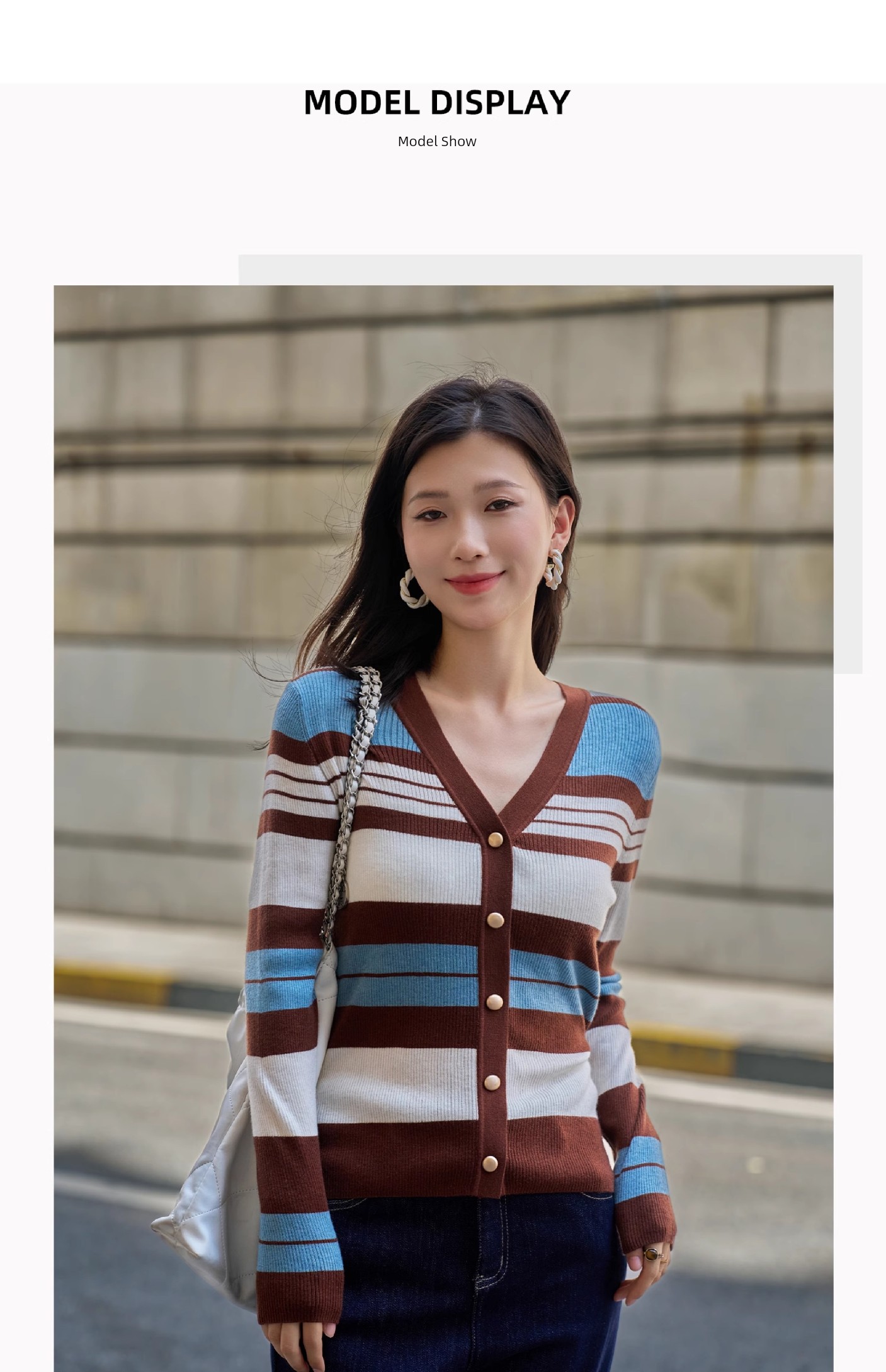 Basic House/Baijiahao V-Collar Contrast Color Striped Short Style Figure Flattering Knit Cardigan Female 2025 Spring New Arrival