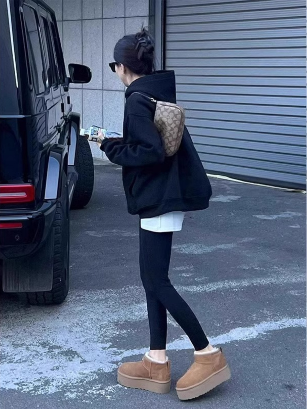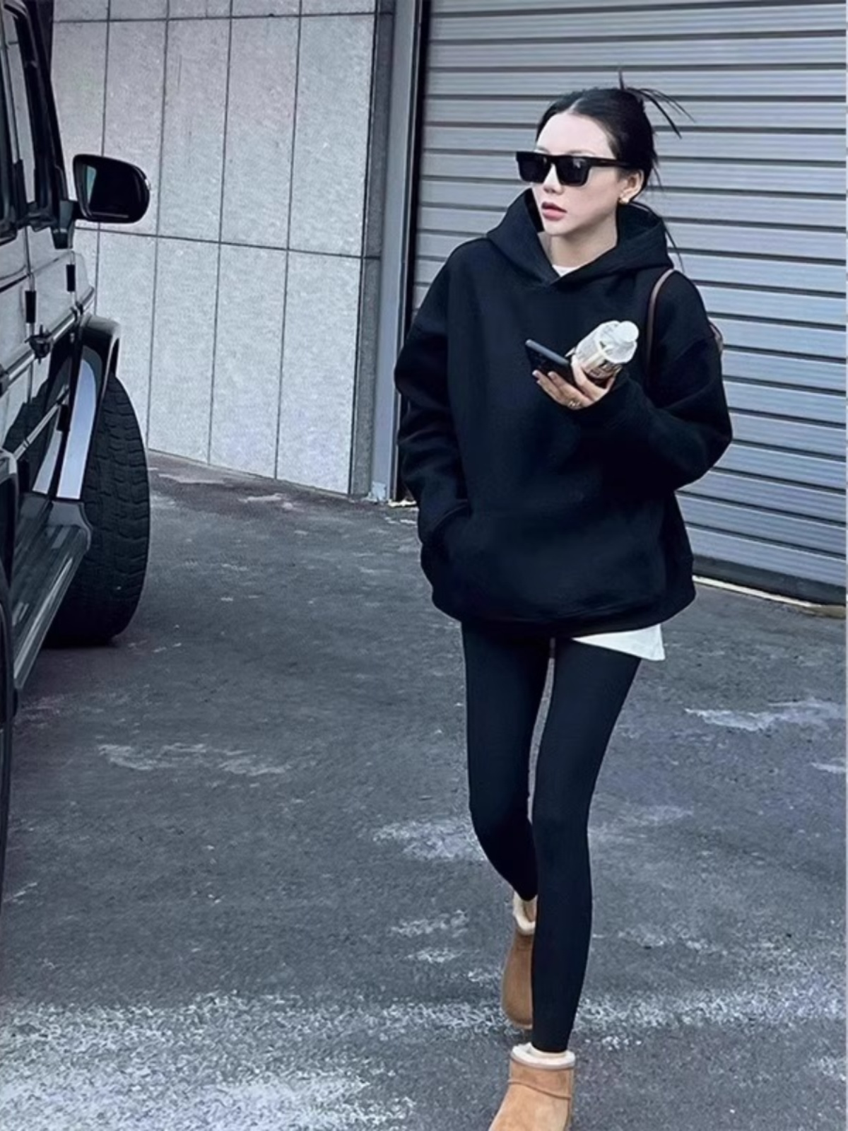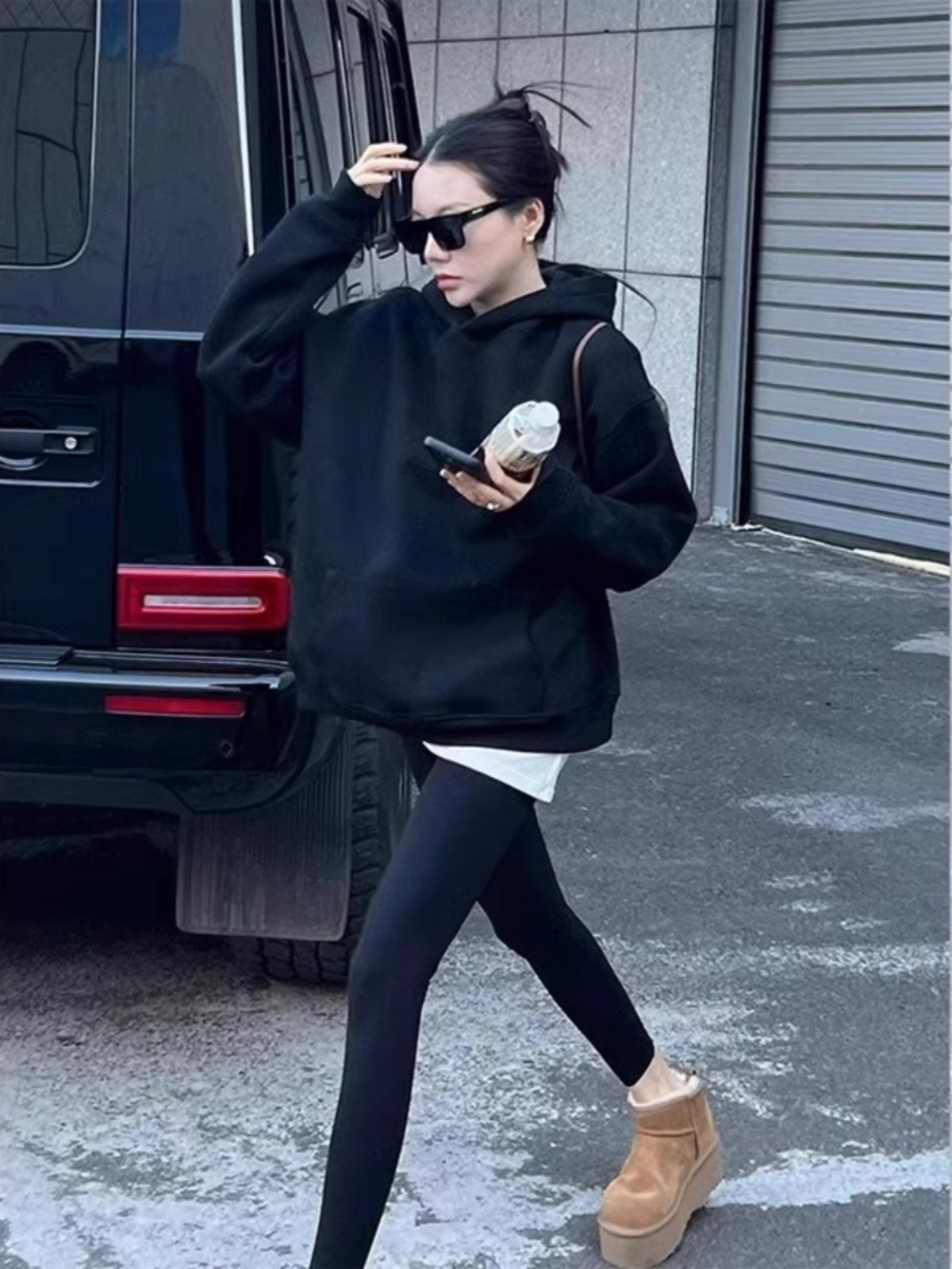 Black Hoodie Women 2025 New Popular Fashion Western Style Spring and Autumn Fleece-lined Thickened Mid-Length Loose Idle Style