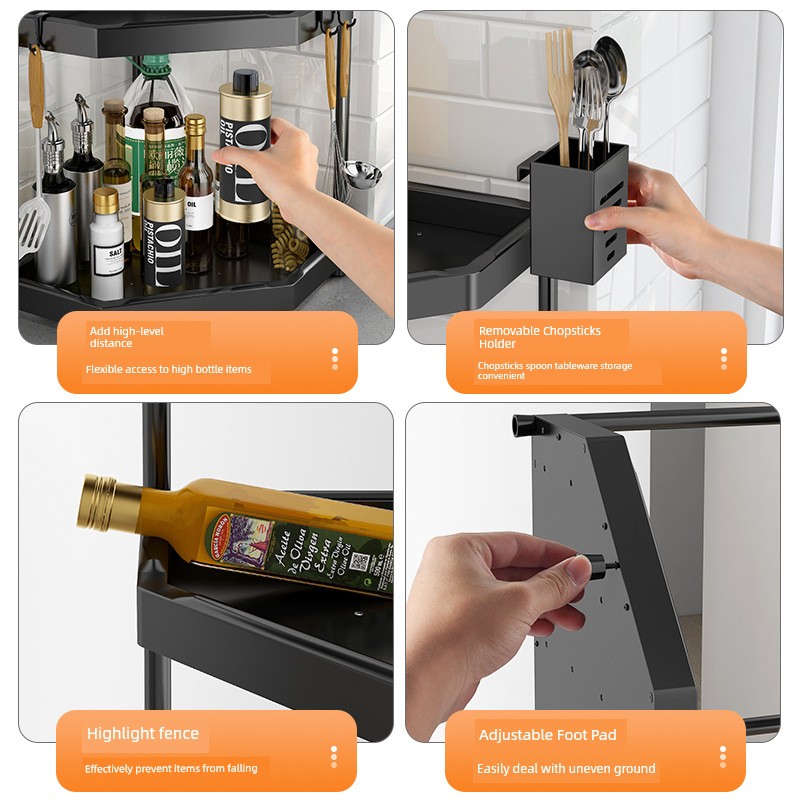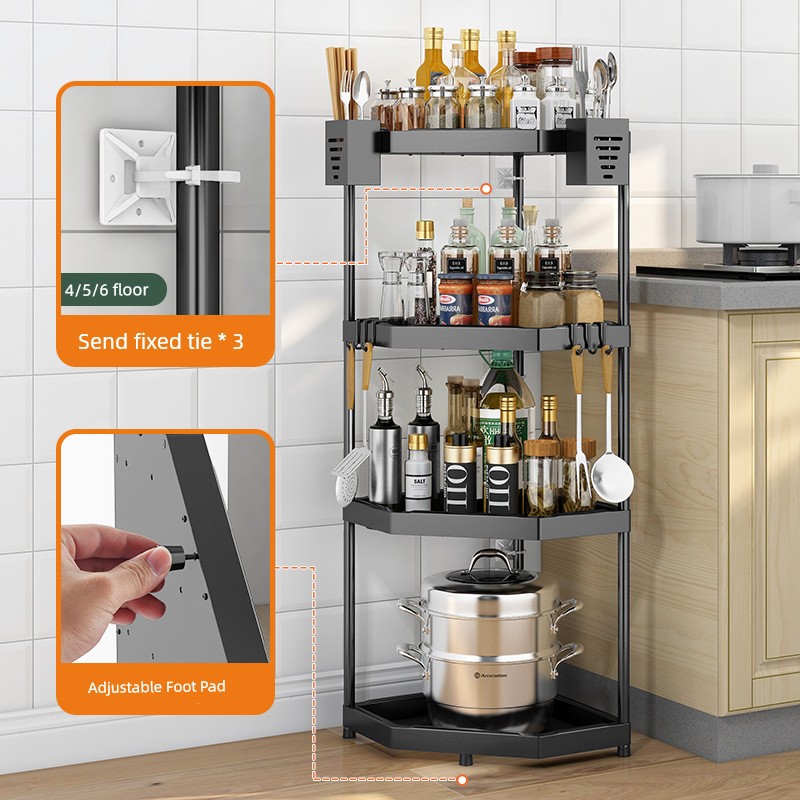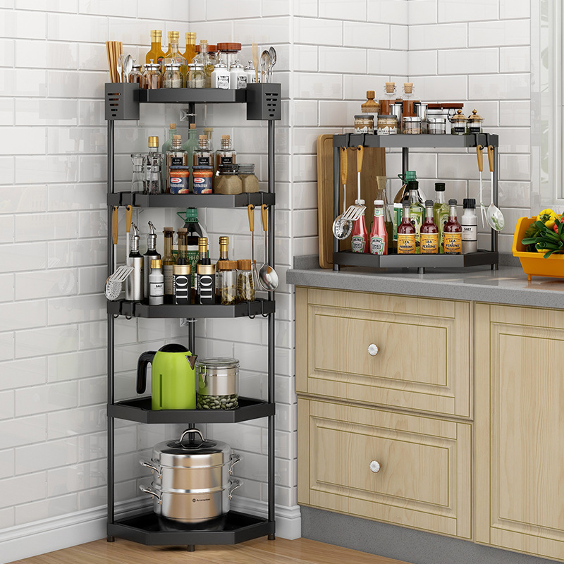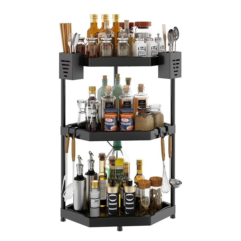 Black Kitchen Corner Storage Rack Tripod Stainless Steel Seasoning Rack Countertop Corner Storage Rack Wall Hanging Punch-Free