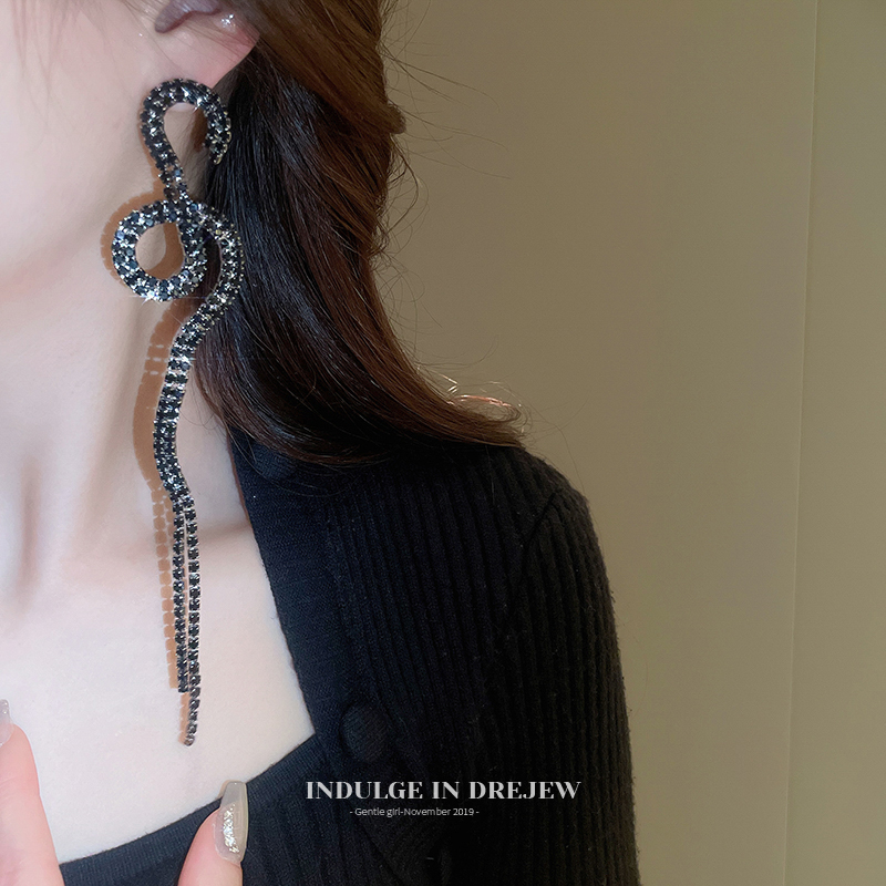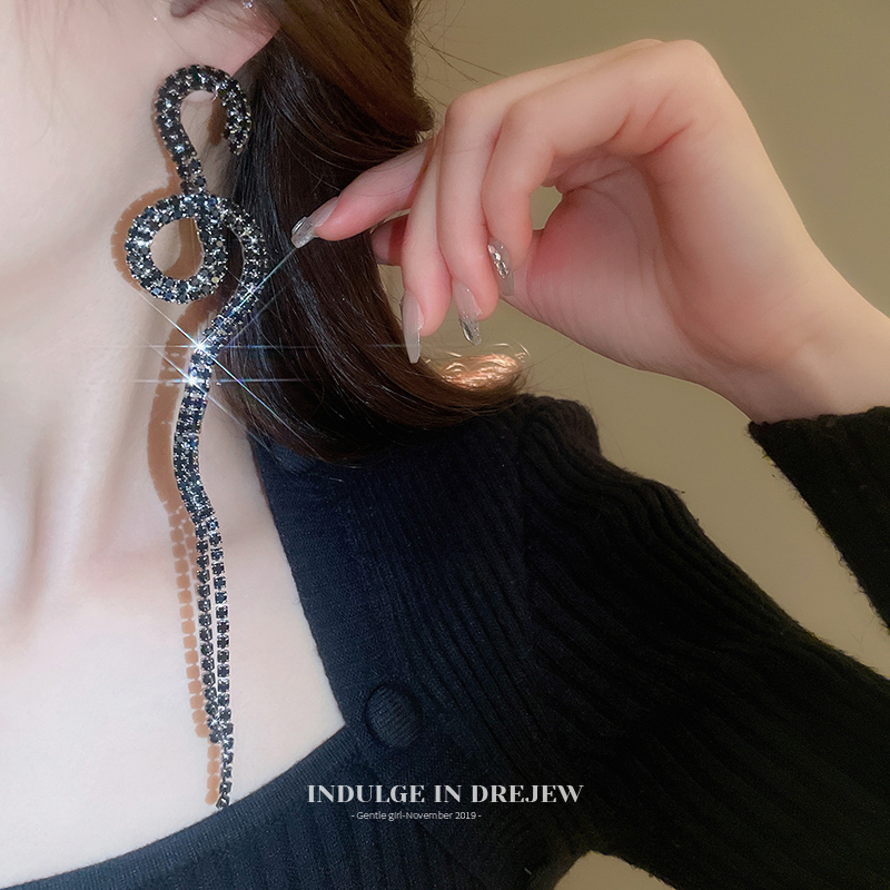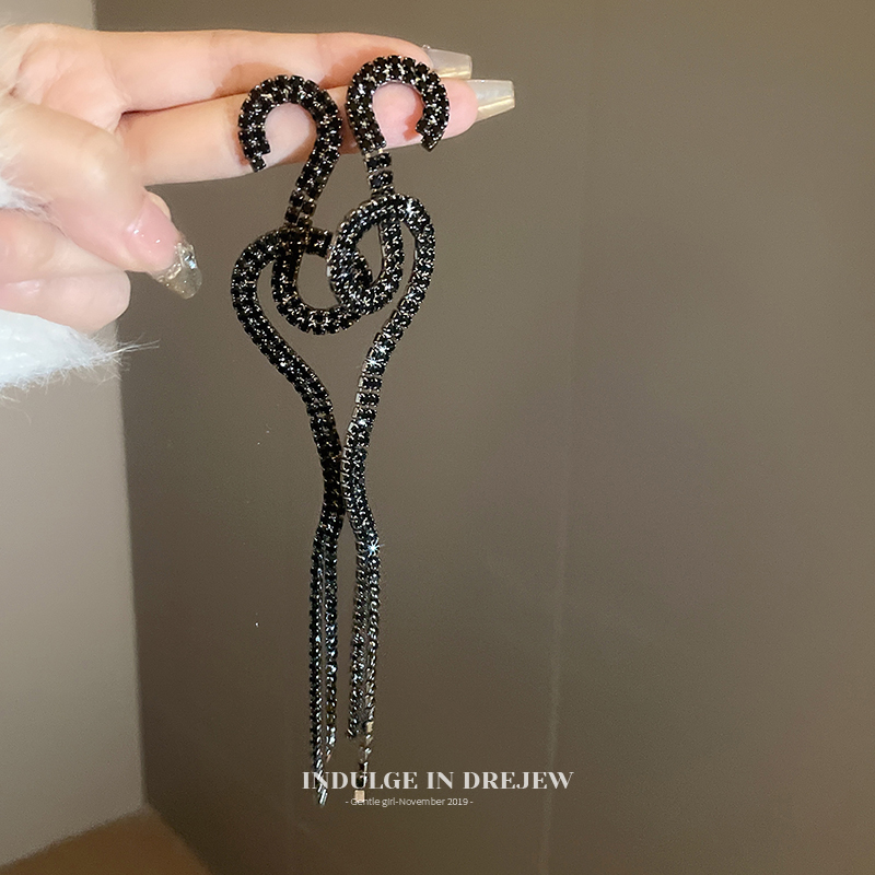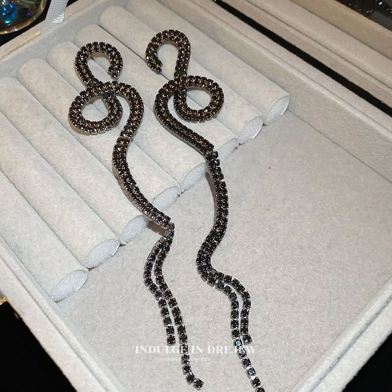 Black & Rhimestone Twisted Tassel Earrings for Women Accessible Luxury Fancy Elegant Earrings Slim Looking Exaggerated Banquet Dress Earrings