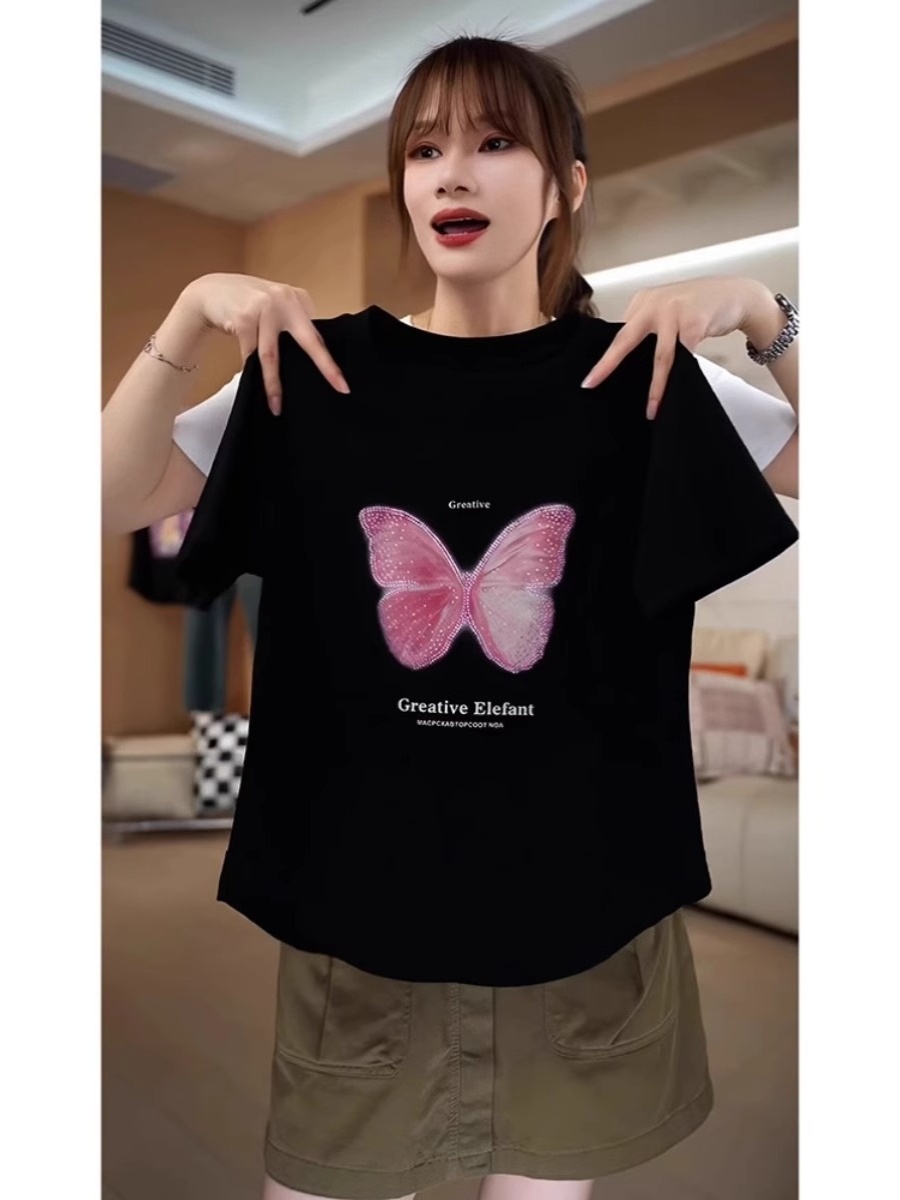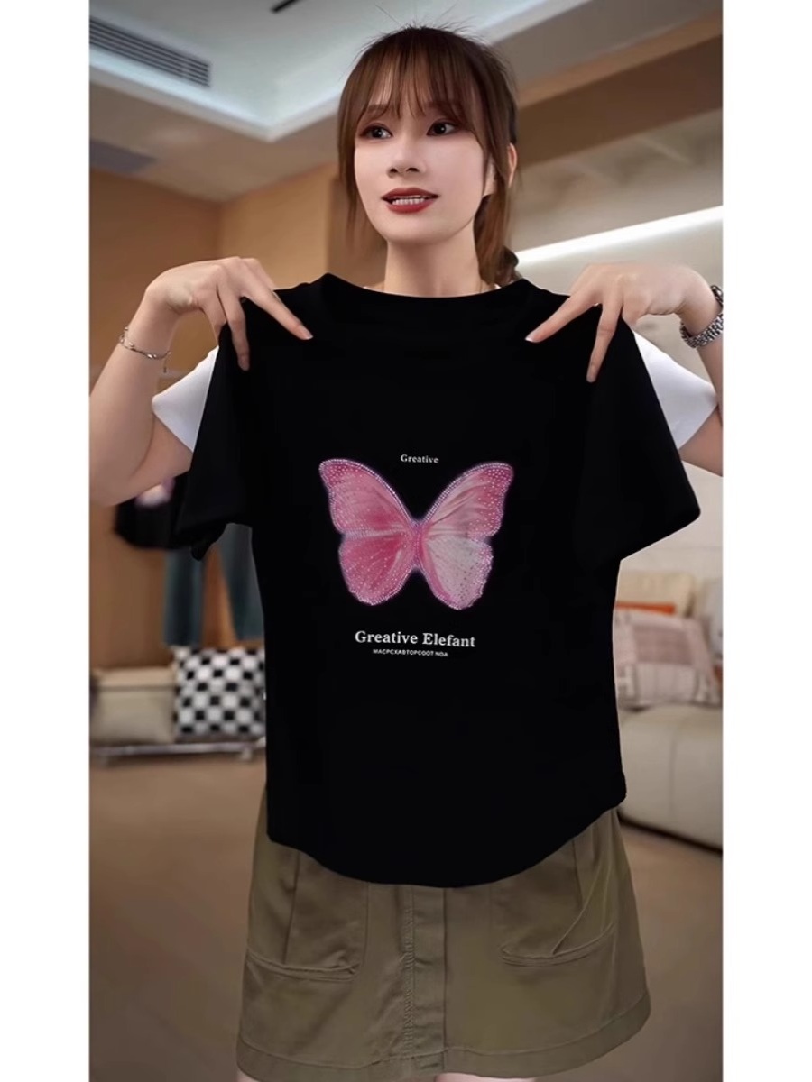 Black round Neck Short Sleeve T-shirt Female 2025 Summer New Design Sense Butterfly Print Loose Slim Fit Versatile Top