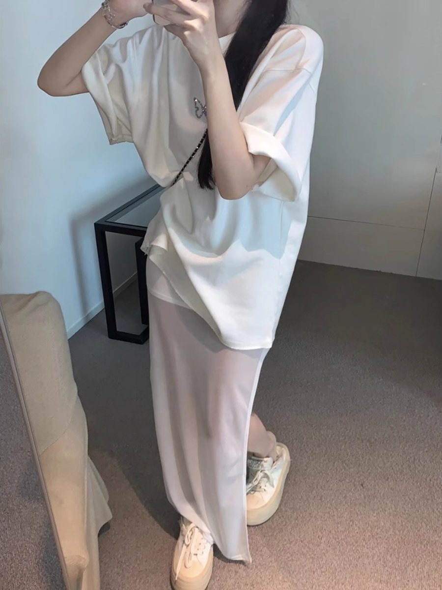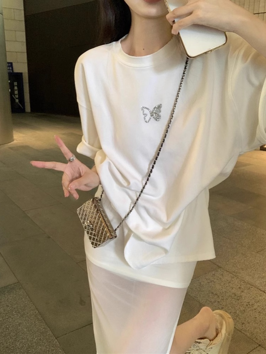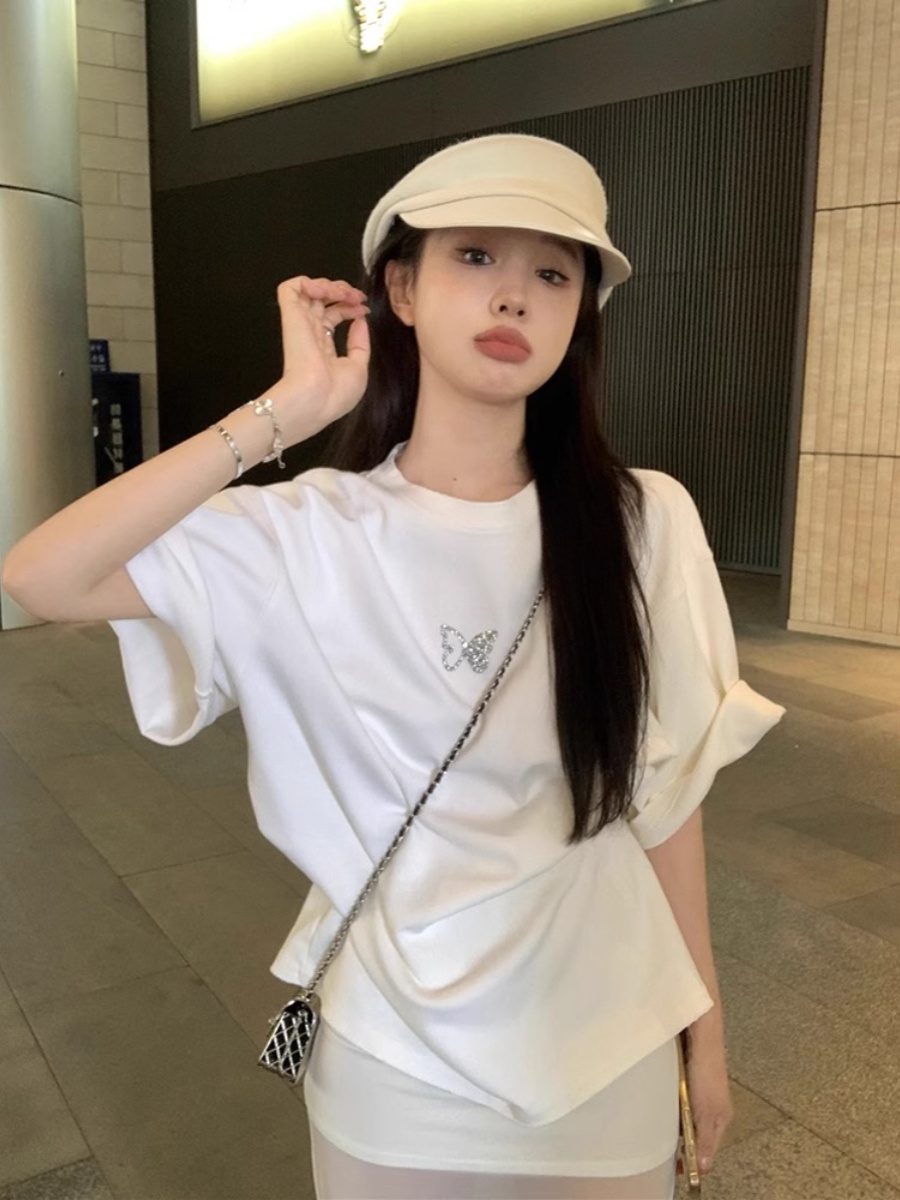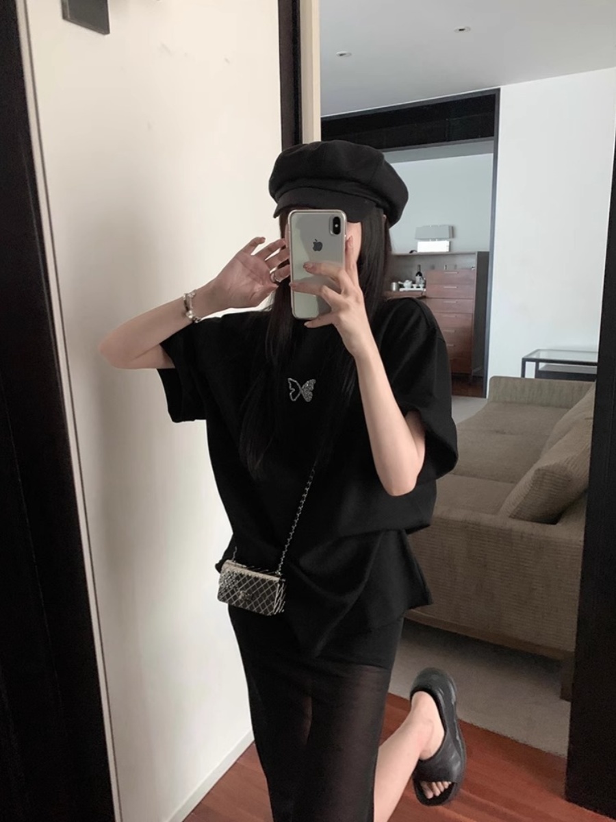 Black round Neck Short Sleeve T-shirt for Women Summer New Stylish Niche Style Butterfly round Neck Loose Mid Length Long Length Shoulder Tops