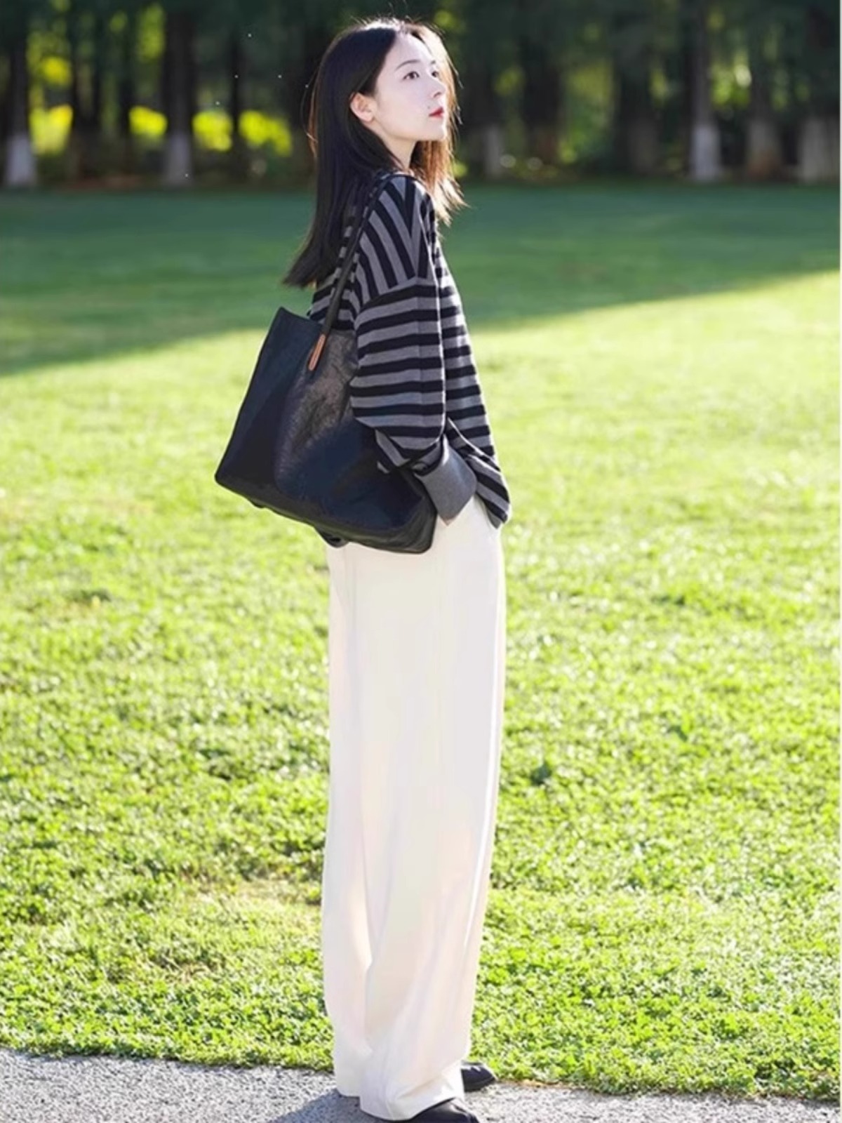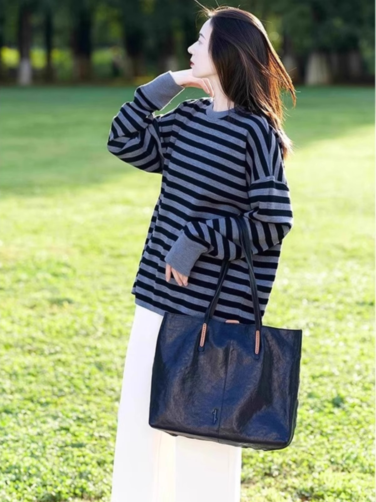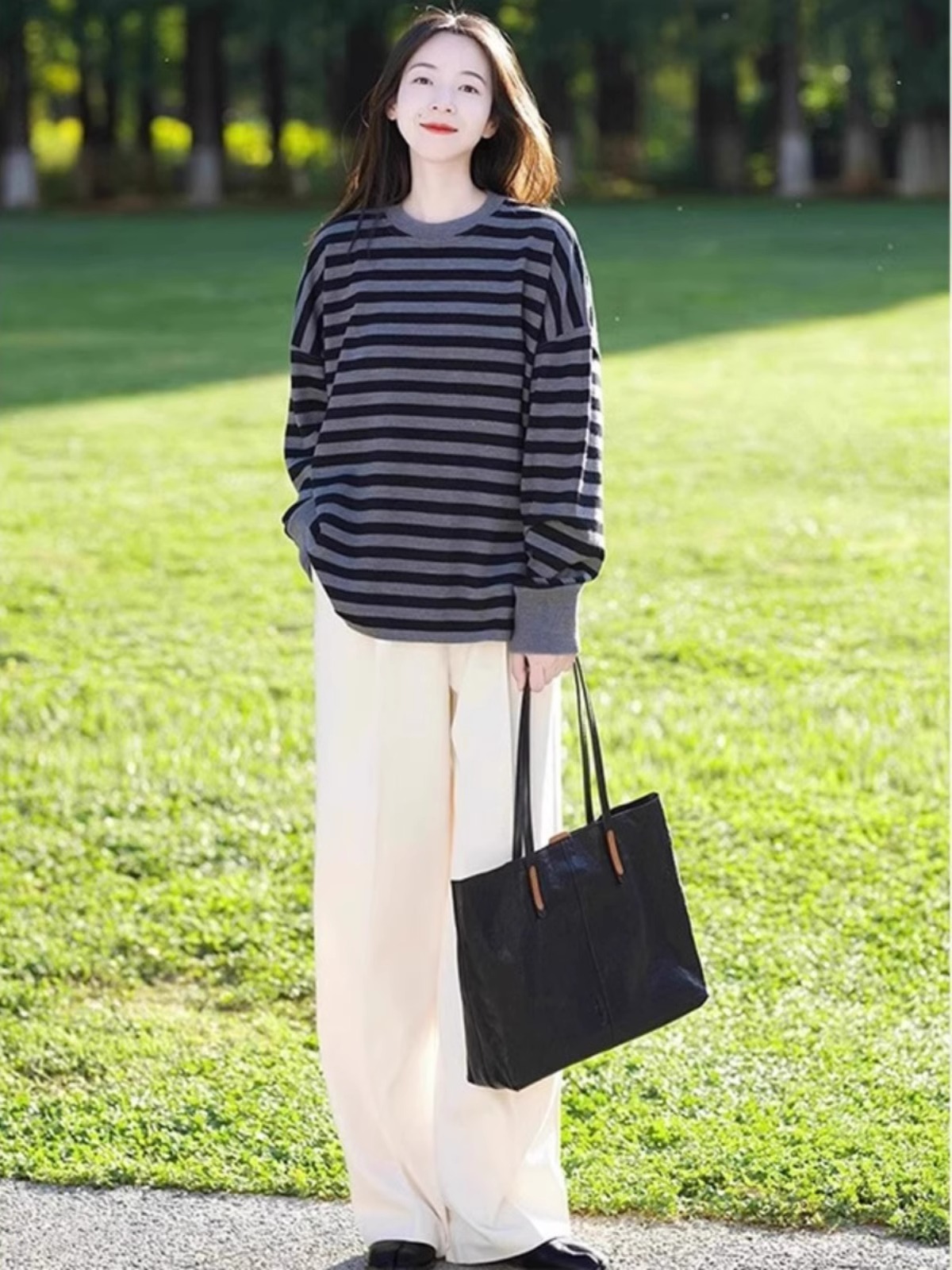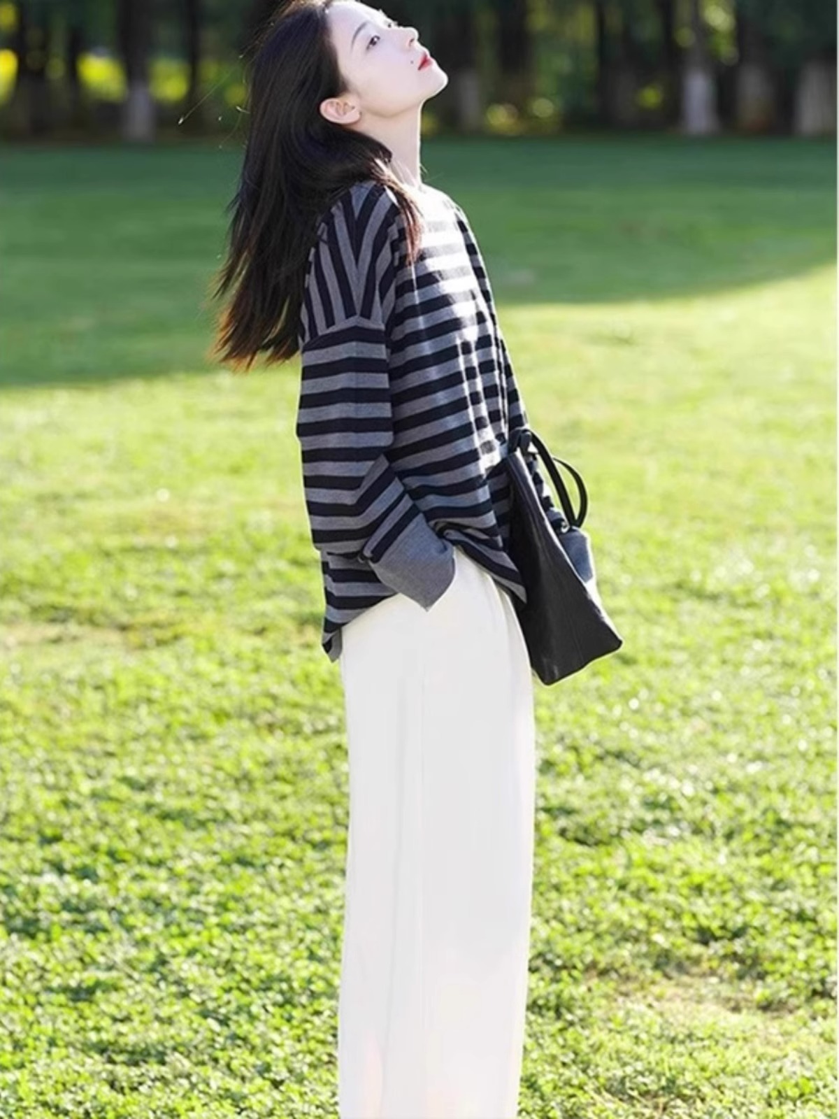 Black Stripes Long Sleeve Sweater T-shirt Female Early Autumn 2025 New Arrival European Goods Large Version Loose Western Style Lazy Style Top