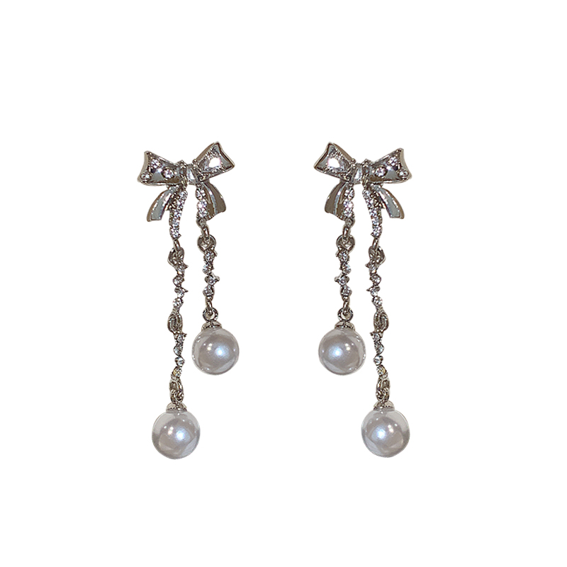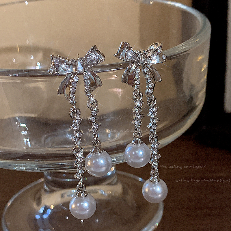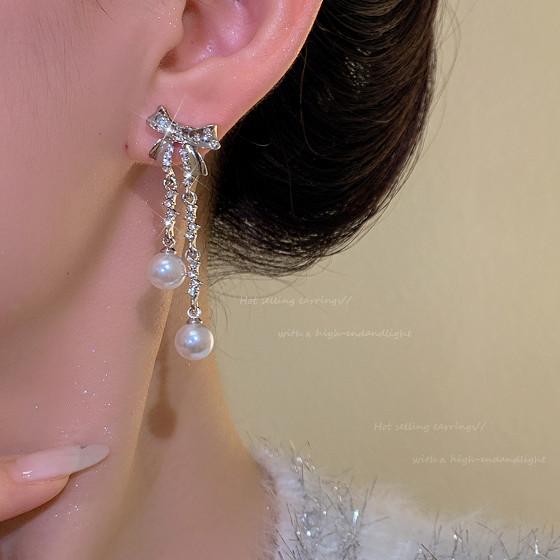 Bows Pearl Tassel Earrings Female 2024 New Arrival Fancy Pure Desire Rhinestone Ear Stud Earring Graceful Earrings